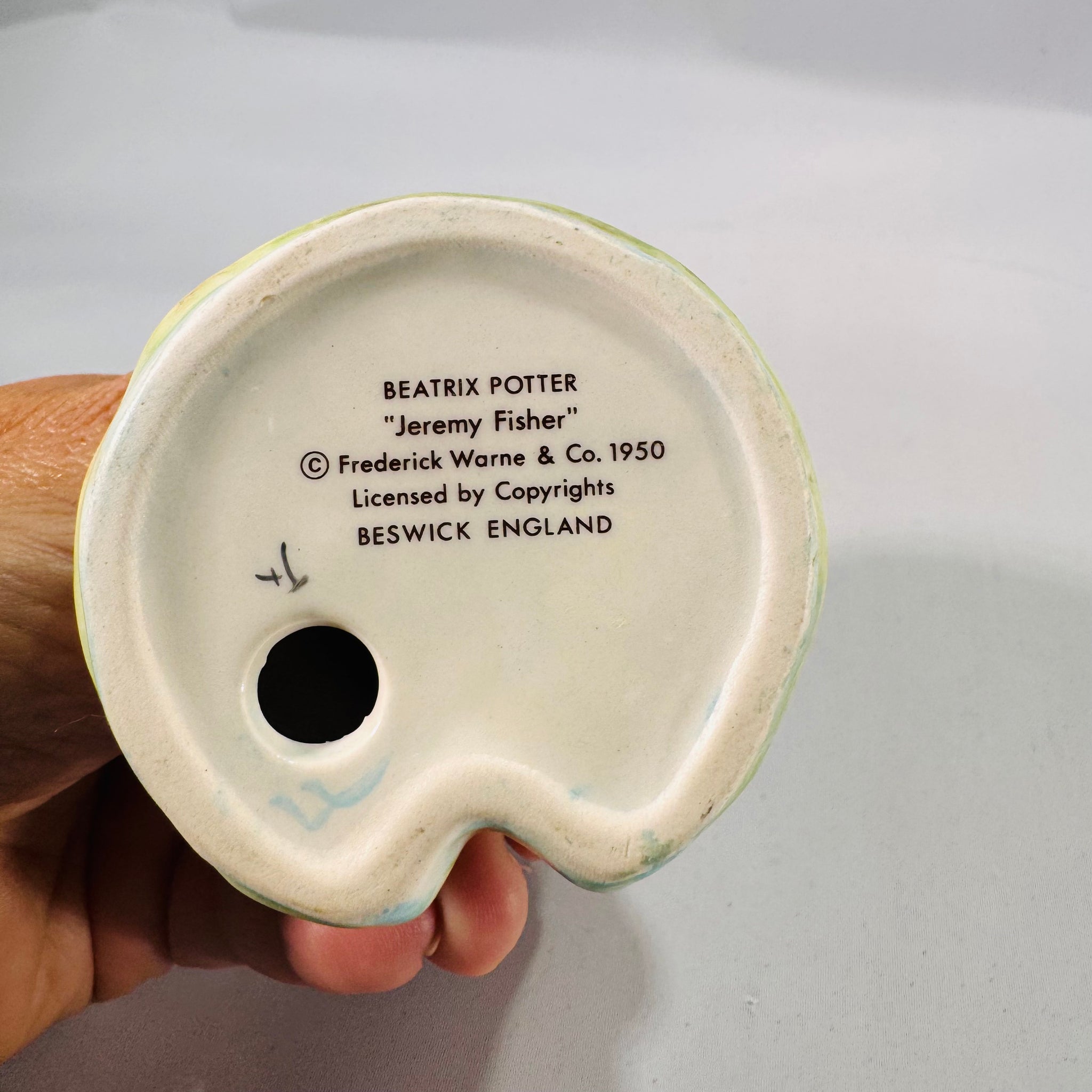 ∙ Maker/Mark: Beswick England; underside printed “Beatrix Potter ‘Jeremy Fisher’ © Frederick Warne & Co. 1950 – Licensed by Copyrights – Beswick England.”