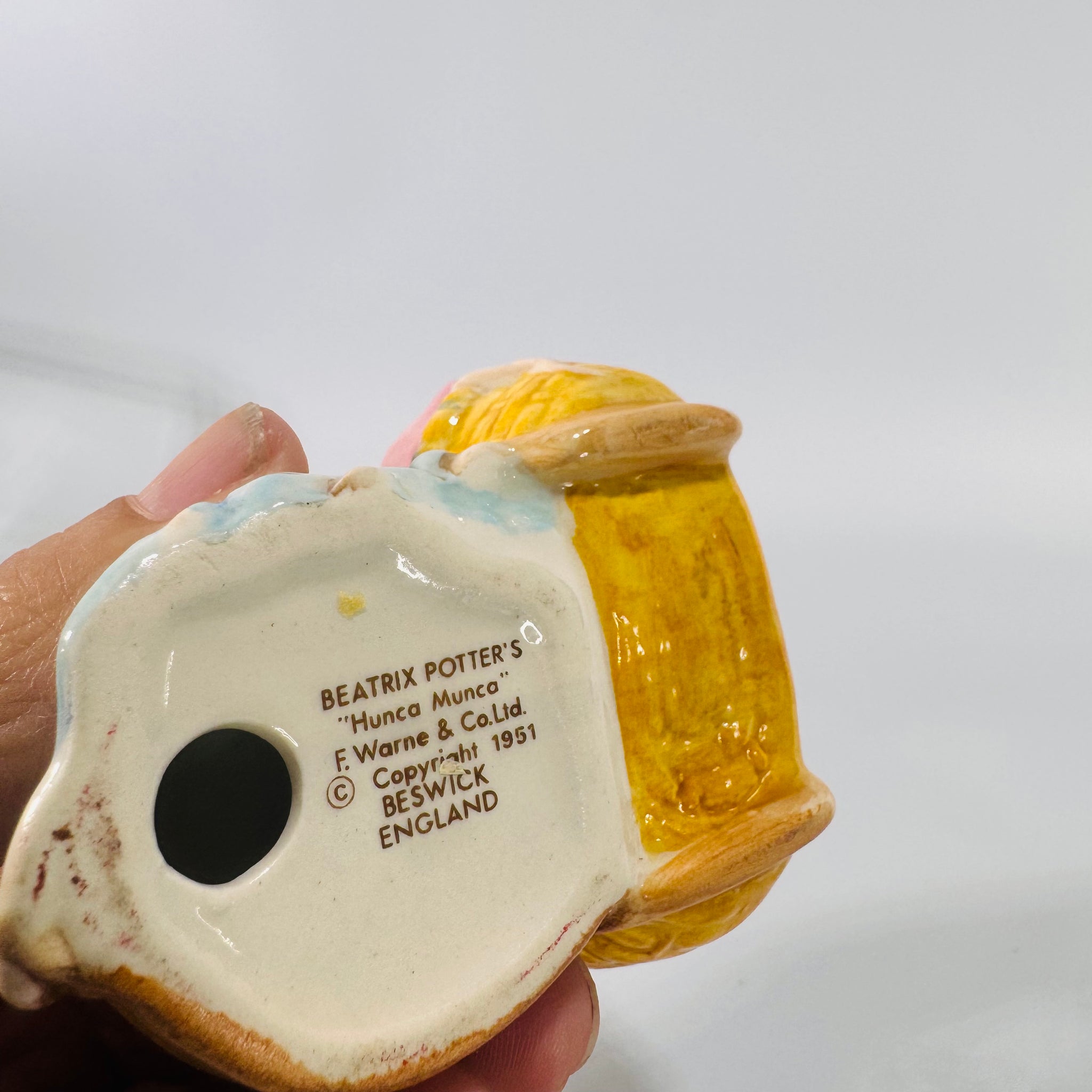 • Identifiers: Base backstamp reads “BEATRIX POTTER’S ‘Hunca Munca’ / F. Warne & Co. Ltd / © Copyright 1951 / BESWICK ENGLAND.” Vent hole present.