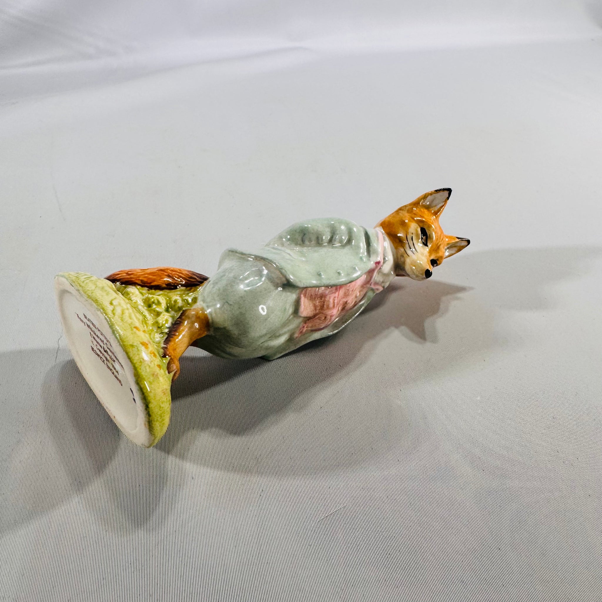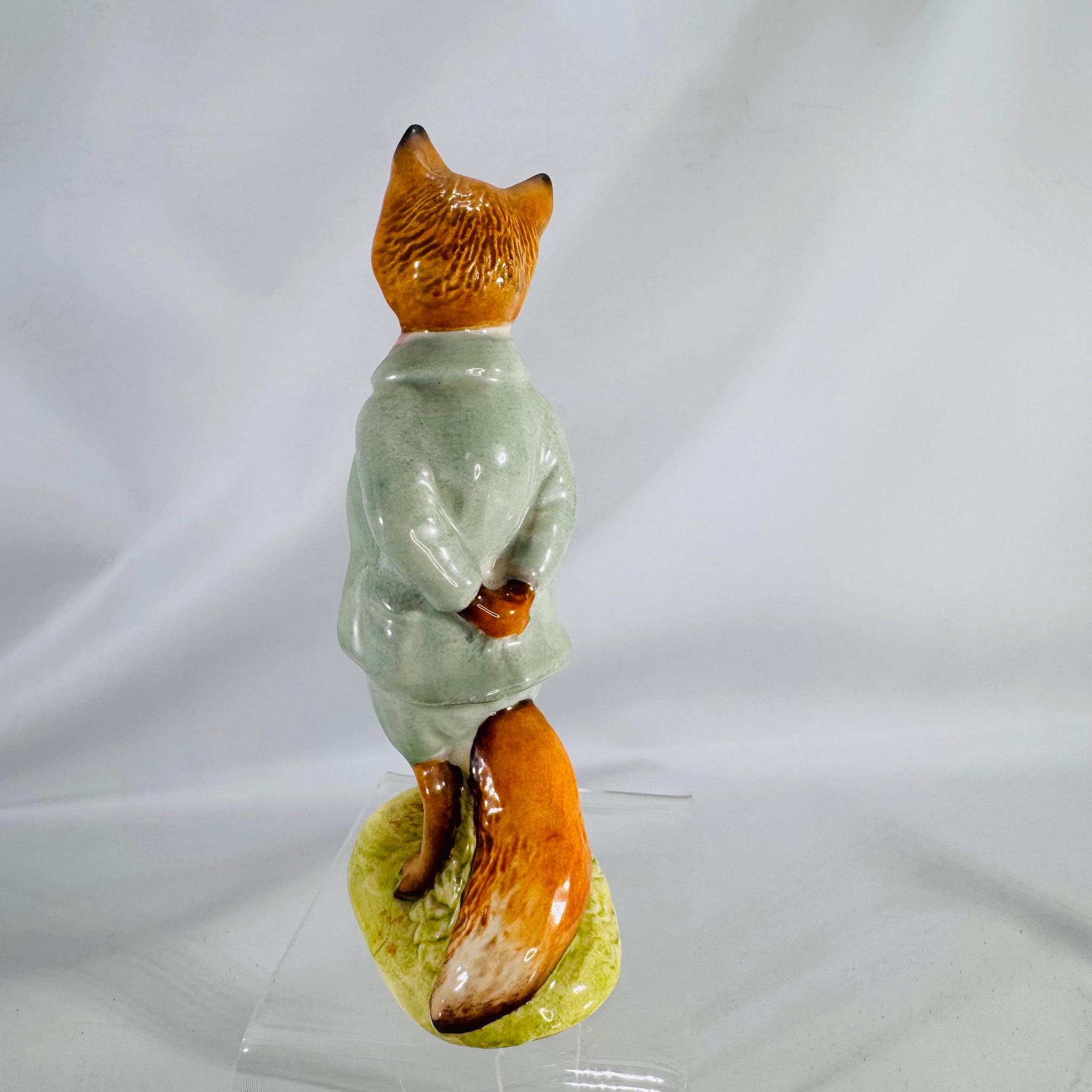 A classic Beatrix Potter character modeled by Beswick, Foxy Whiskered Gentleman stands with paws behind his back in a sage green coat, pink waistcoat, and neatly curled tail.