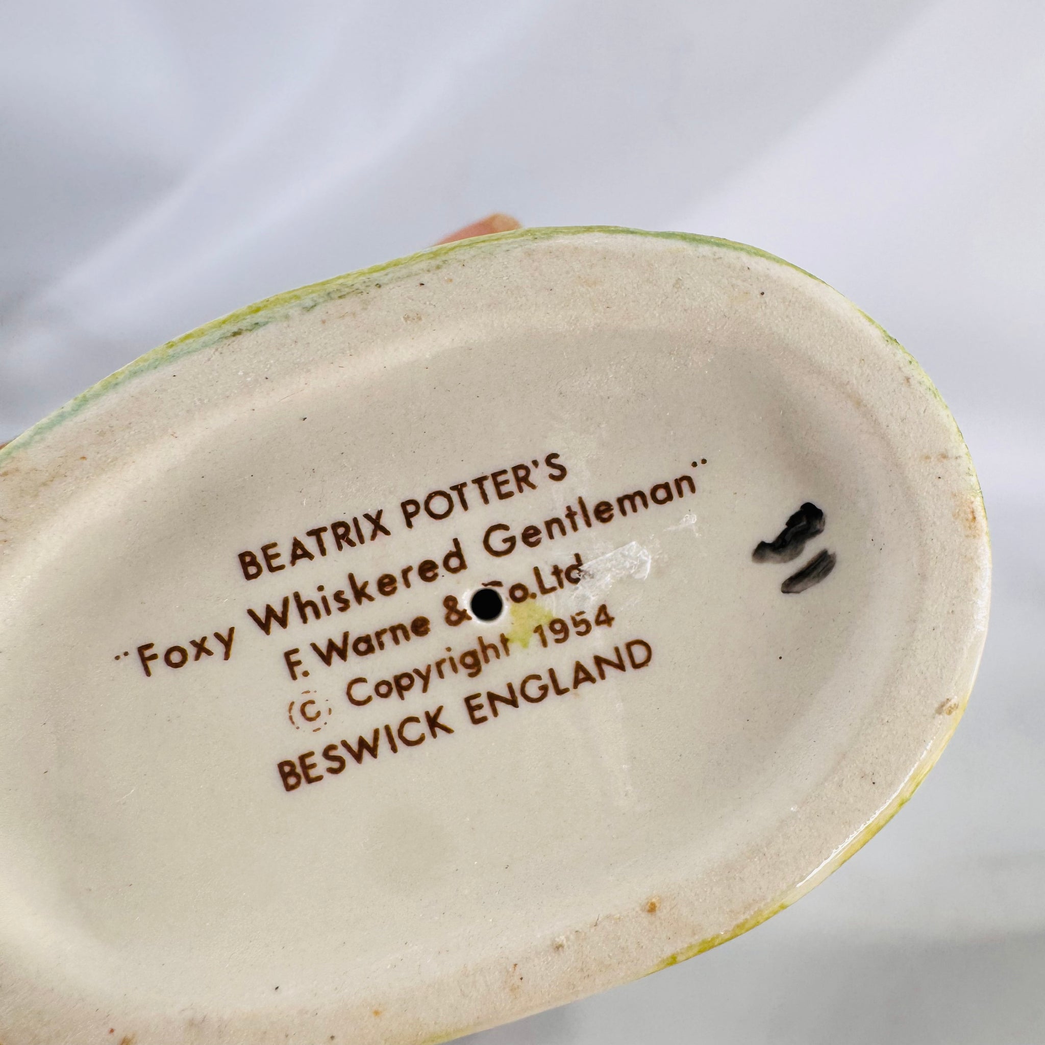 This mid-century example carries the brown BESWICK ENGLAND base mark with F. Warne & Co. Ltd © 1954 copyright—typical for Beswick’s original Beatrix Potter series.
