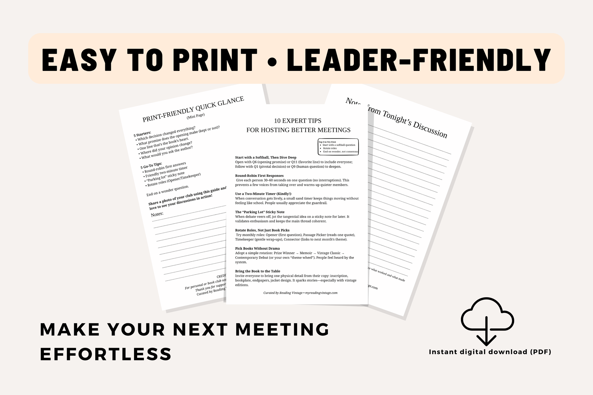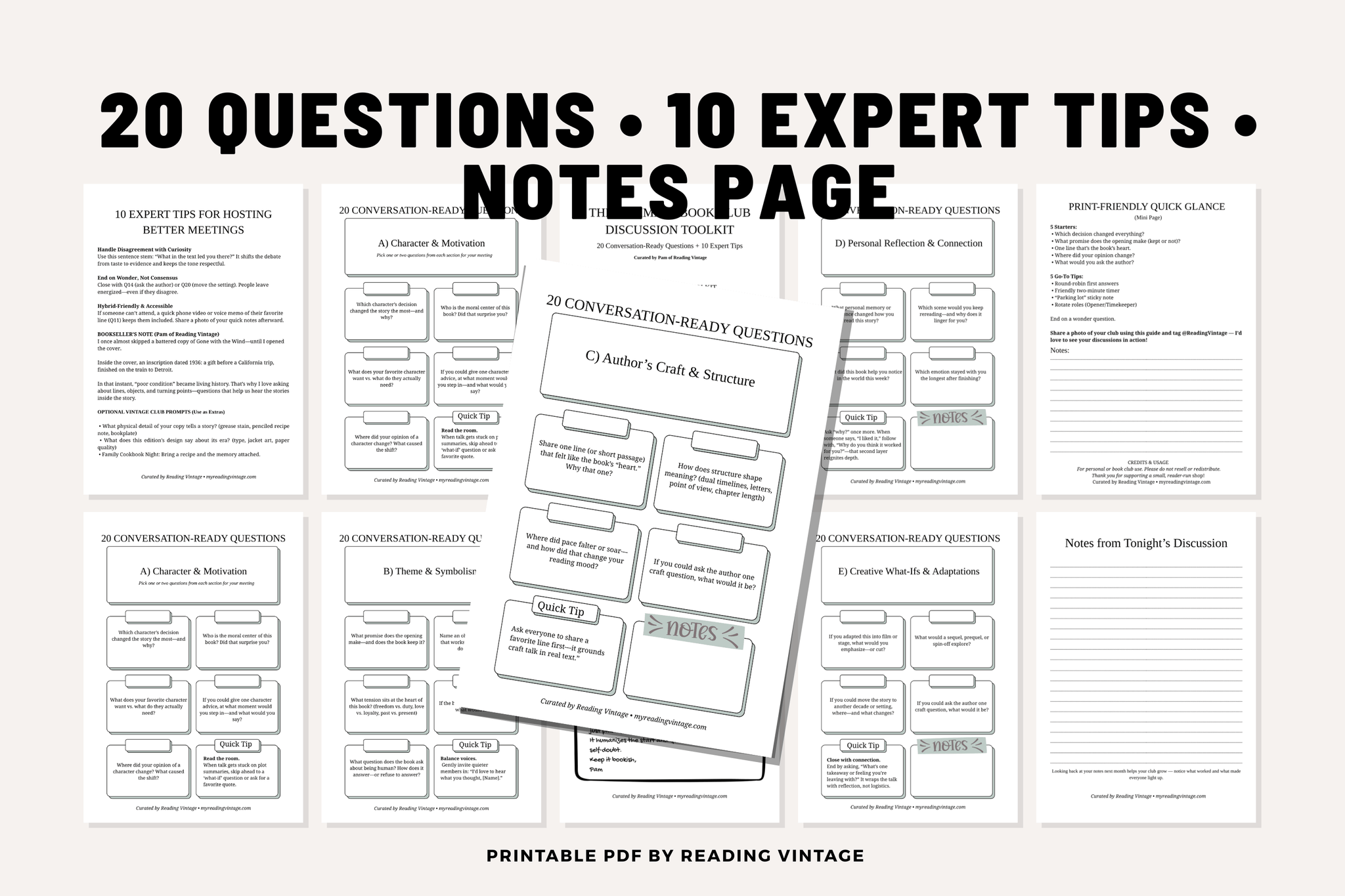 Keep your book club flowing: 20 conversation-ready questions, 10 expert tips, and a notes page—printable PDF, curated by Reading Vintage.