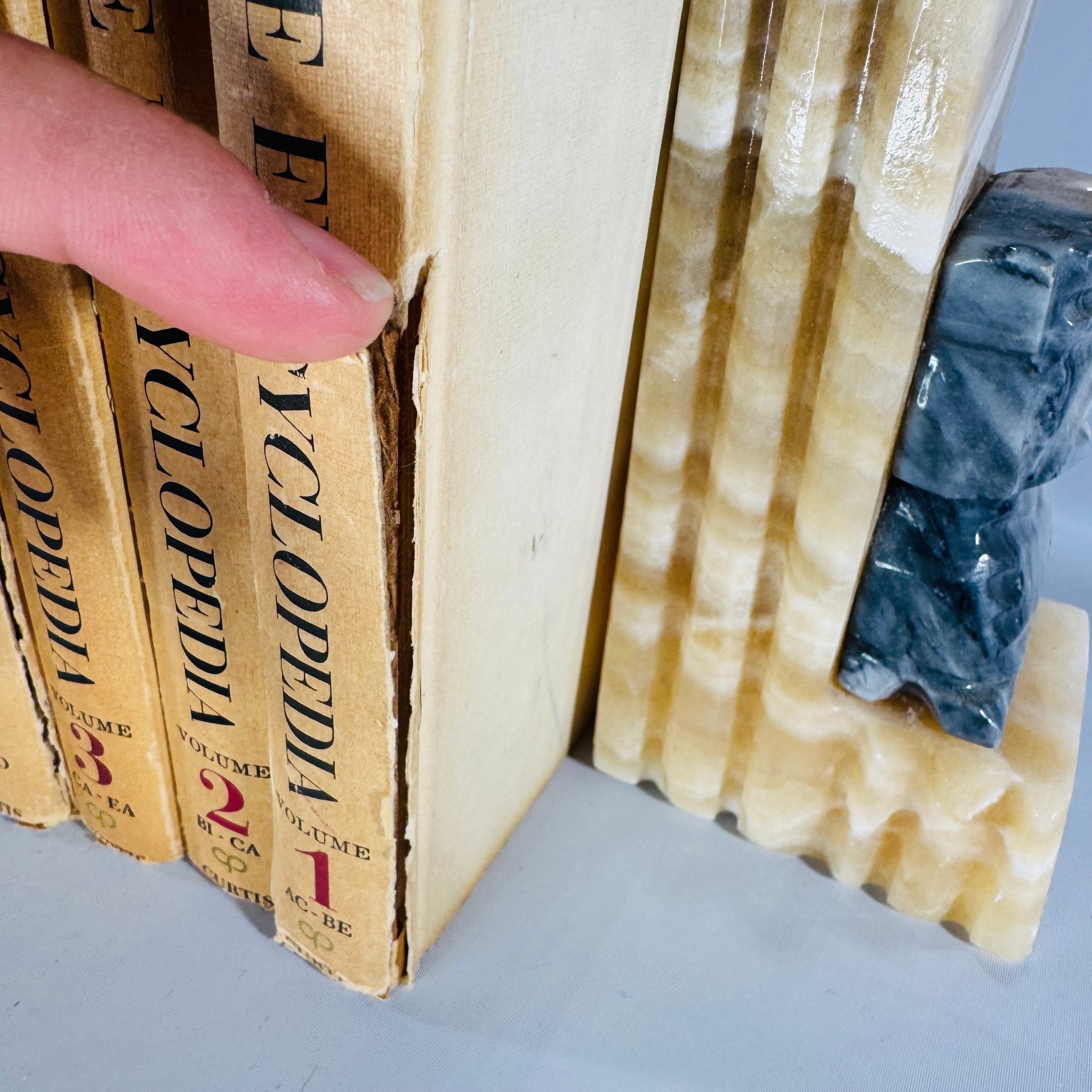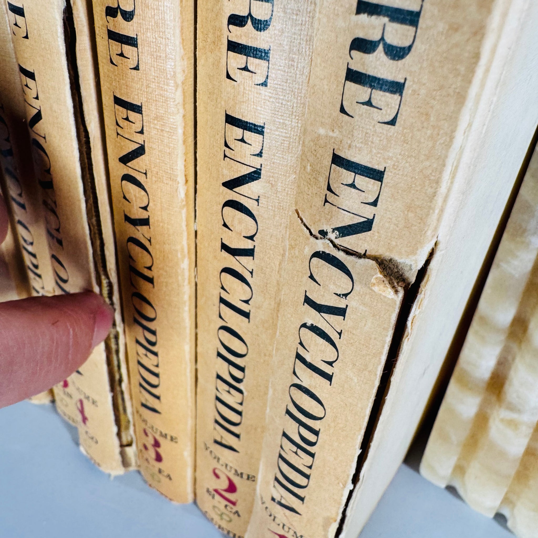 Notes: This is a loved, working reference set with heavy exterior wear. Many volumes show torn/split spine coverings, chipping at edges, rubbing, and visible age toning; one volume shows a noticeable tear along the spine area (see photos). Boards show surface soiling/spotting in places. Interiors appear clean and readable on the pages shown, with strong image reproduction.