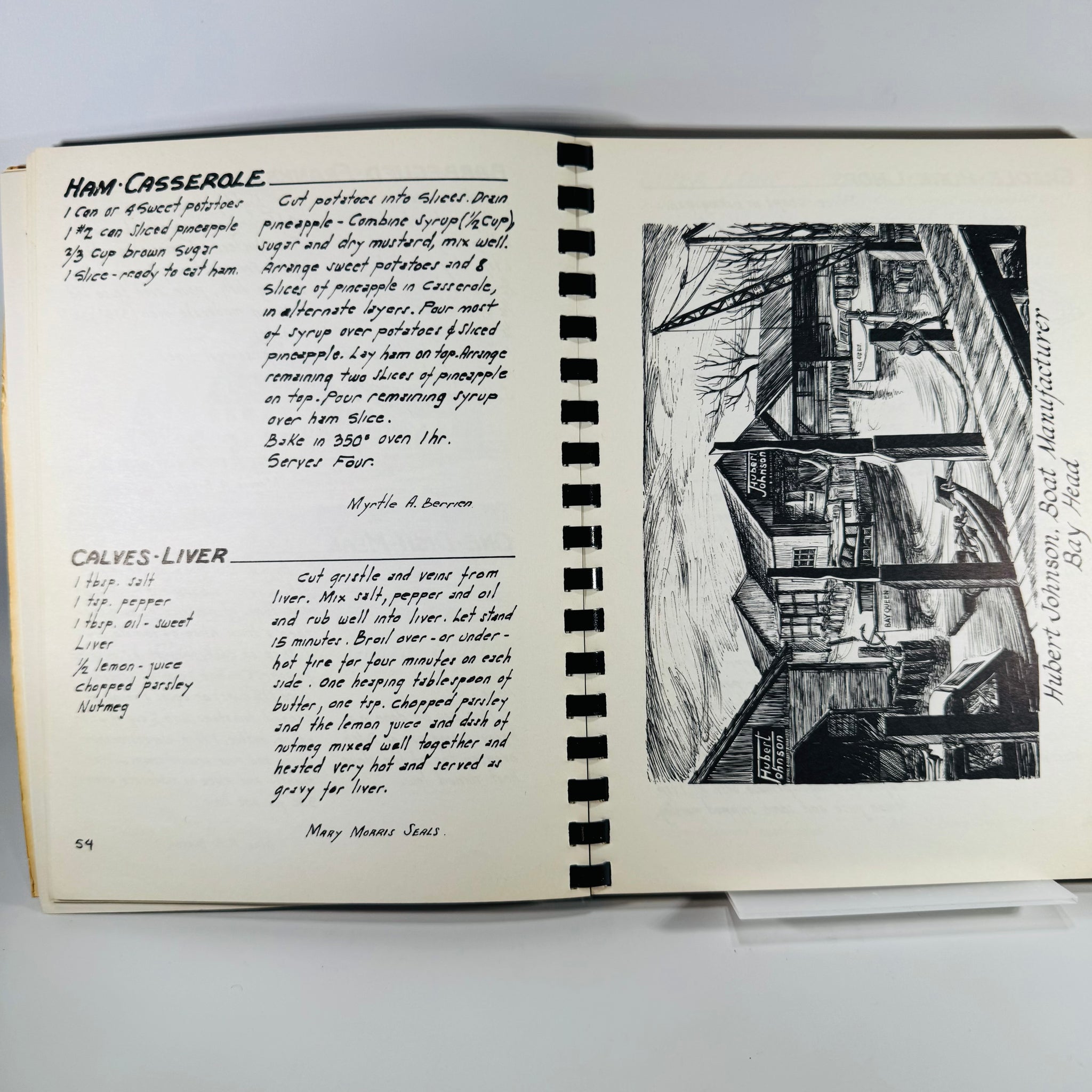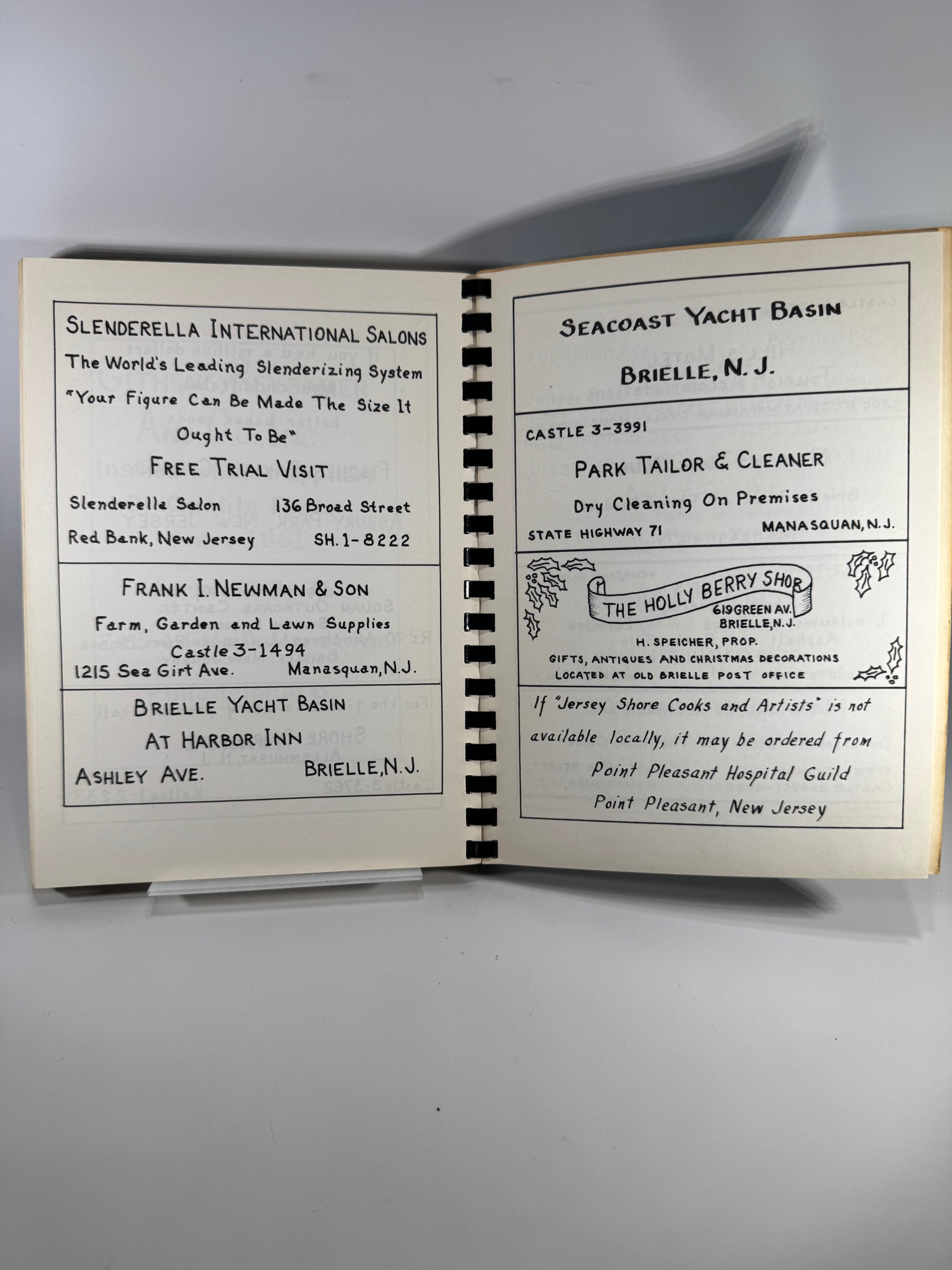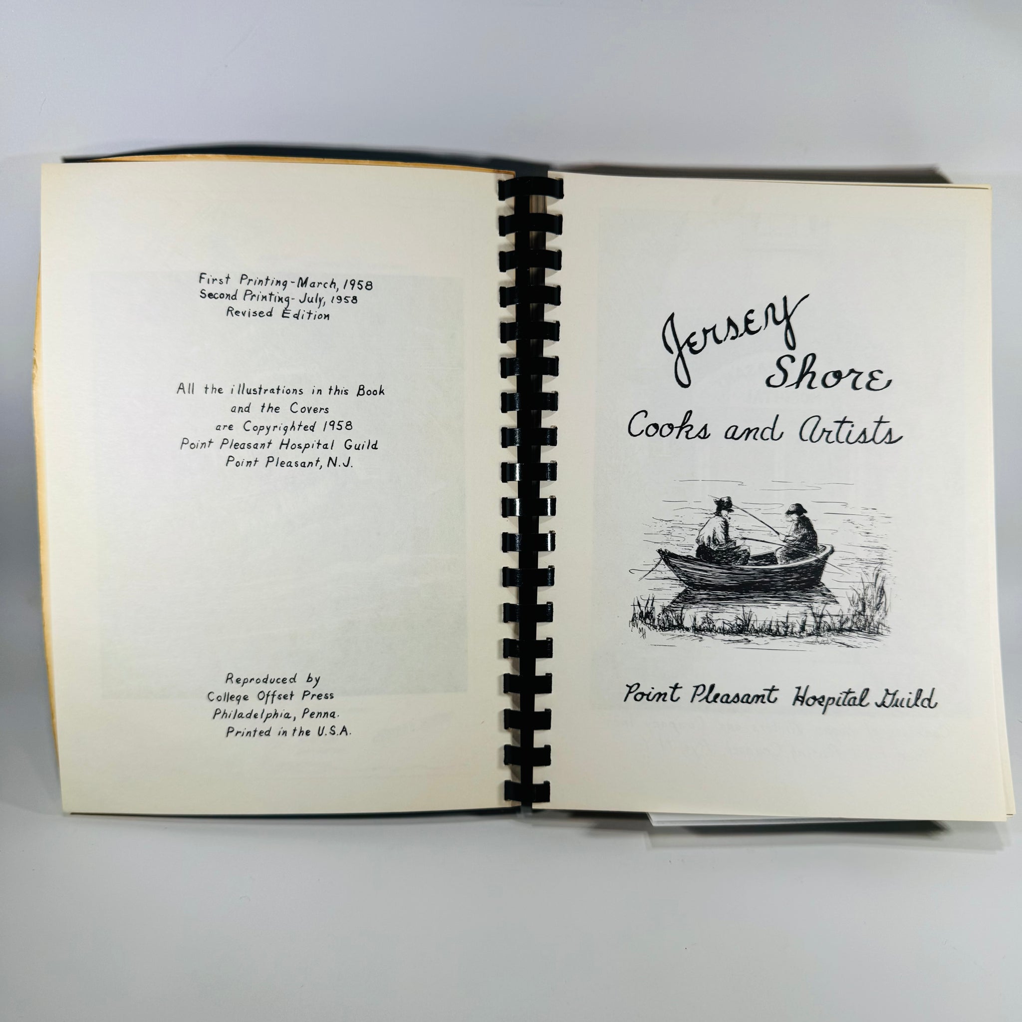 Produced to benefit the Point Pleasant Hospital Guild. Antiquarian listings describe this title as a scarce first-edition style community cookbook with recipes by local residents, illustrations by local artists, and period advertisements that capture 1950s Jersey Shore commerce.