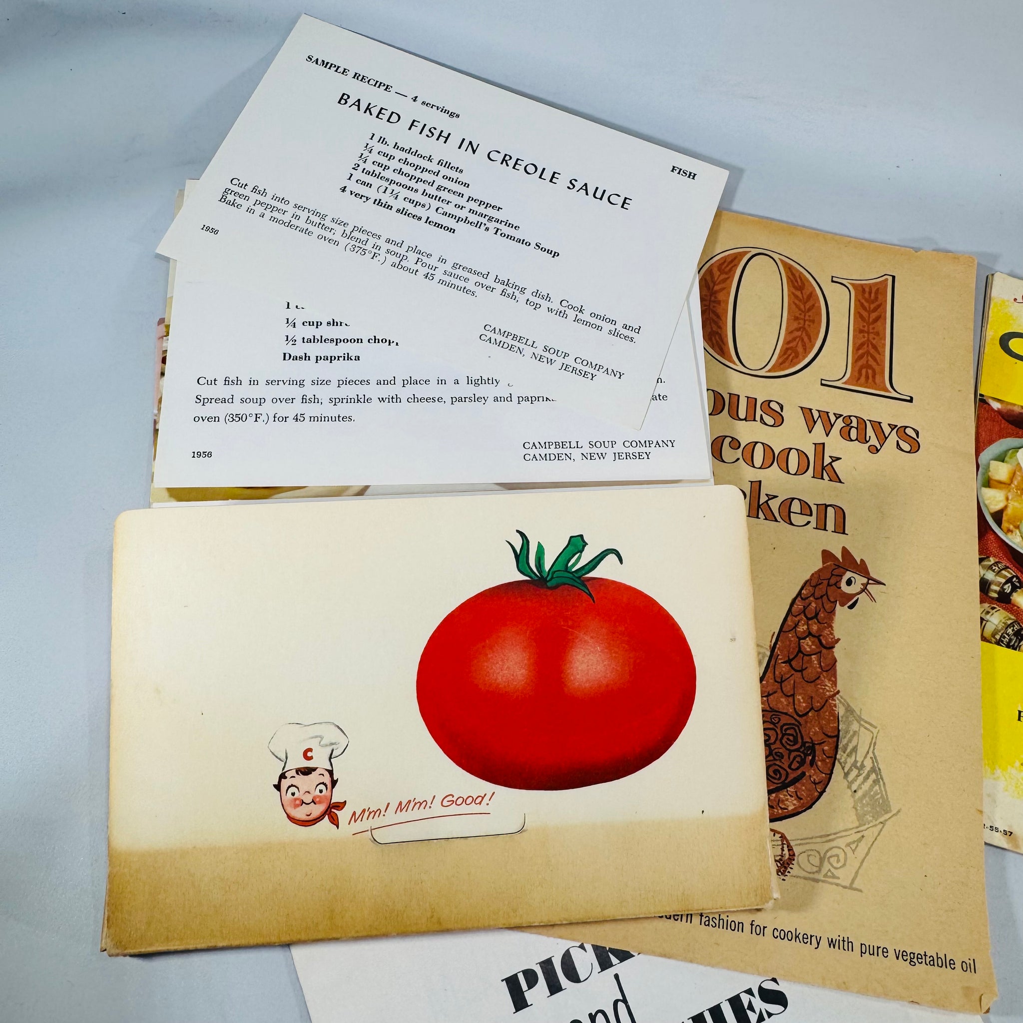 Extras: Campbell’s Recipes for Quantity Food Service card set (1958 on sample card); Hamilton Beach Mixette Model 70 instruction/recipe booklet; “Let’s Eat Outdoors” entertaining pamphlet