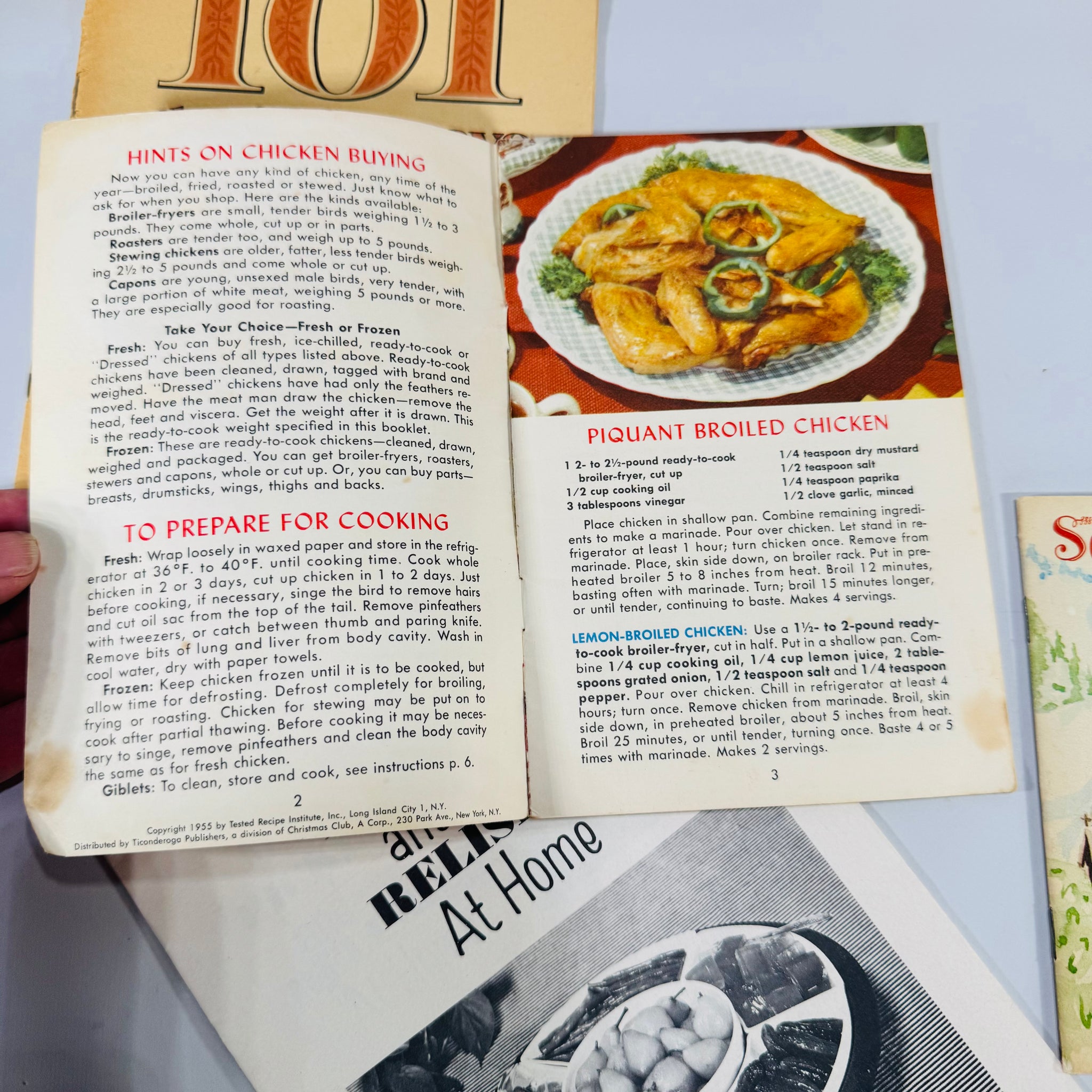 Expect illustrated recipes, ads, and practical home-economy tips plus one outdoor entertaining booklet and a USDA Making Pickles and Relishes at Home guide. Photo-verified set; each piece shows its era and is ready to display or use gently.