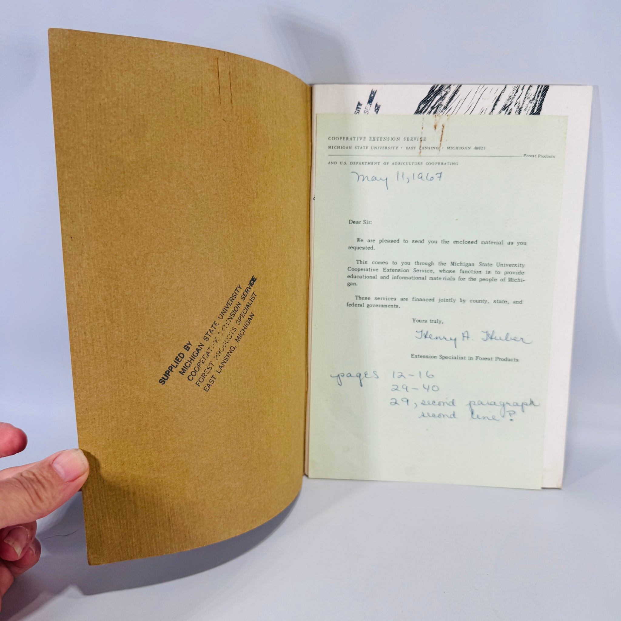 Tight binding and clean pages. Minor edge wear to cover, typical of age. Several “Supplied by Michigan State University” stamps throughout remain legible. Includes an inserted letter dated May 11, 1967 from Henry A. Huber, Extension Specialist in Forest Products.