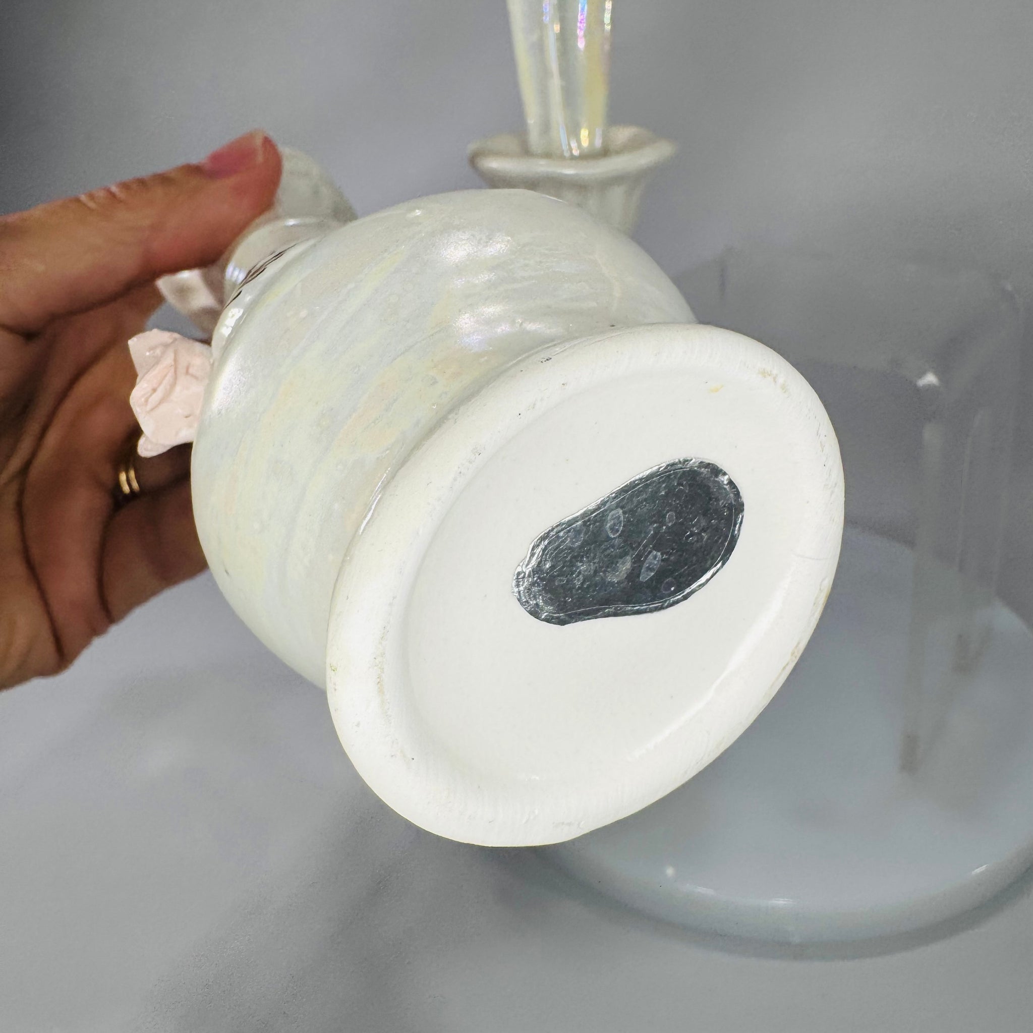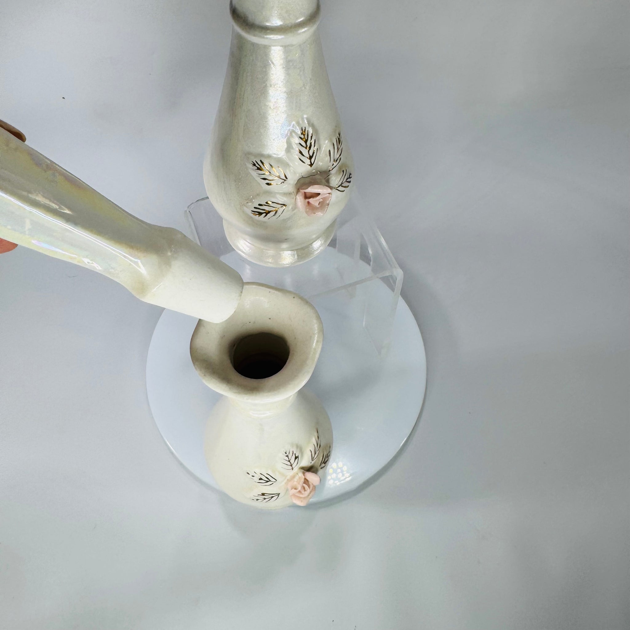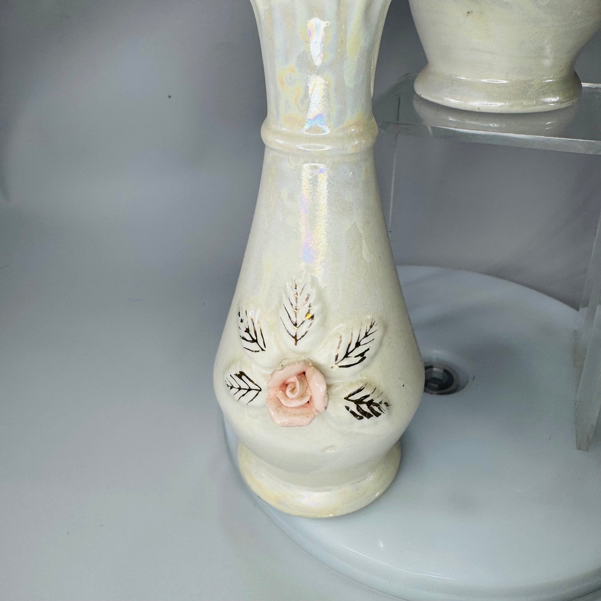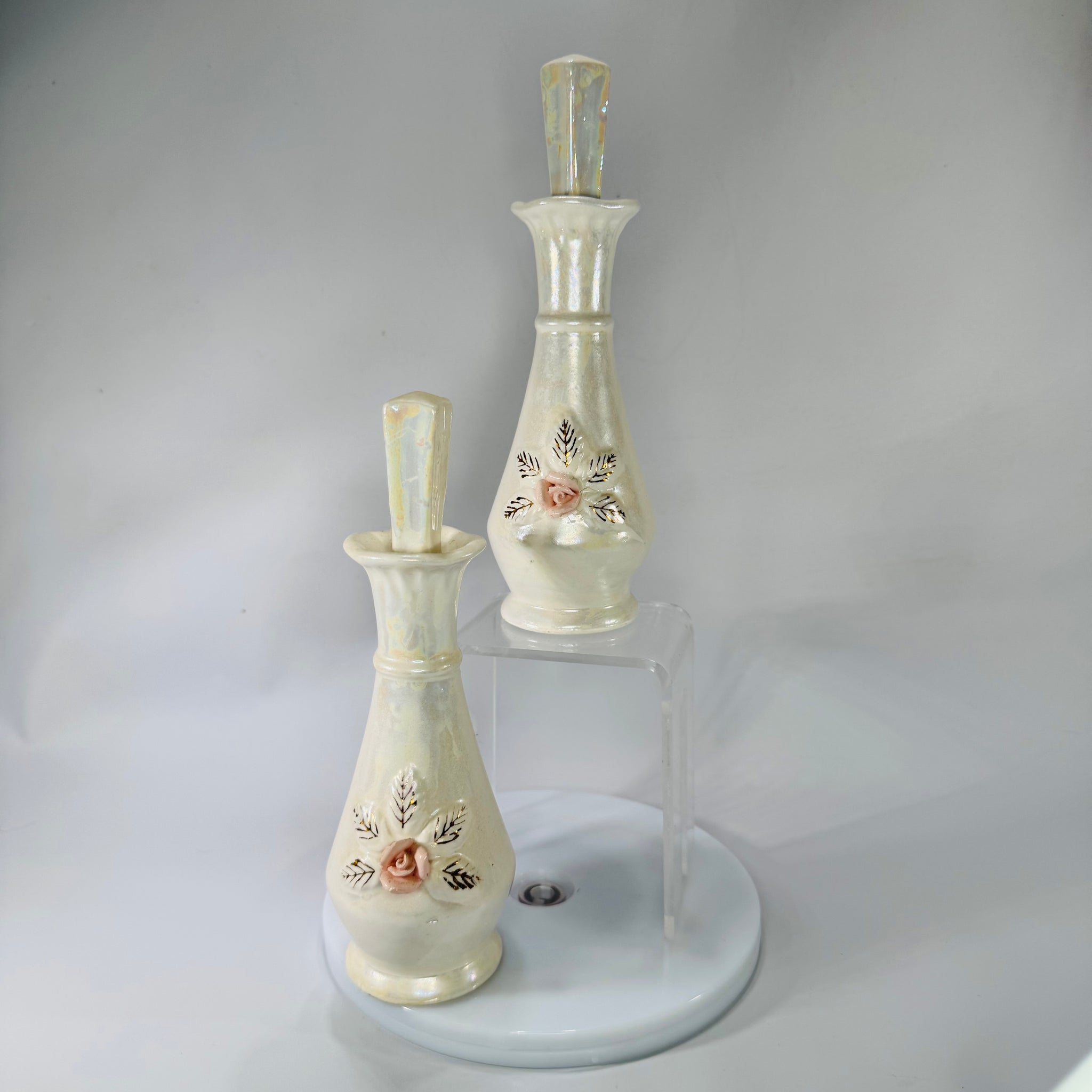 Romantic vintage vanity vibes in one sweet set. These Nasco Japan porcelain perfume bottles have a soft iridescent/pearlescent glaze, raised pink rose appliqués, and delicate gold leaf accents—finished with matching fitted stoppers. Perfect for adding that collected, feminine touch to a dresser tray, powder room shelf, or cottagecore vignette.