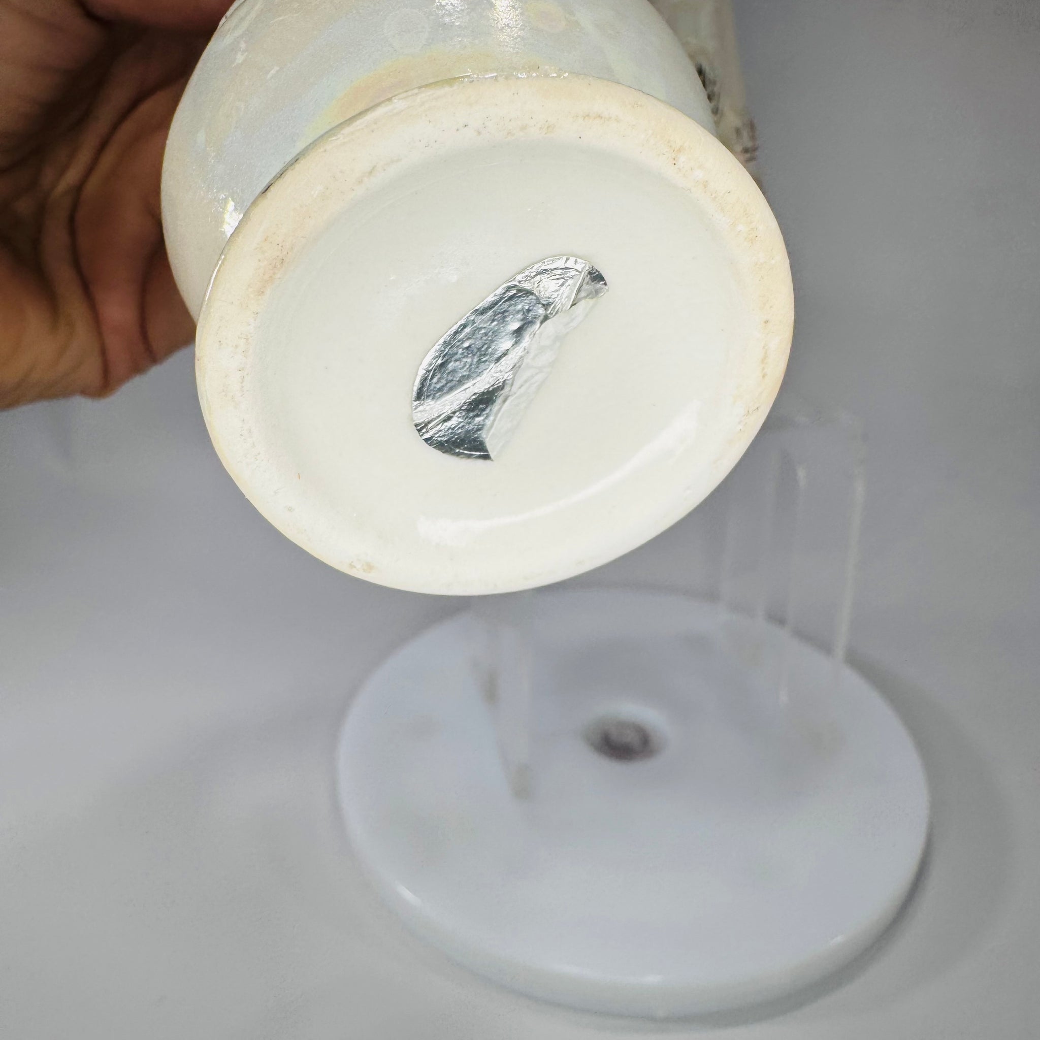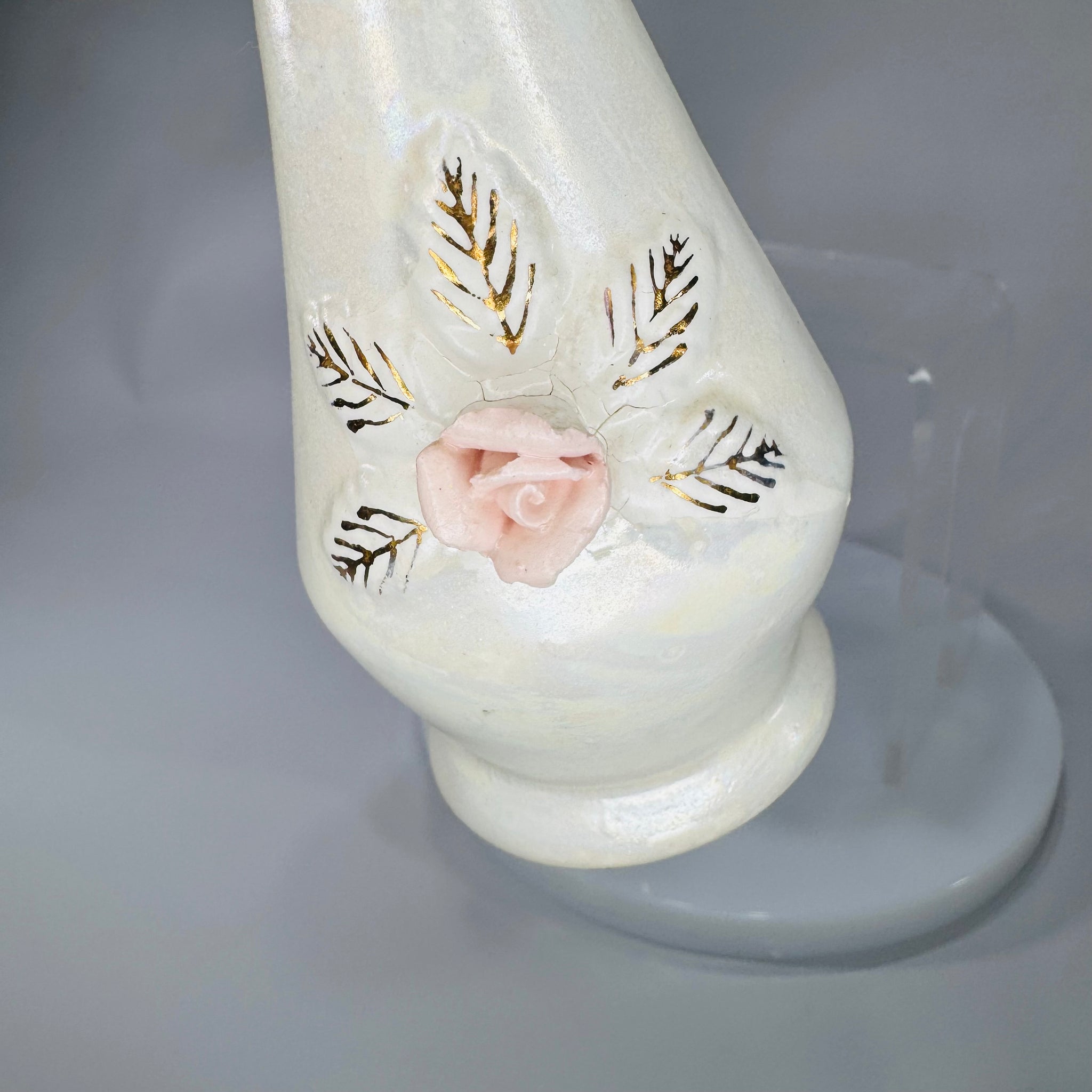 Vintage condition with honest age character. Light surface wear and scuffs, some gold wear, and visible glaze crazing/hairline crackling around the floral appliqué (seen in close-ups). Base shows old sticker residue. No major chips or breaks observed in photos—please zoom in, as photos are part of the description.