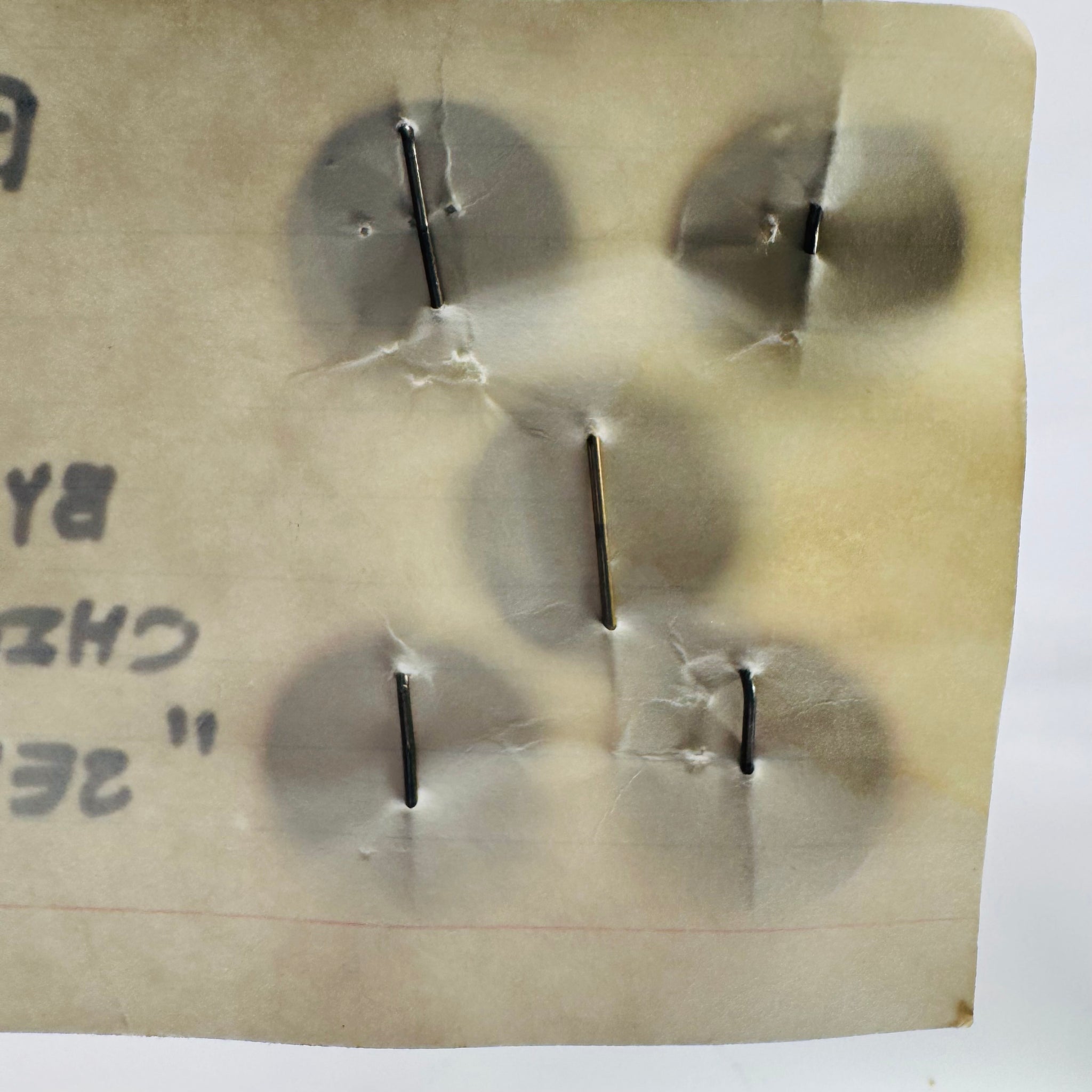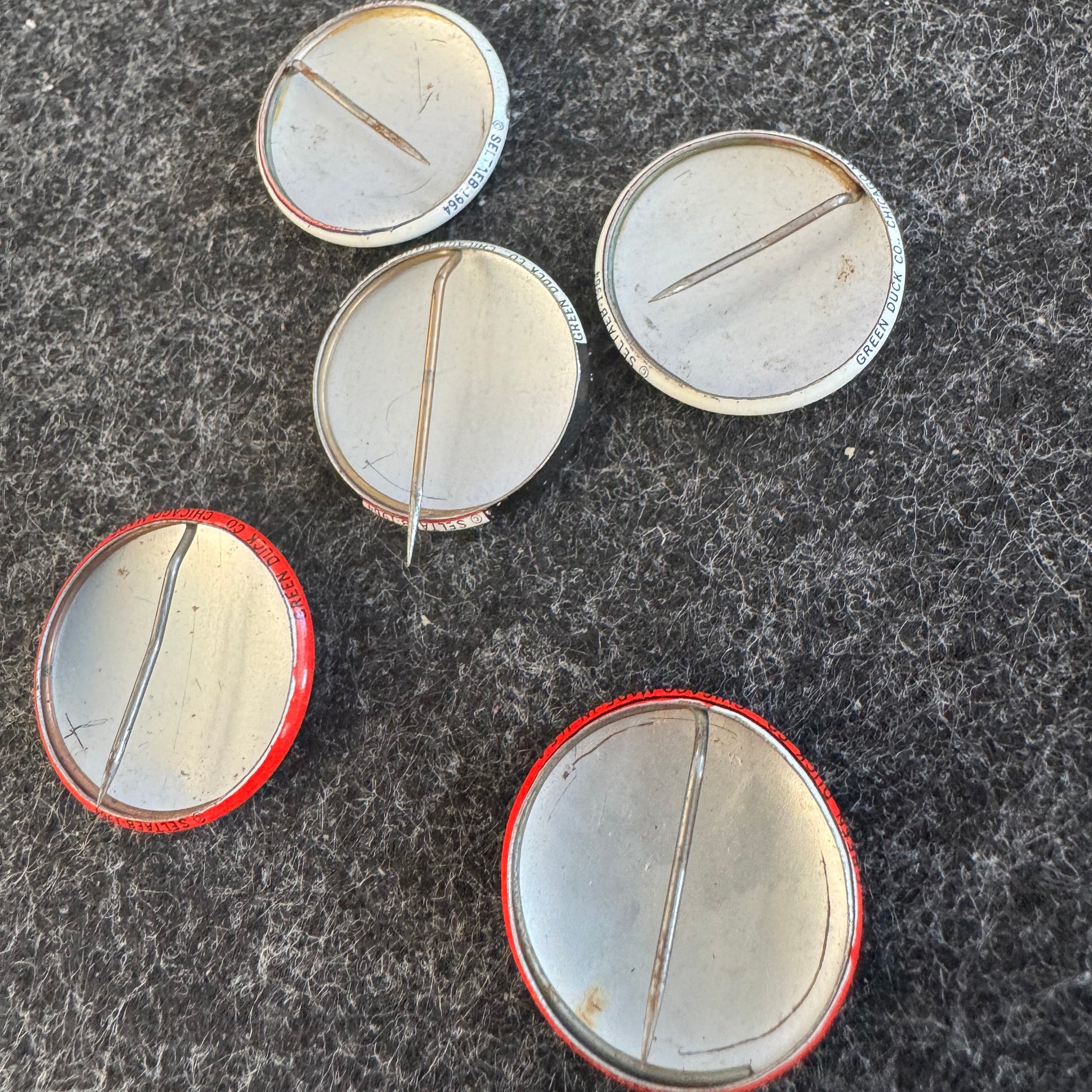 Good vintage condition overall. Pins show surface wear, scuffs, and small paint losses, consistent with age and original use. Backing card shows toning, creasing, and staple impressions, but remains intact and displays well. All pins retain their original posts.