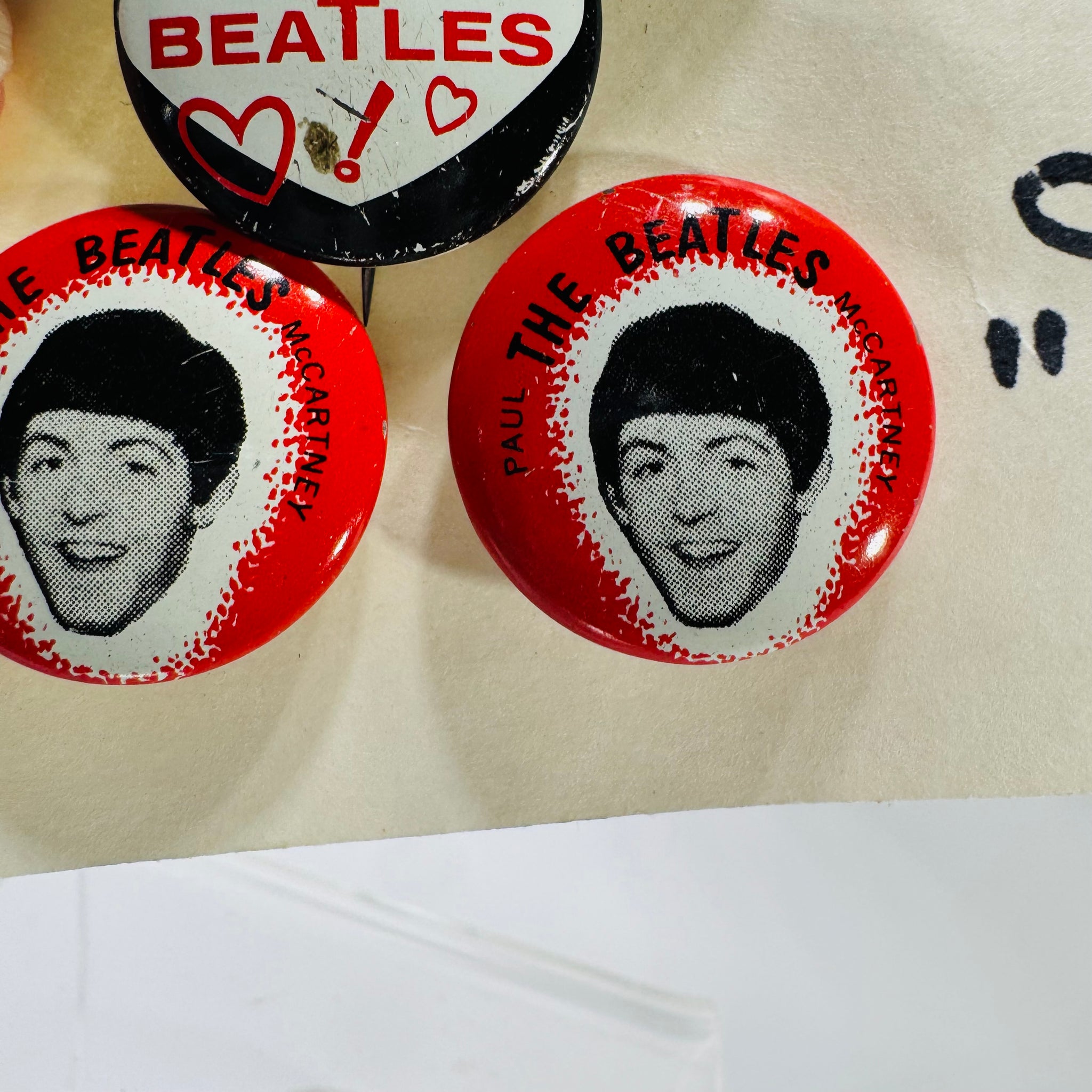 Still mounted on their original display card, these pins capture the excitement and graphic style of early U.S. Beatles fandom. Authentic construction, typography, and wear all align with known Green Duck promotional pins from the era.