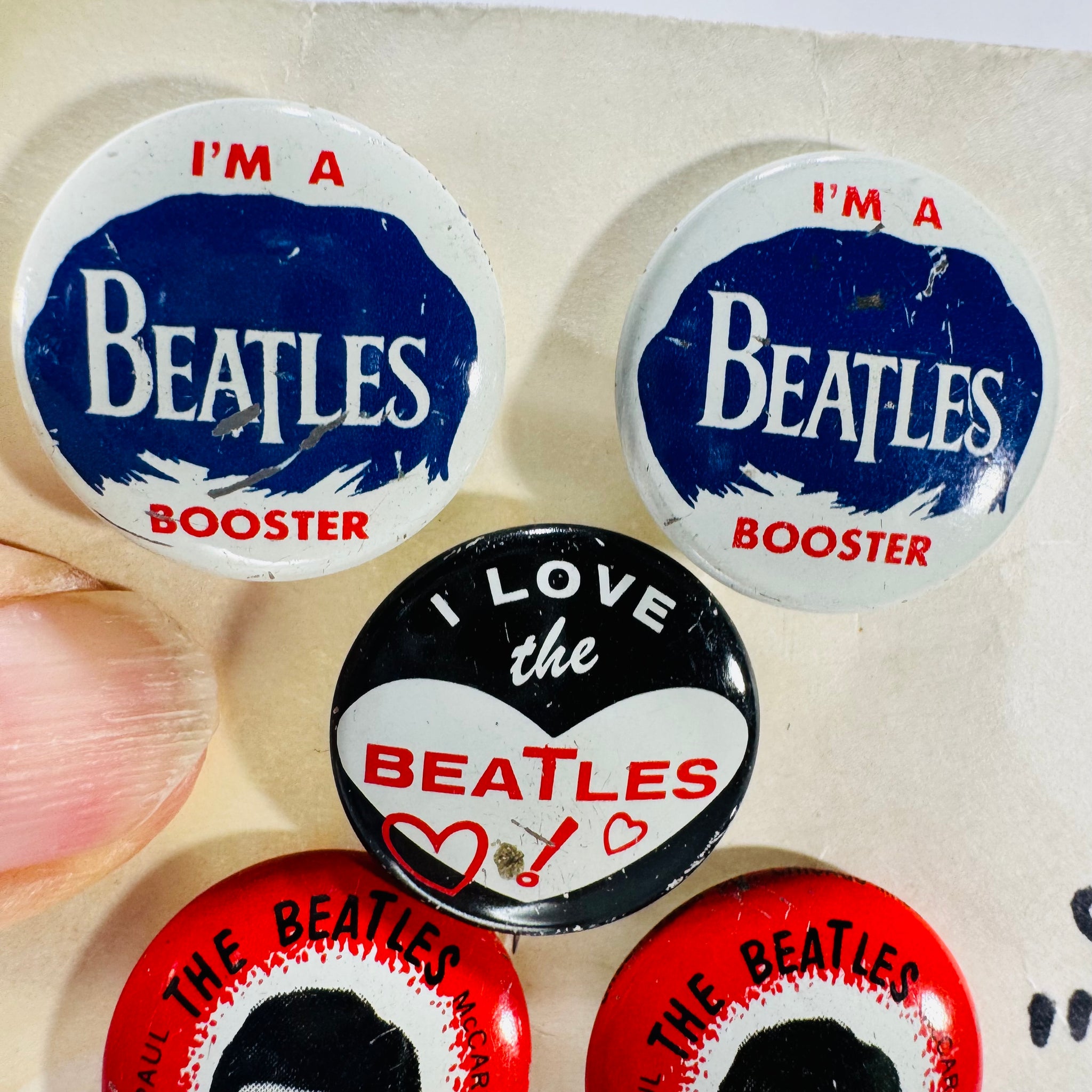 Original 1964 Beatles pinback buttons, produced by Green Duck Co. of Chicago at the height of Beatlemania. This matching set of five 1-inch pins features classic mid-century fan slogans and early Beatles imagery, including “I’m a Beatles Booster,” “I Love the Beatles,” and portrait pins of Paul McCartney.