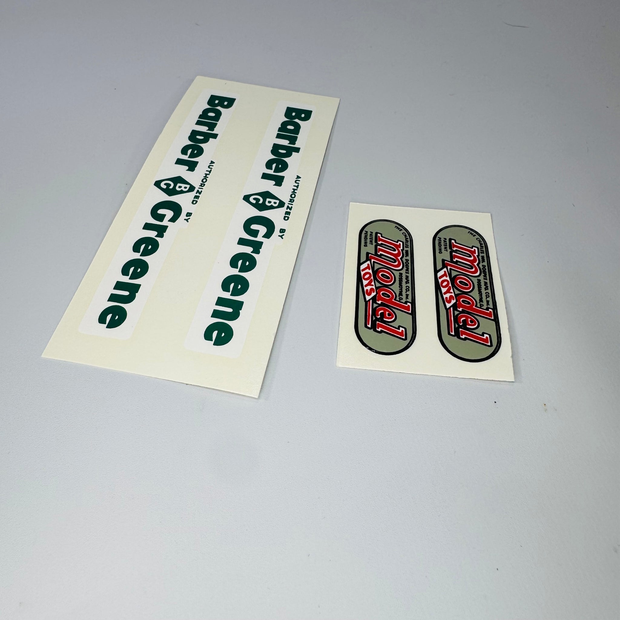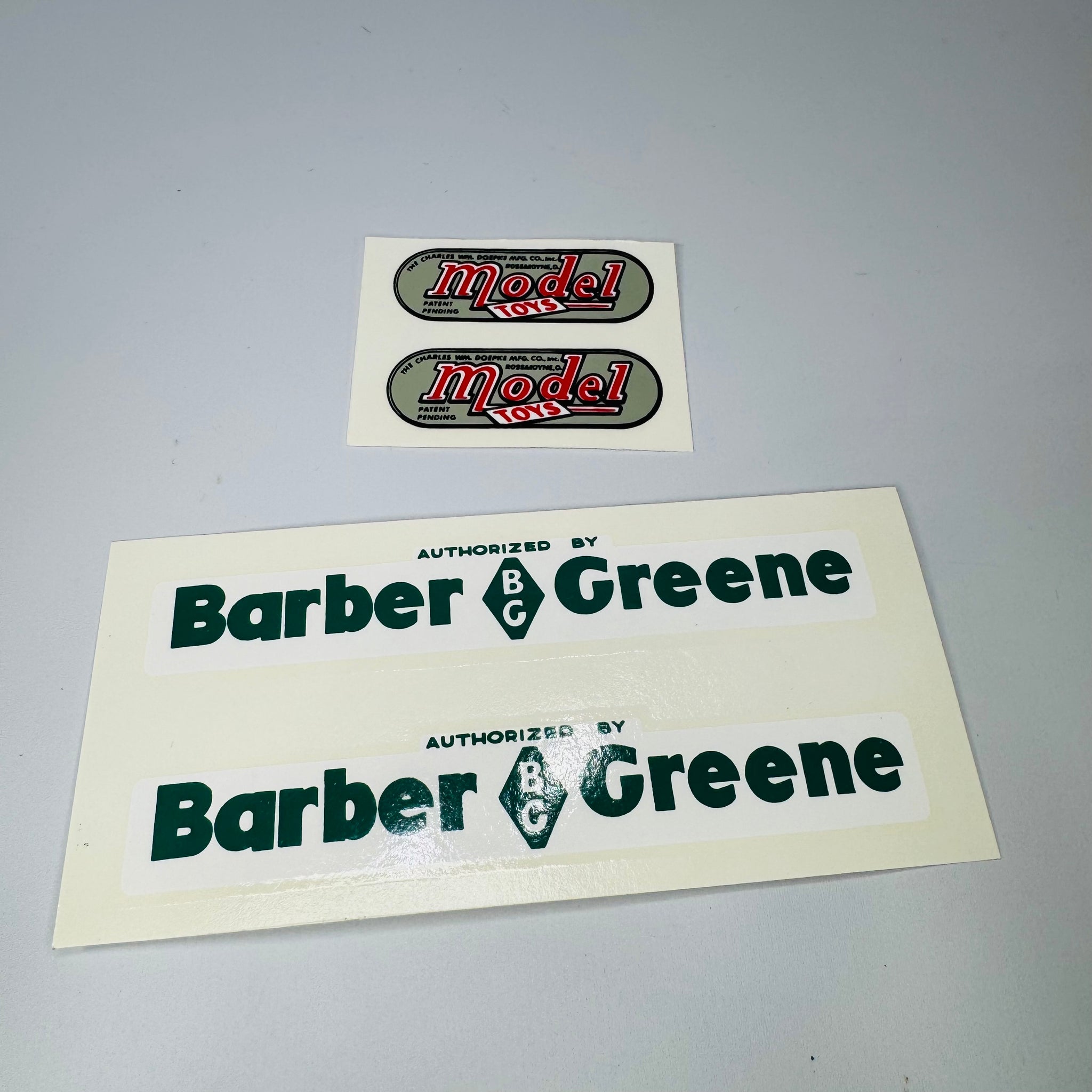 These vintage water transfer (water slide) decals are correct for restoring classic Doepke heavy equipment toy models. Featuring Barber Greene authorization and original Model Toys branding, this set reflects the exact style and application method used during Doepke’s original mid-century production.