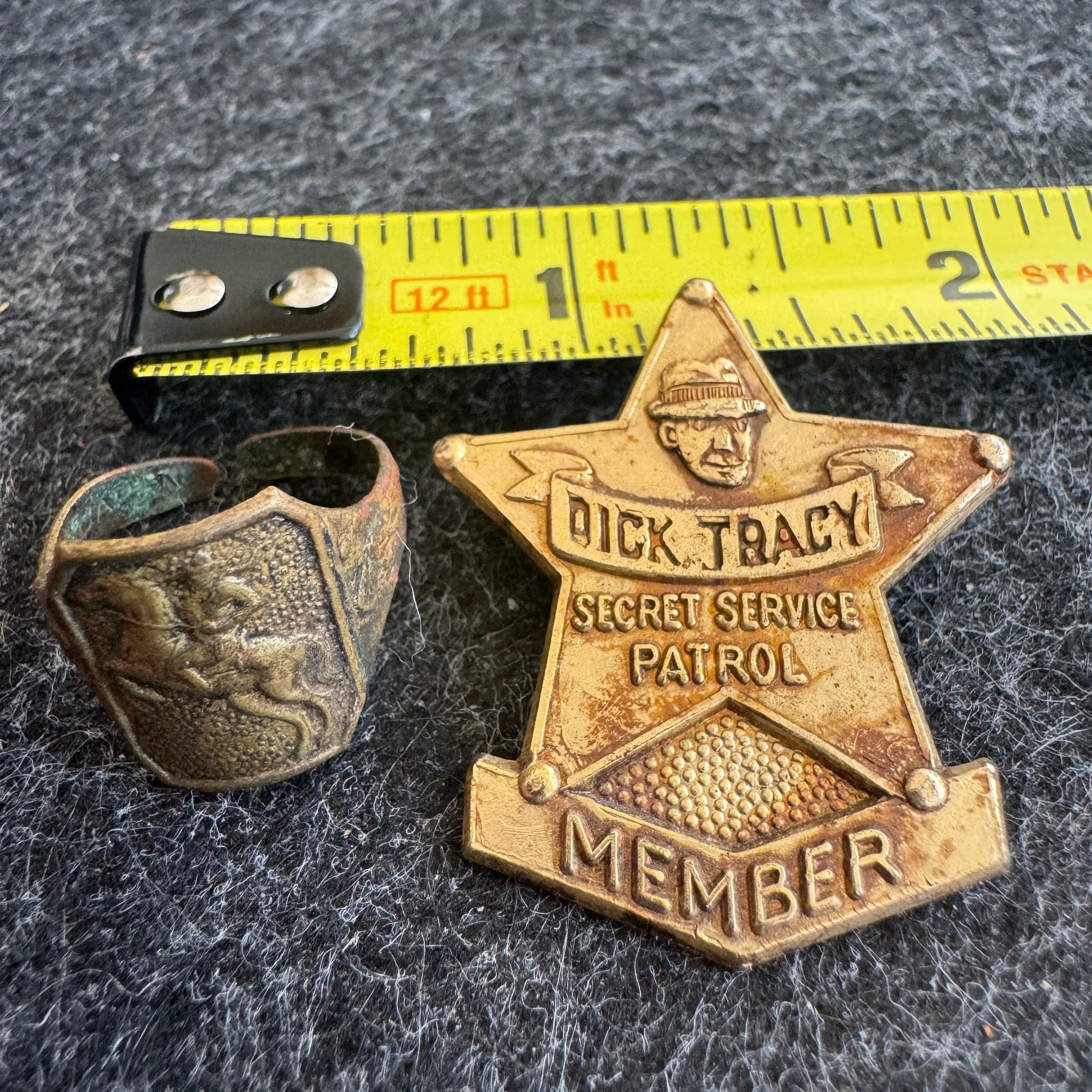 Two classic promo collectibles: a late-1930s Dick Tracy Secret Service Patrol member badge plus a 1950s Cisco Kid cowboy ring—estate find.