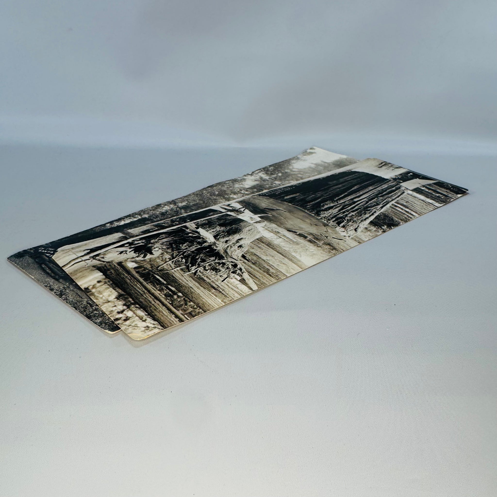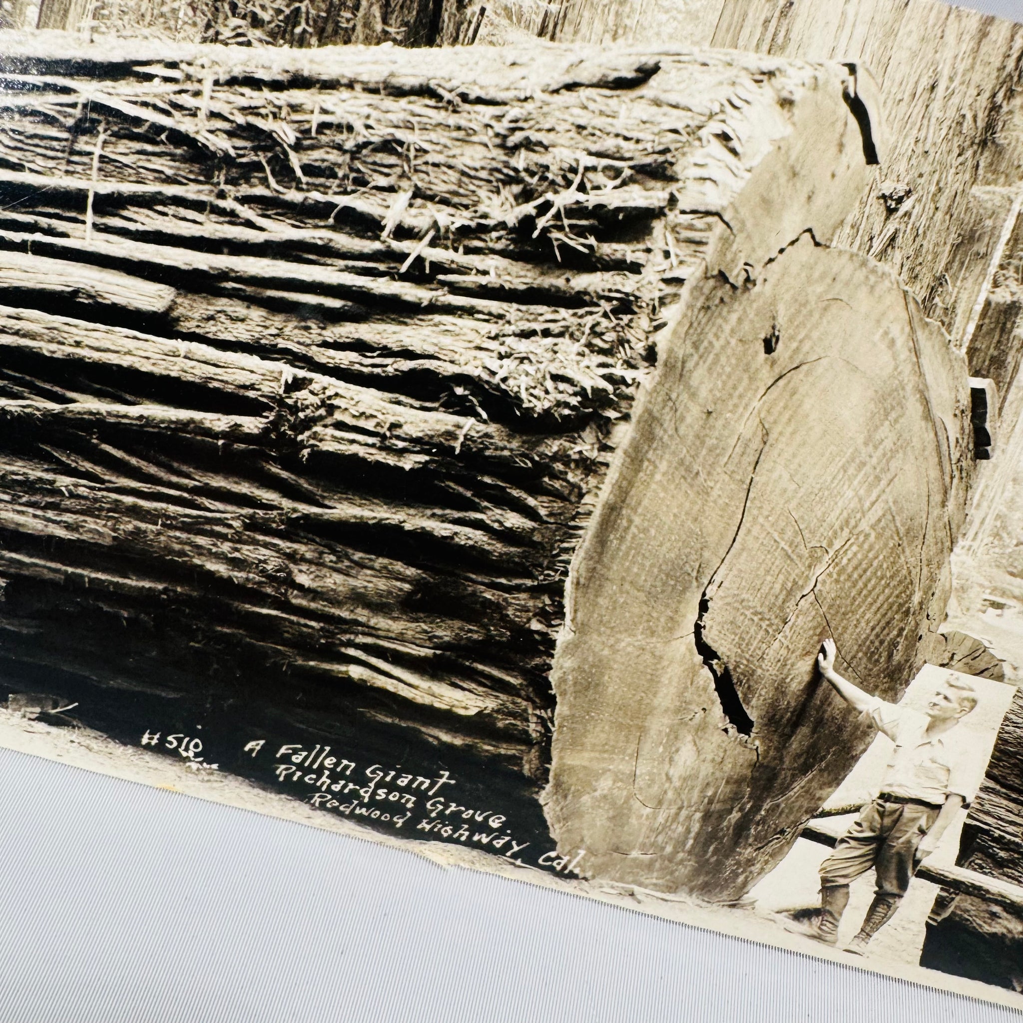 A striking pair of oversized vintage California redwood postcards—classic roadside-souvenir photography featuring towering “giant tree” imagery and a massive fallen redwood log.
