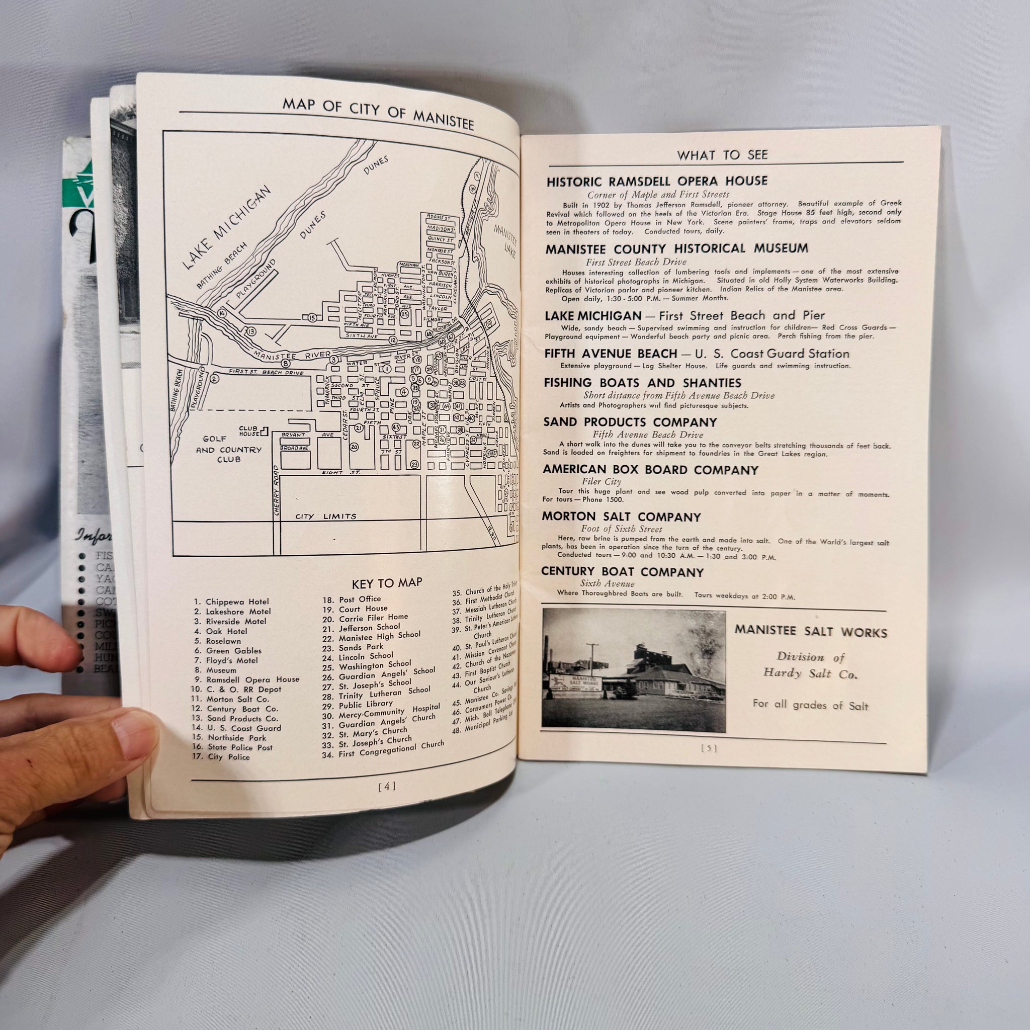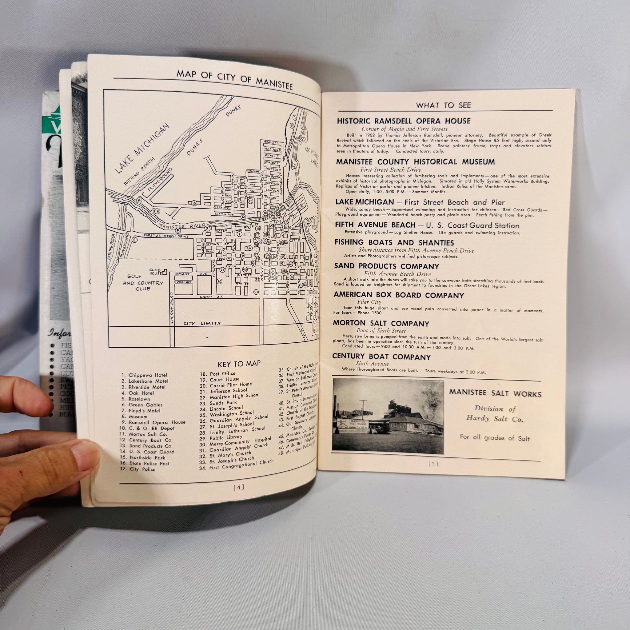 The Manistee County, Michigan booklet (Manistee Board of Commerce) adds beach-town imagery, local ads, and a friendly welcome letter.