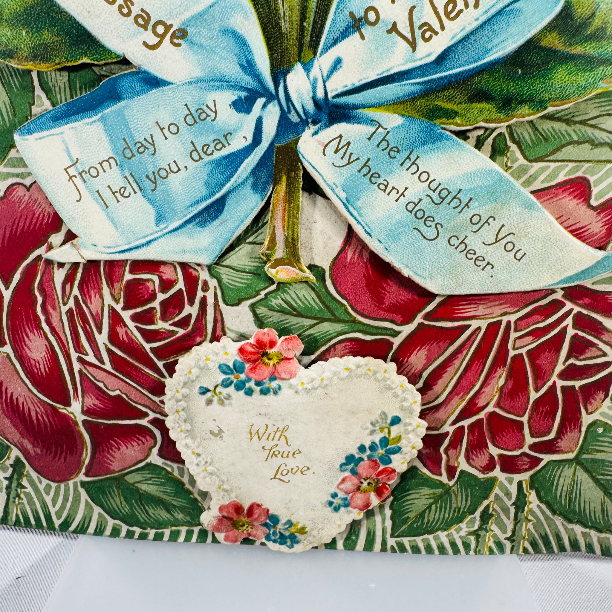 The blue ribbon banner reads “Love’s Message” and “to my Valentine,” with sweet printed verses—made to be displayed and admired.