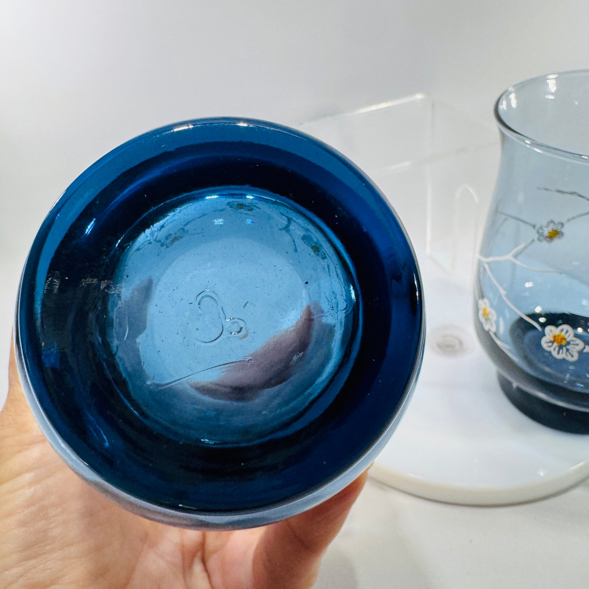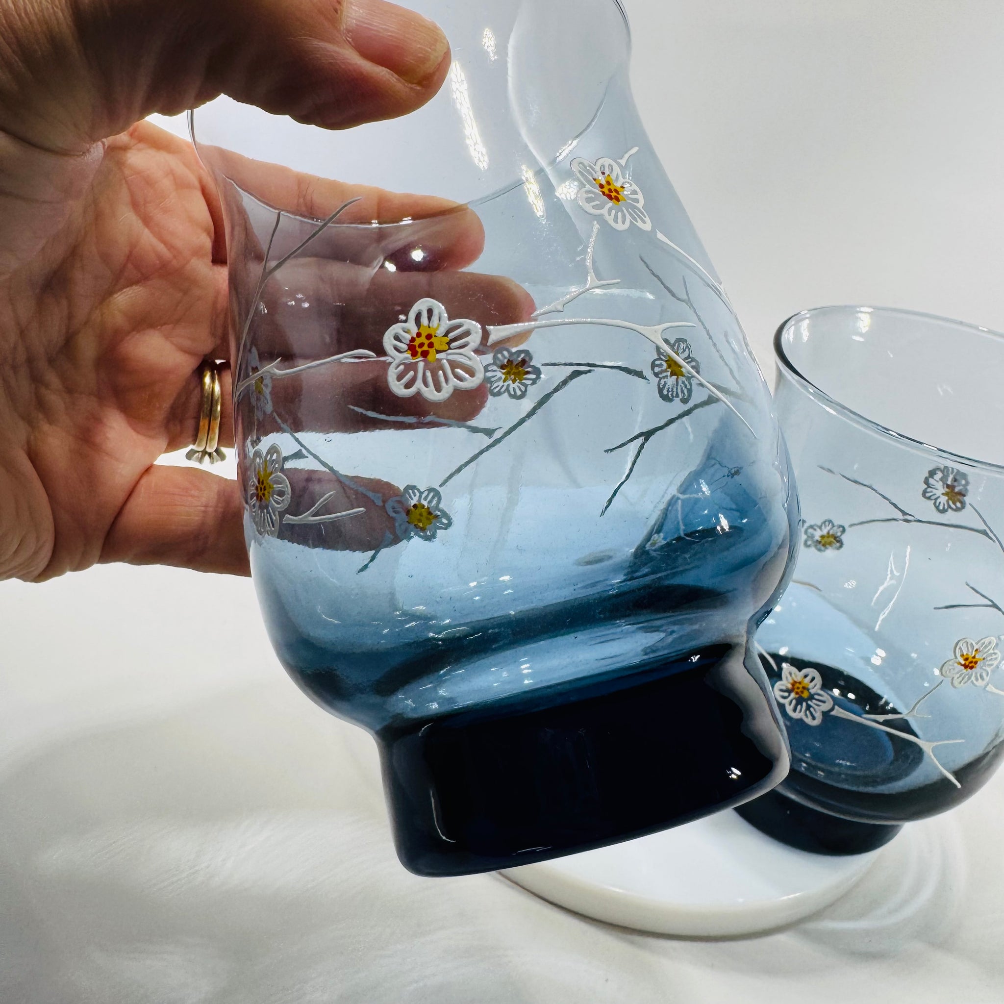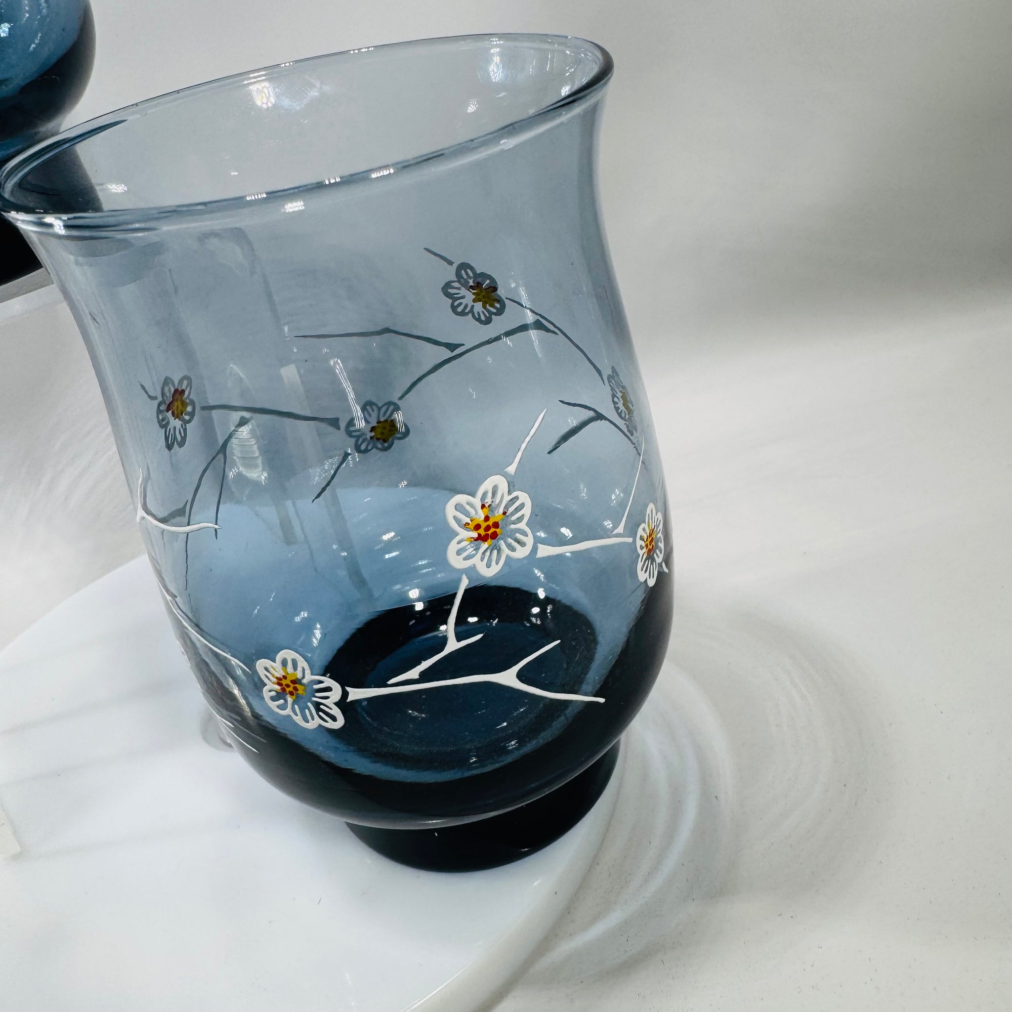 Moody smoky blue glass + delicate dogwood blooms = an easy win for your bar cart. This set of 2 vintage Libbey tumblers features a white branch-and-flower motif with tiny yellow and warm orange/red centers, finished with a darker weighted base.
