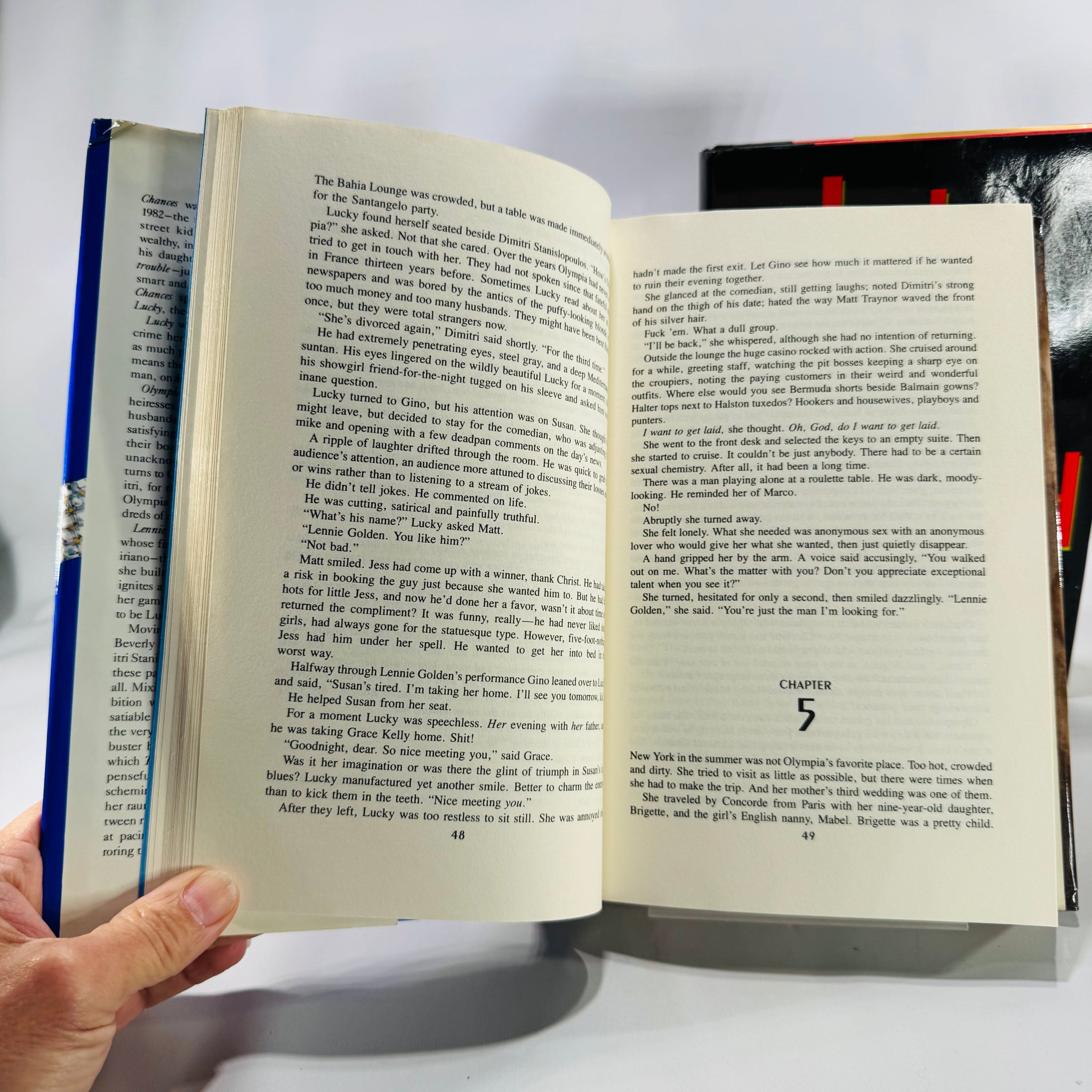 Lucky (1985) follows Lucky Santangelo’s rise through Las Vegas and Beverly Hills; Hollywood Husbands (1986) delivers backstage gossip, rivalries, and careers on the line.