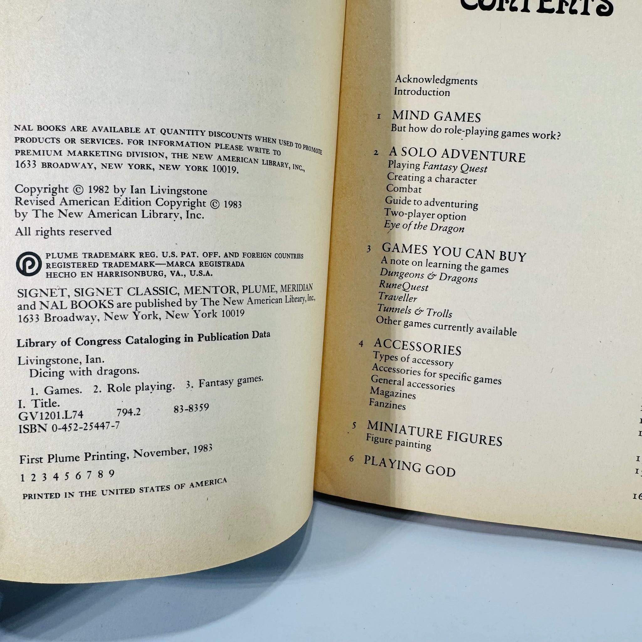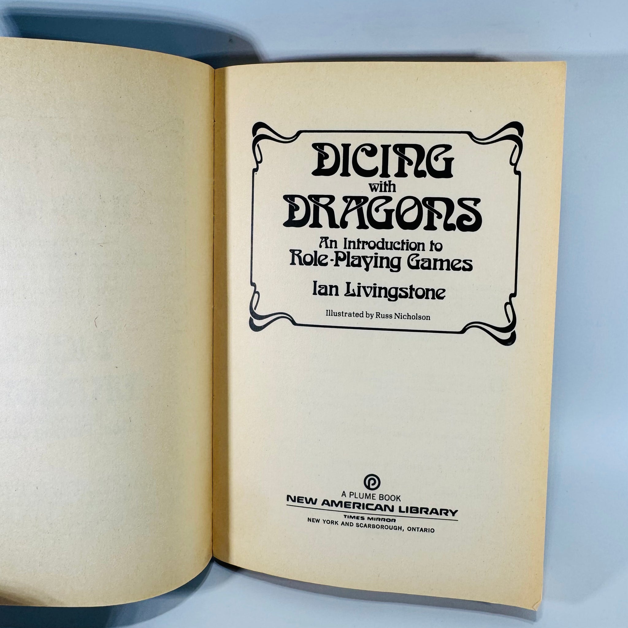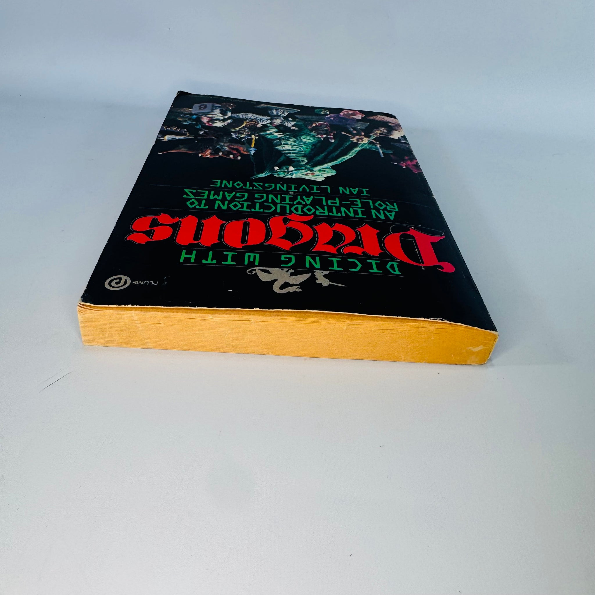 A great crossover title for fantasy readers, tabletop gamers, and early RPG collectors, Dicing with Dragons is Ian Livingstone’s lively introduction to the role-playing hobby at the moment it was breaking into the mainstream. Rather than a novel, this is a practical fantasy gaming guide that explains how role-playing works, introduces major games of the period, and includes the solo adventure “Eye of the Dragon.” It also has strong visual appeal, with miniature-filled cover art and interior illustrations by Russ Nicholson. This copy is photo-verified as a 1983 First Plume Printing paperback with visible cover and edge wear, clean readable text pages, and nicely aged paper.