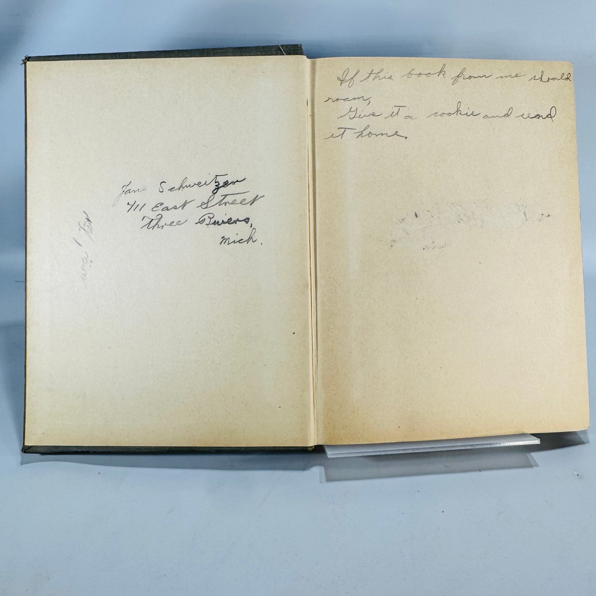Penciled ownership to front endpapers (name/address “Three Rivers, Mich.”) and brief note; pencil scribbles present on rear board.