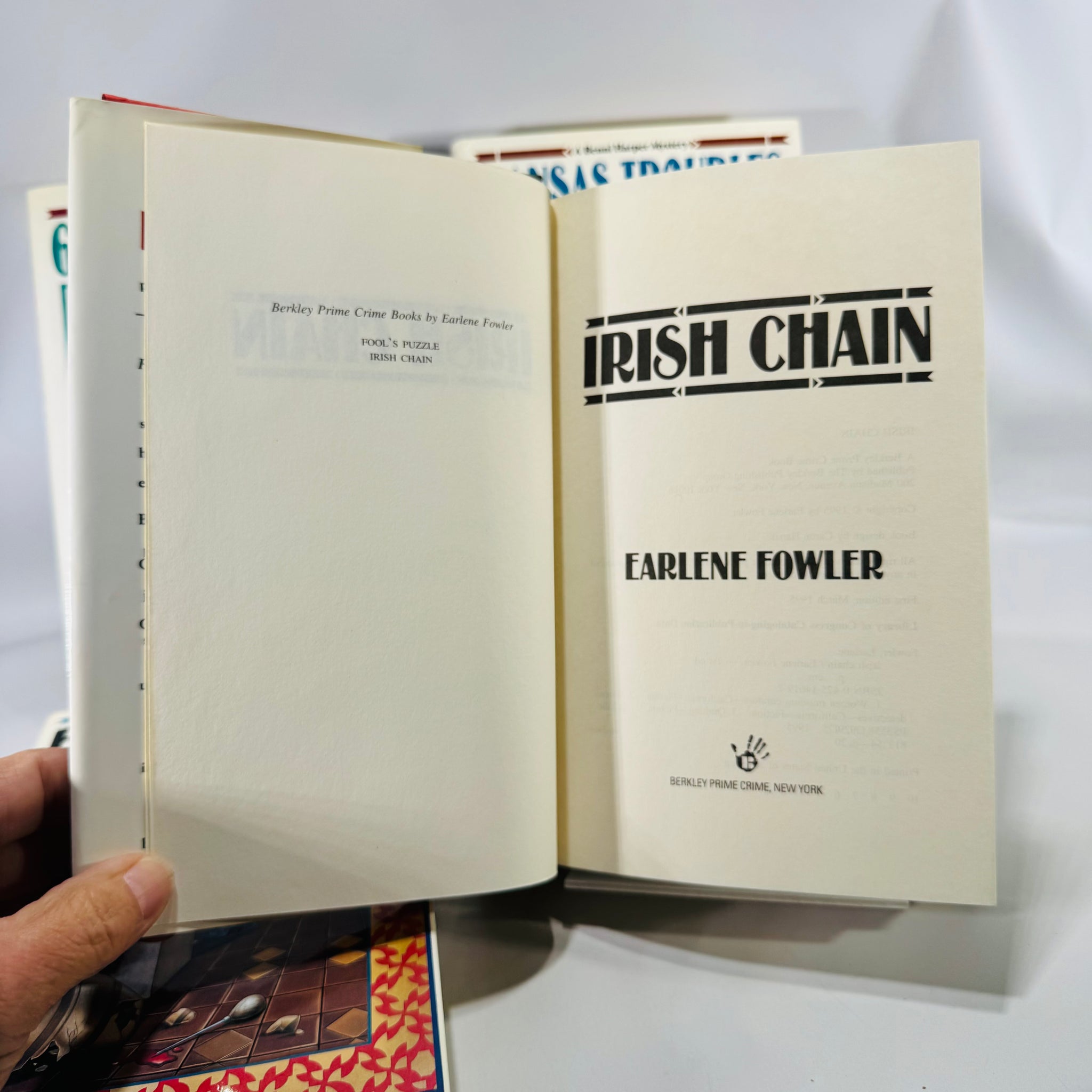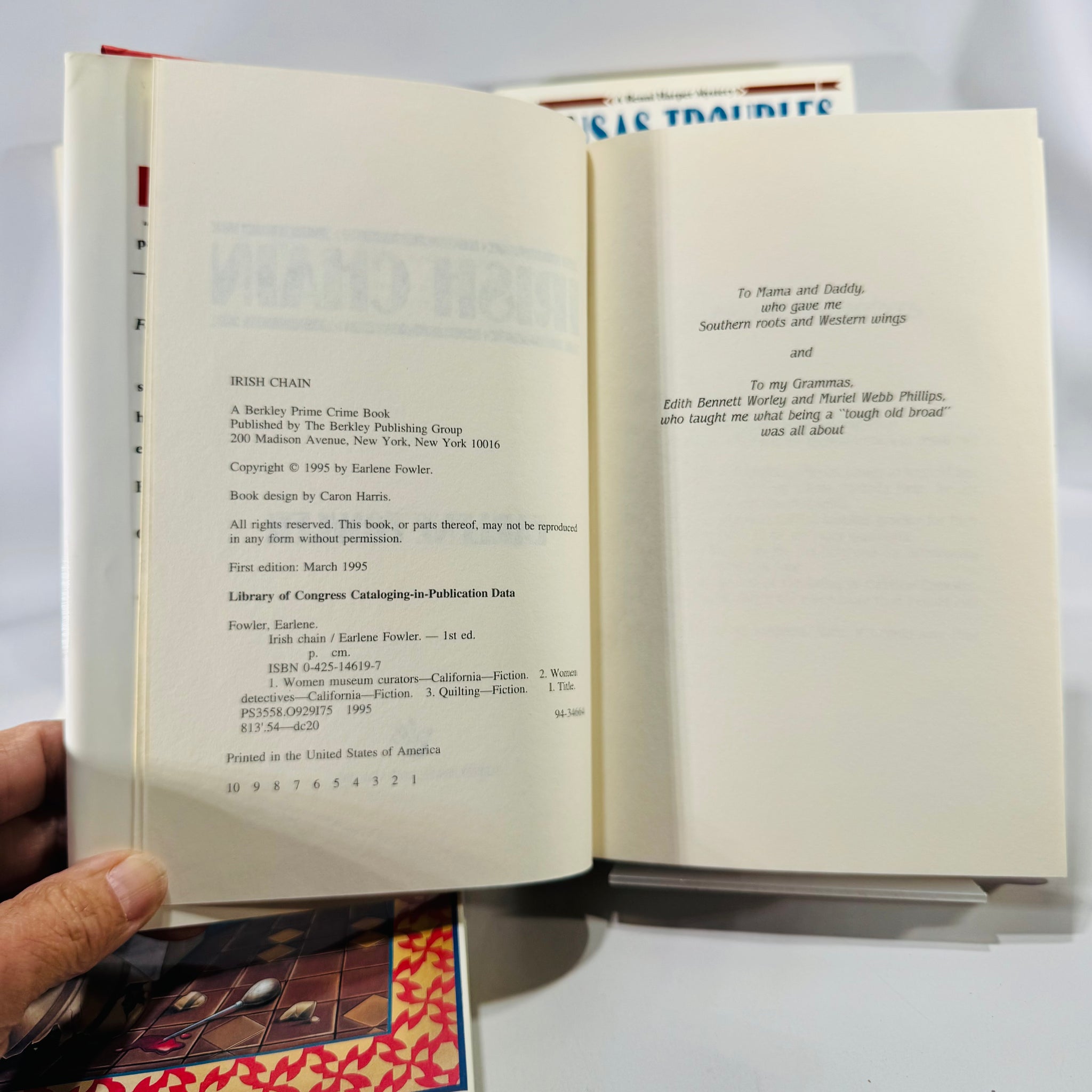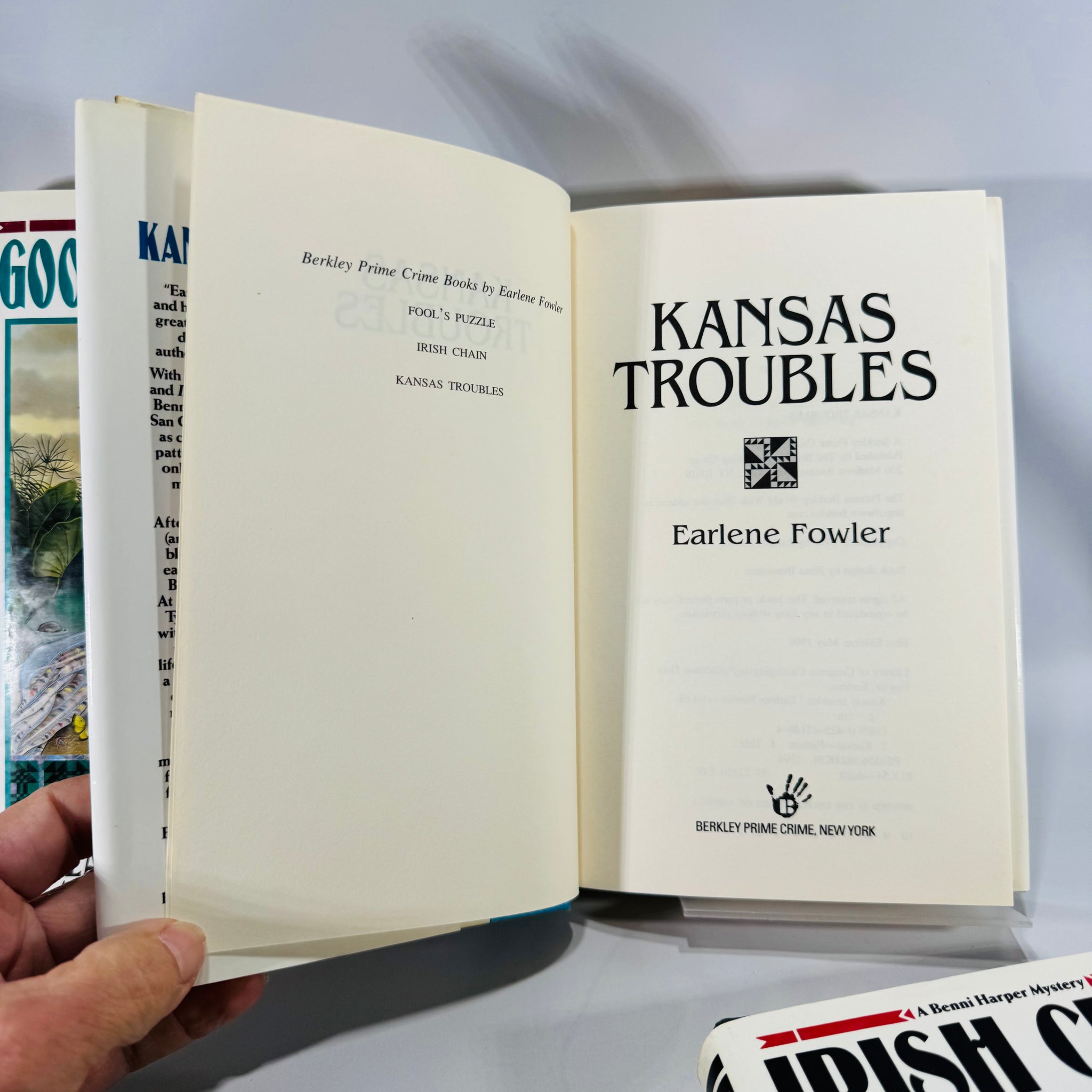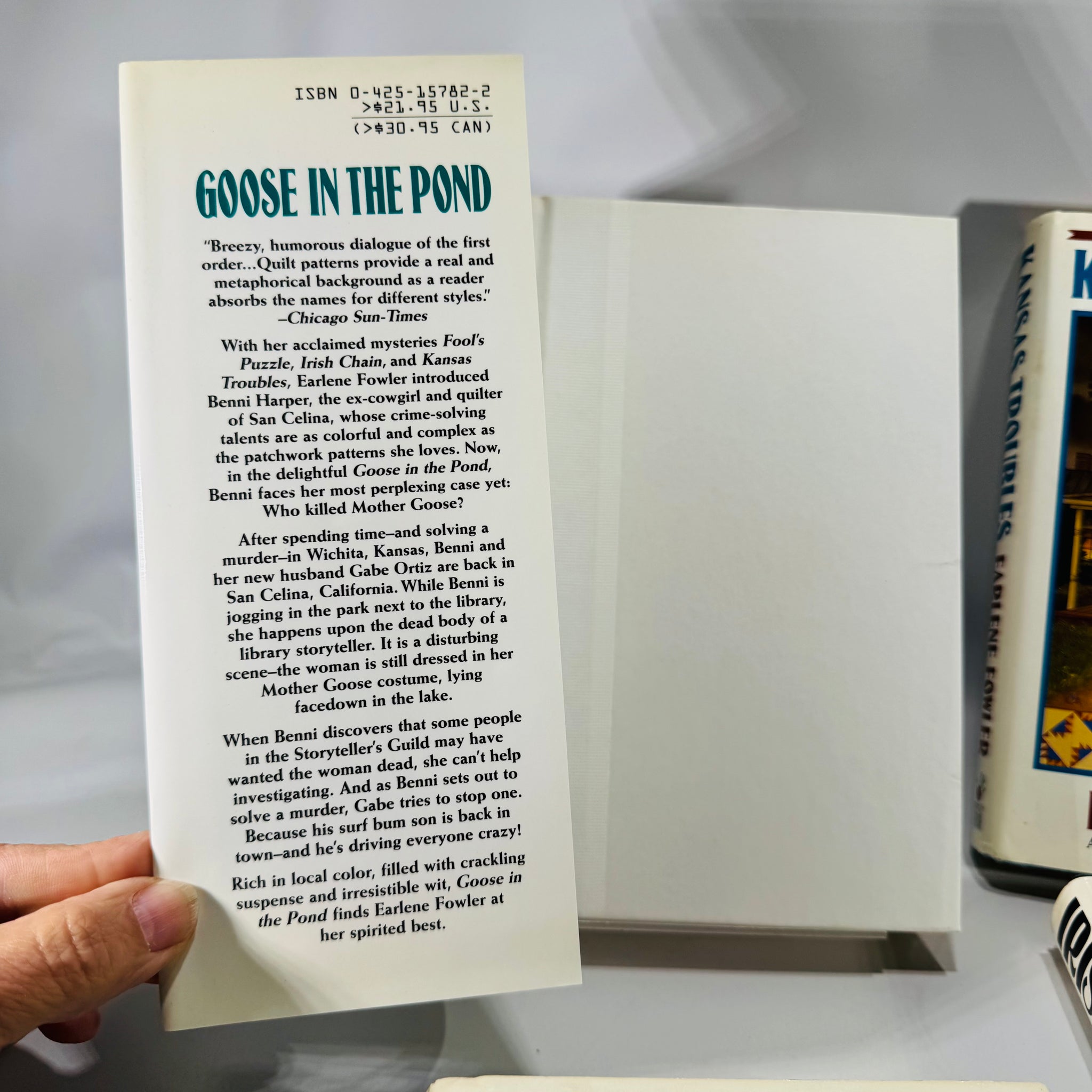 You’ll get Fool’s Puzzle, Irish Chain, Kansas Troubles, and Goose in the Pond, all hardcover with jackets and the original quilt-pattern cover art. A ready-to-read vintage book bundle for sale—photo-verified condition so you can buy with confidence.