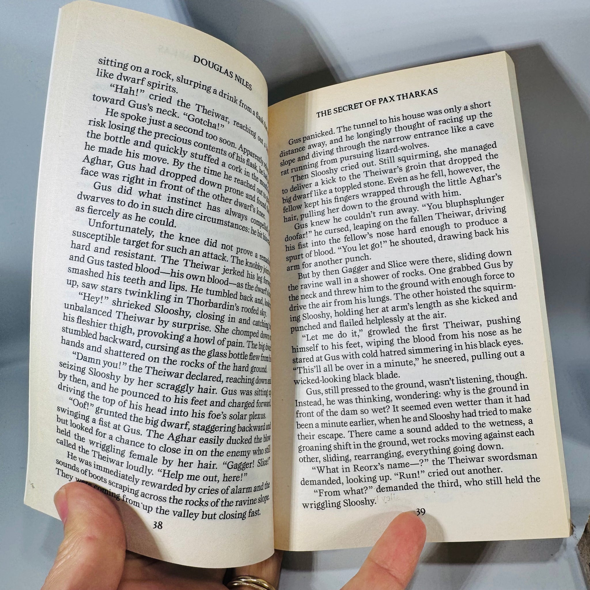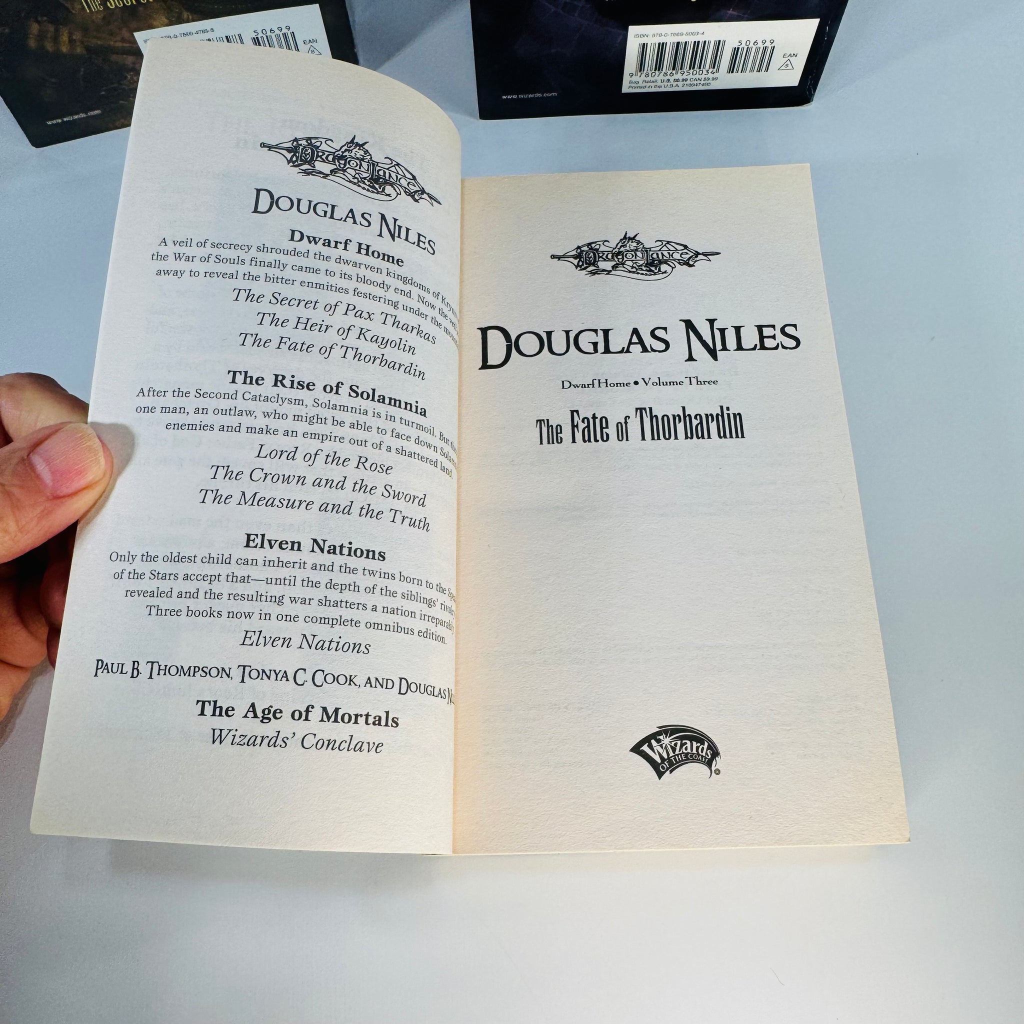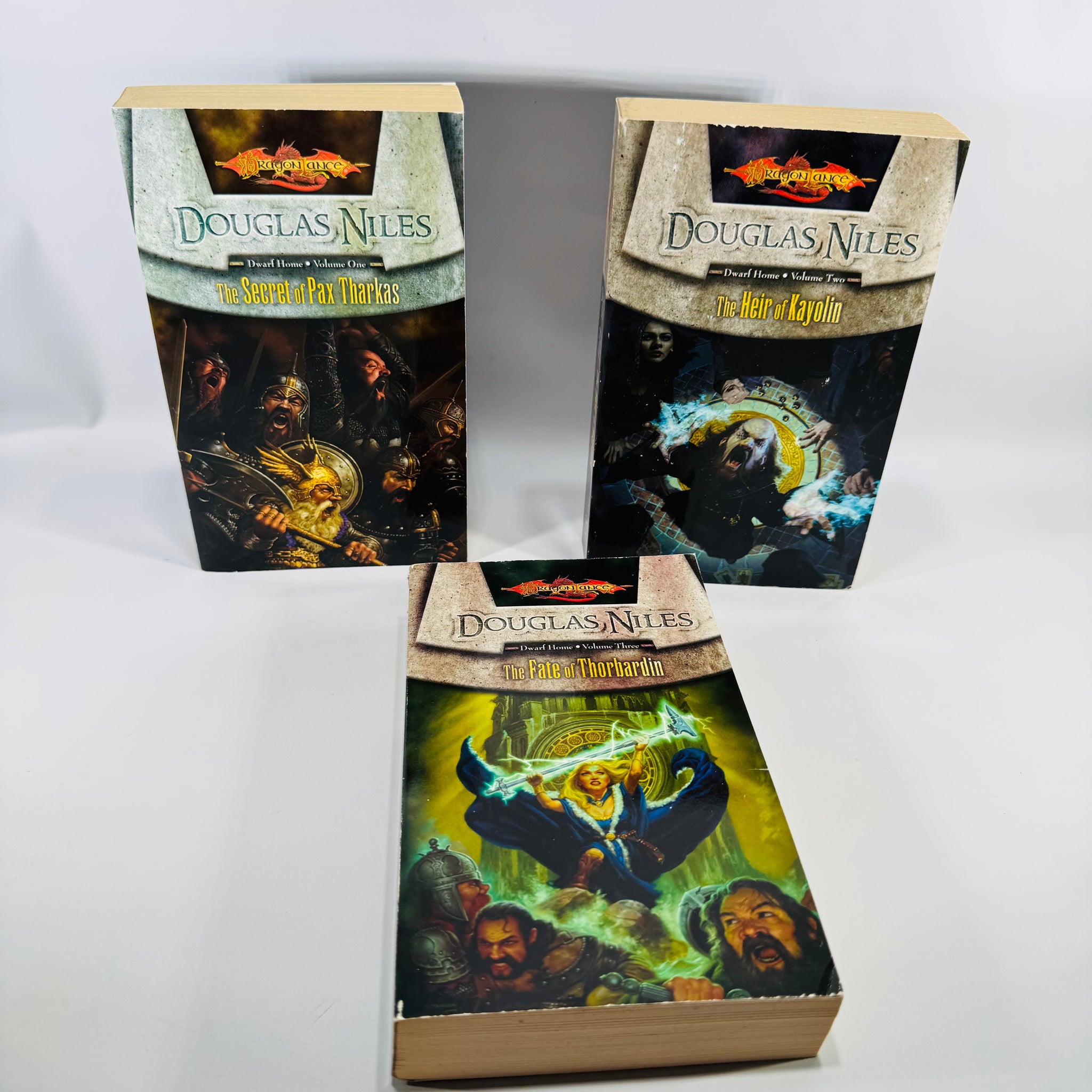 Dragonlance Dwarf Home trilogy paperback set by Douglas Niles with all 3 volumes. Complete reader set with page toning, spine wear, and shelf wear shown.