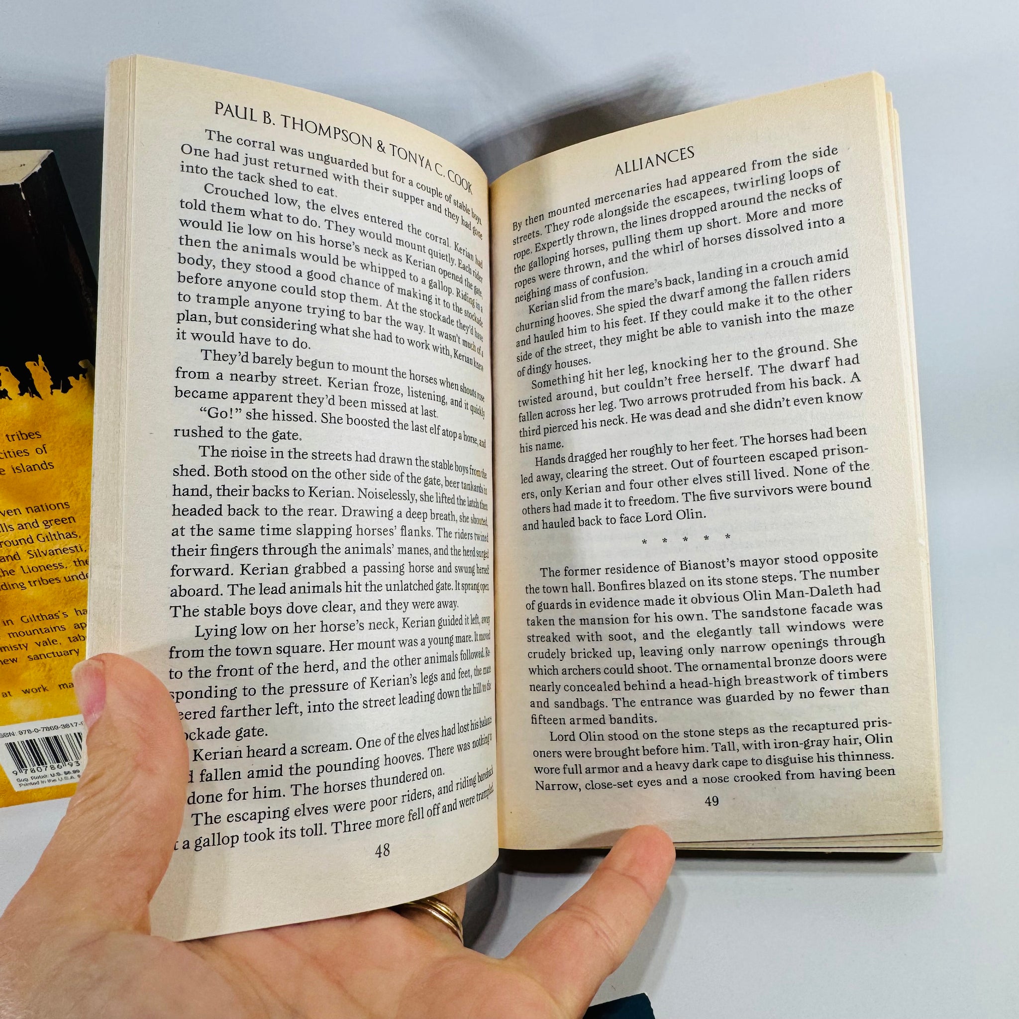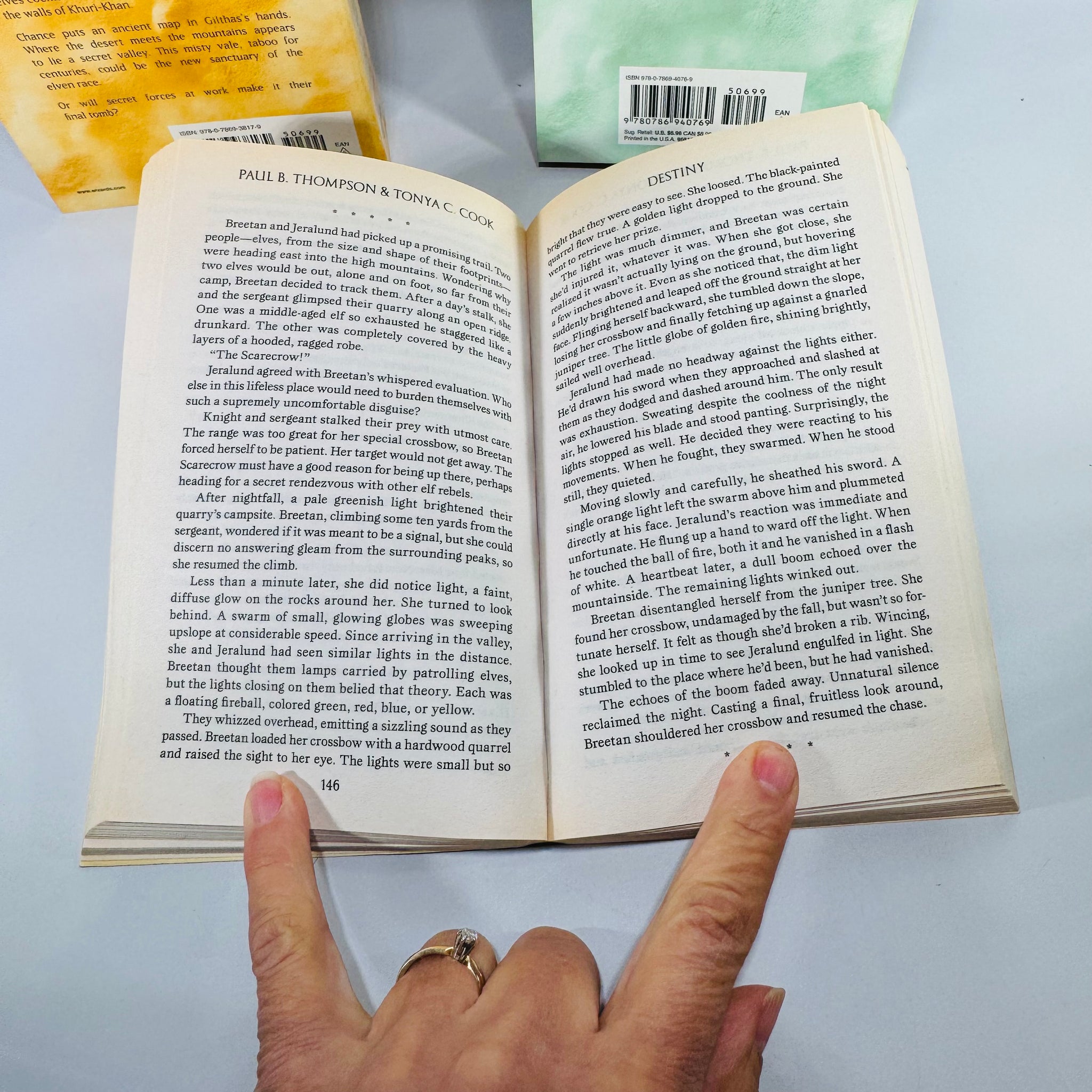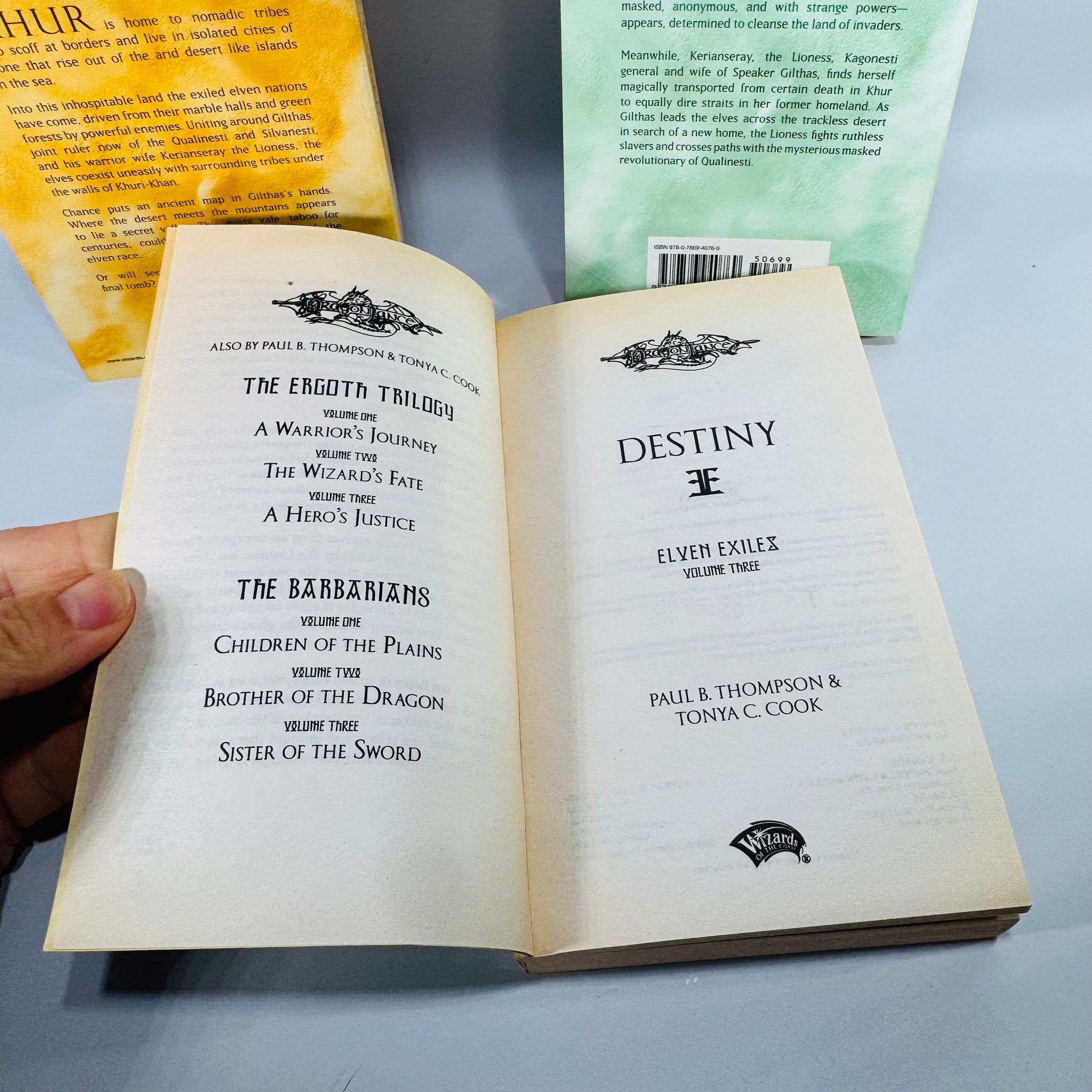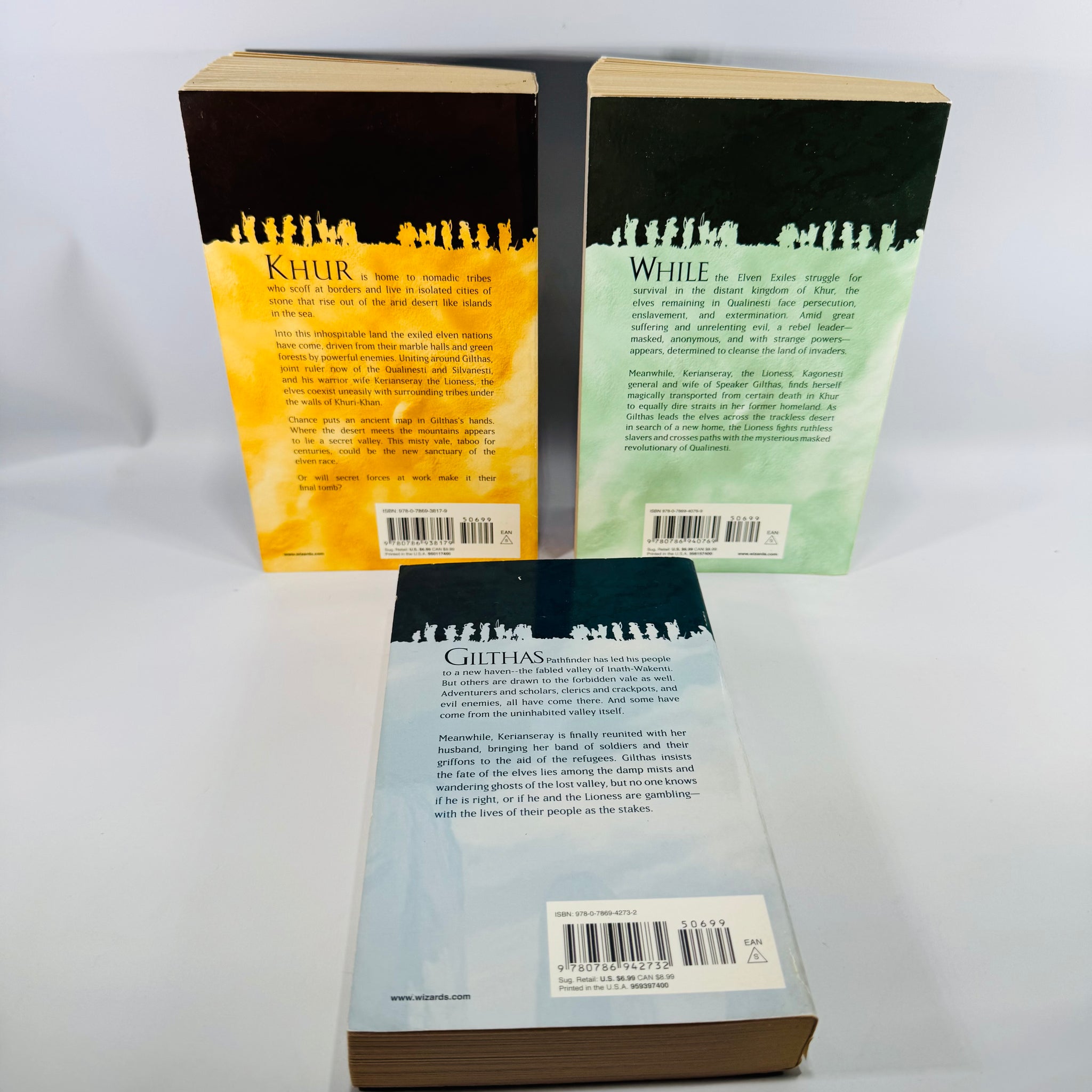 Notable Features: Complete Elven Exiles trilogy; matching paperback set; copyright pages shown; back covers and spines shown; interior sample pages shown