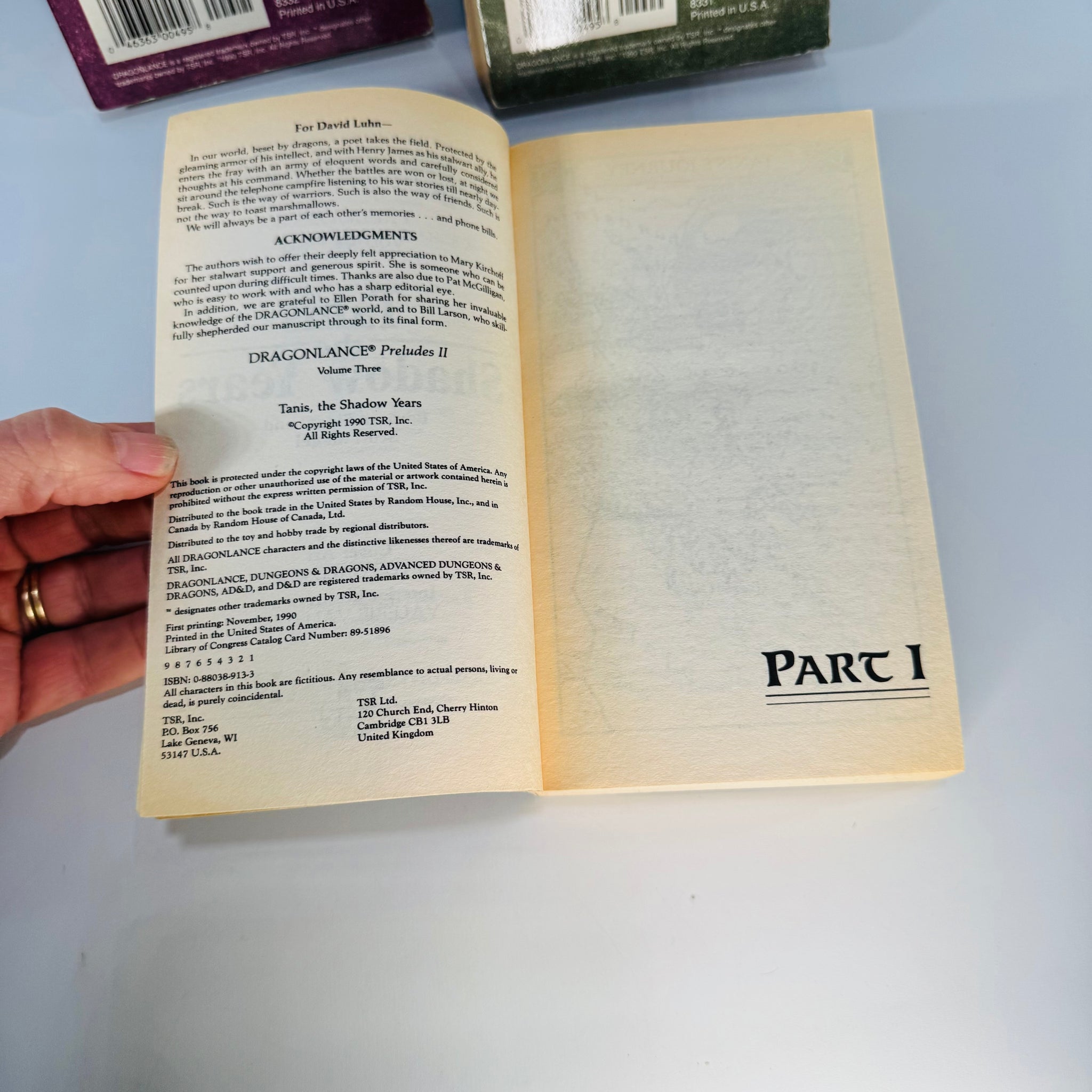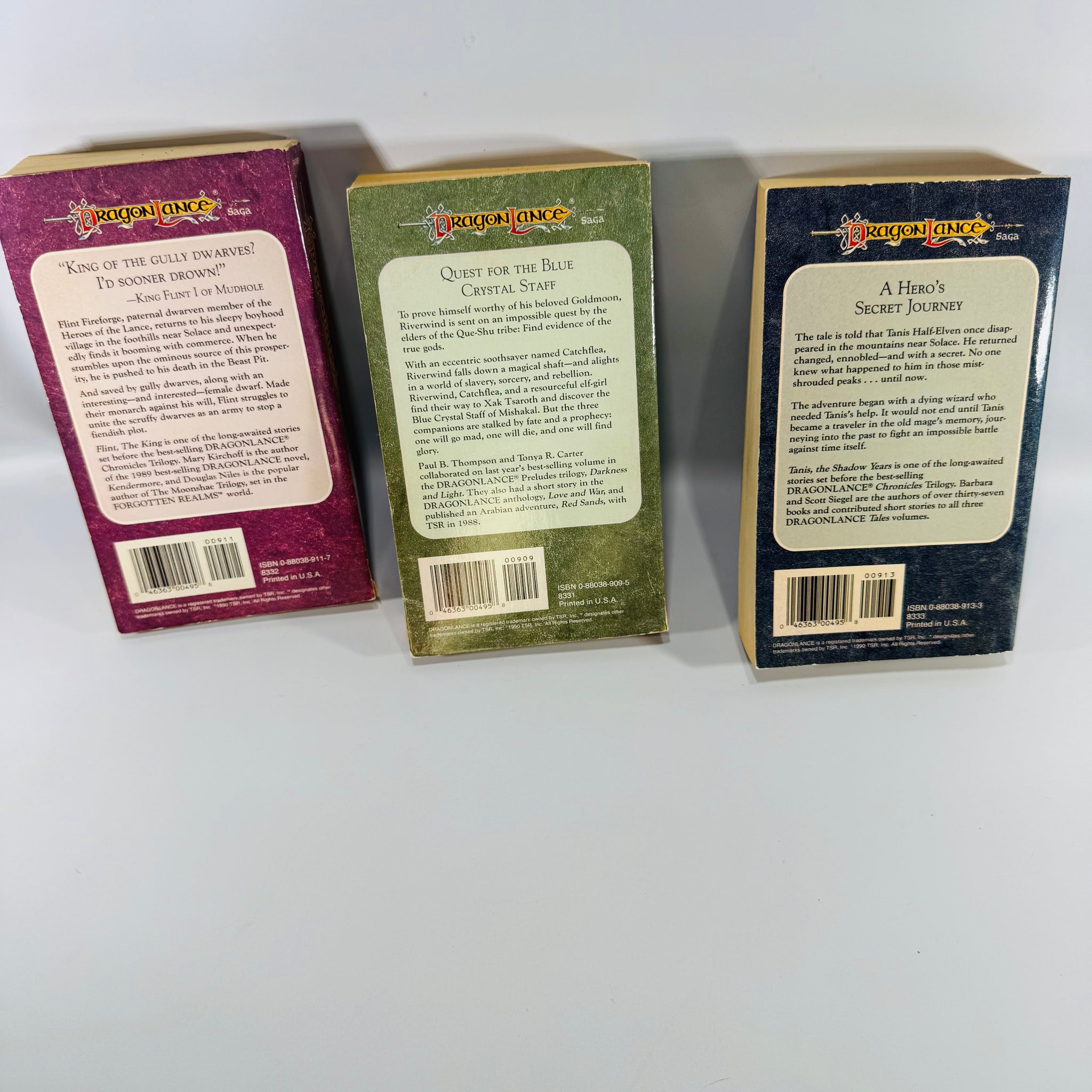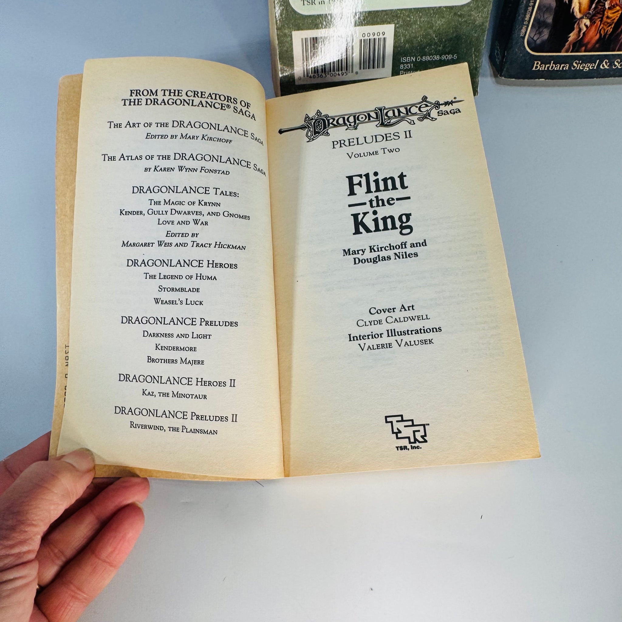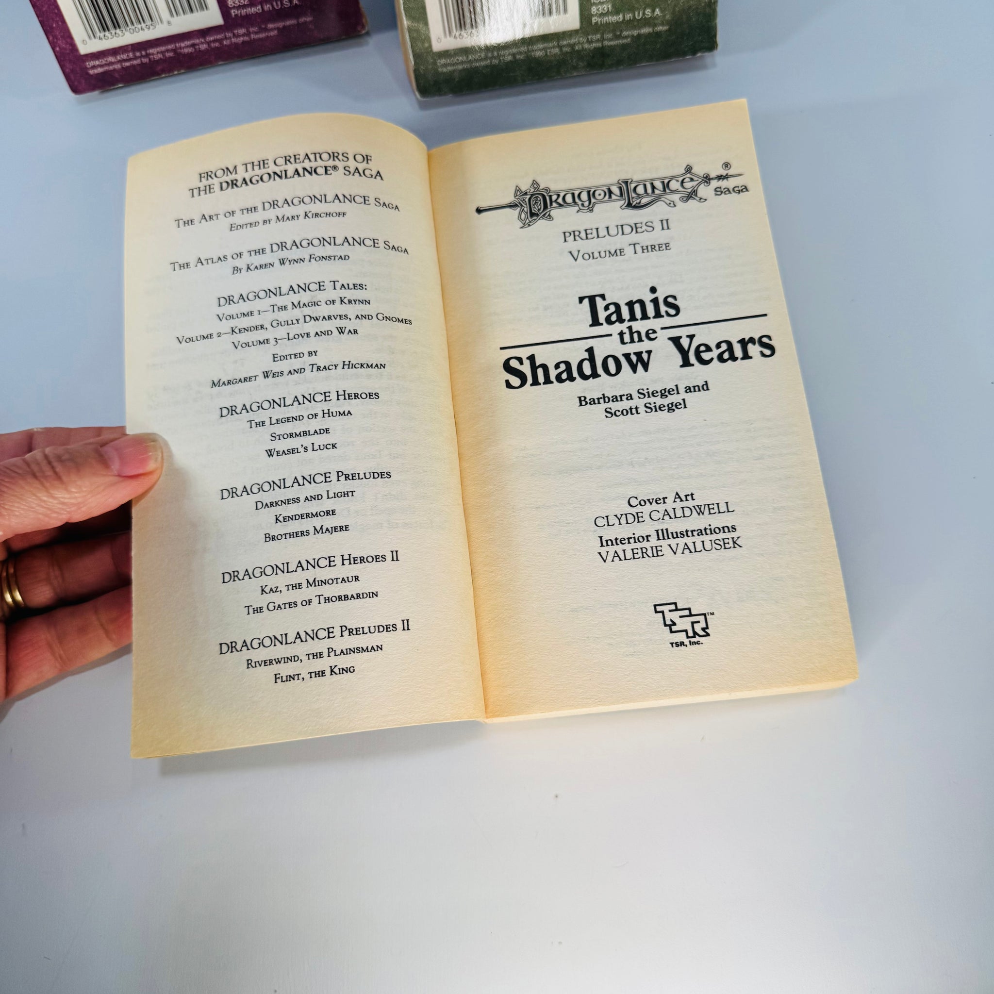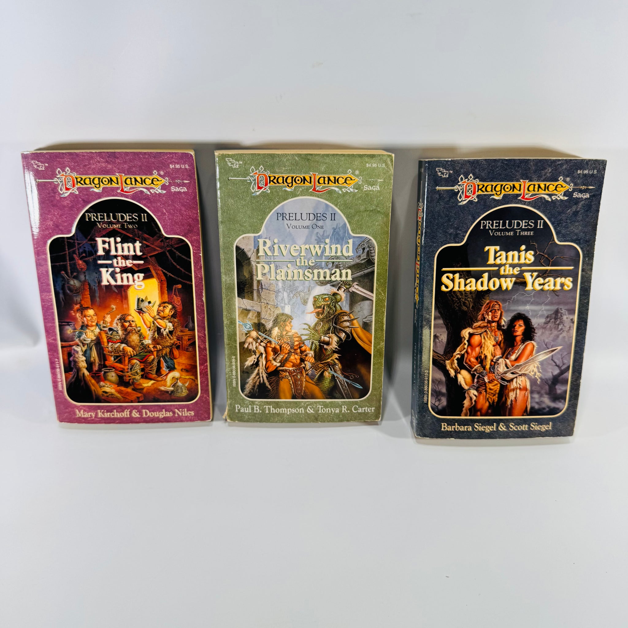 Dragonlance Preludes II paperback set of 3 with Riverwind, Flint, and Tanis backstory novels; a complete 1990 TSR fantasy lot with visible wear.