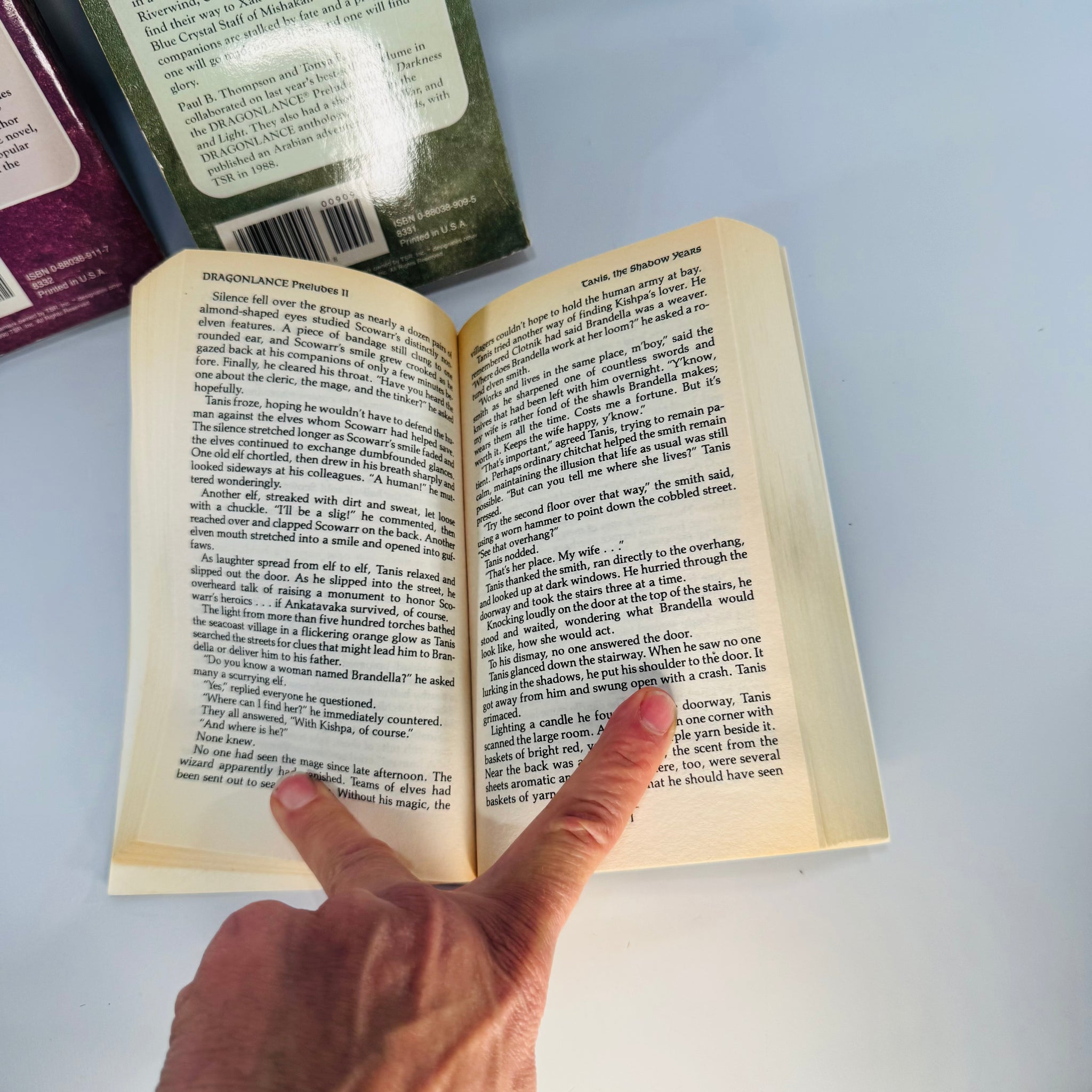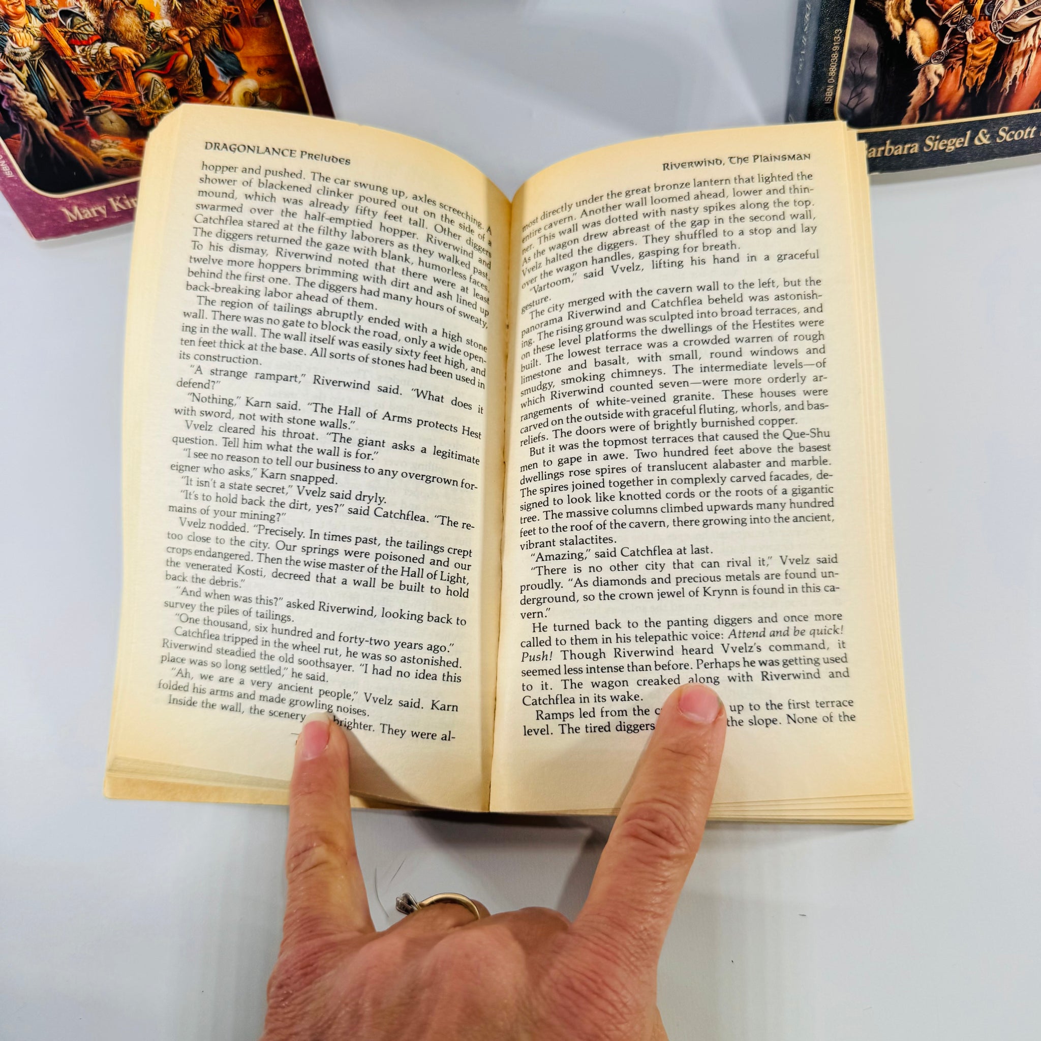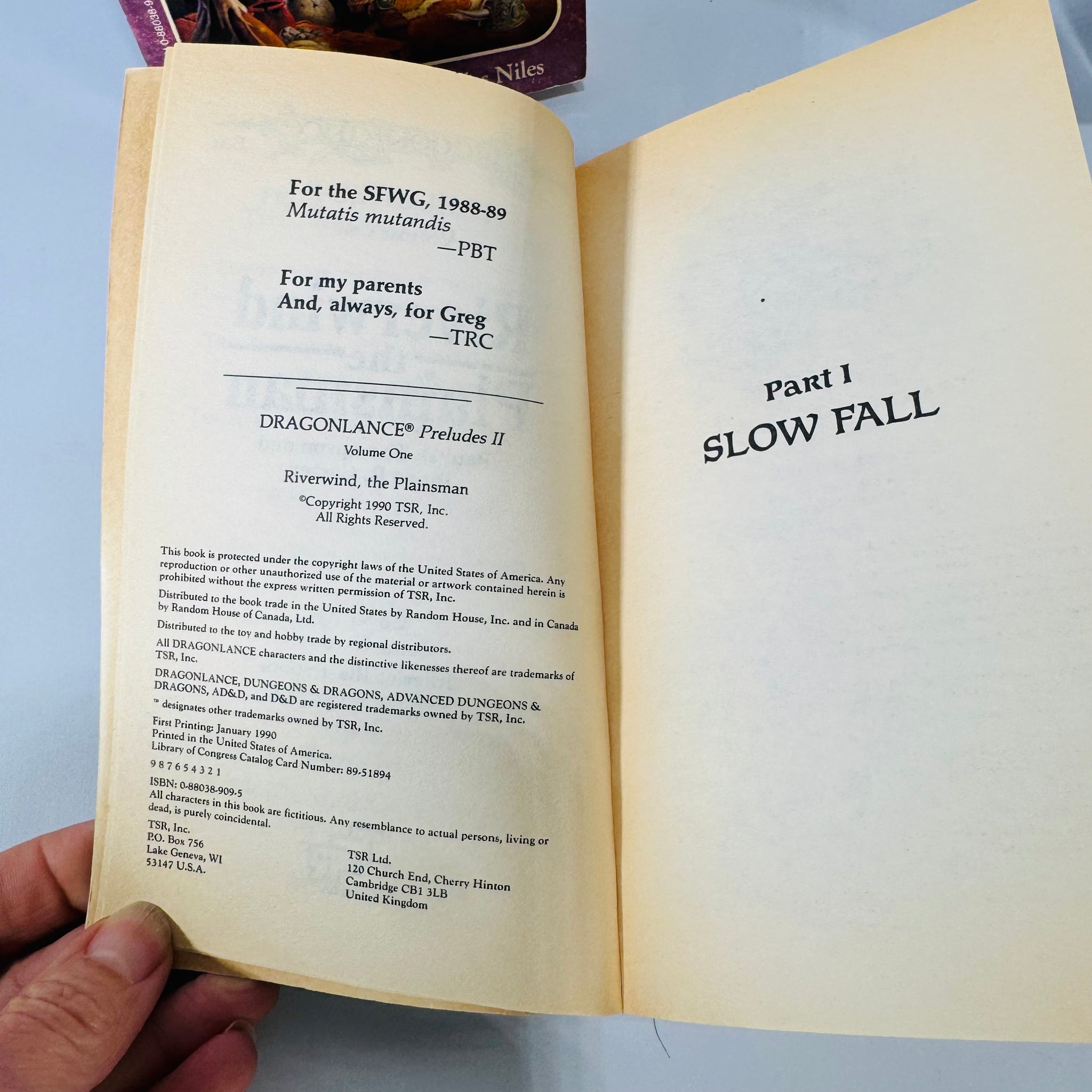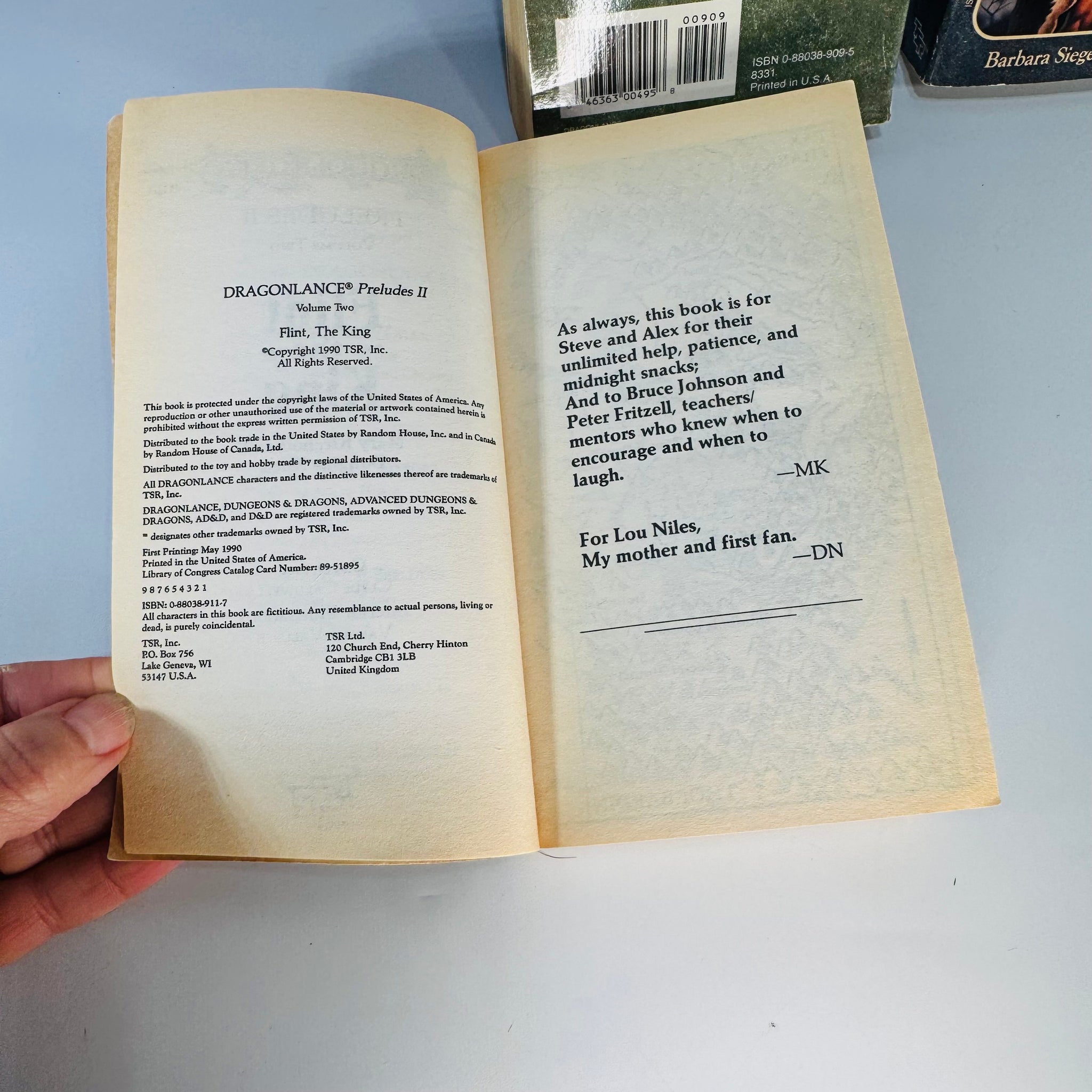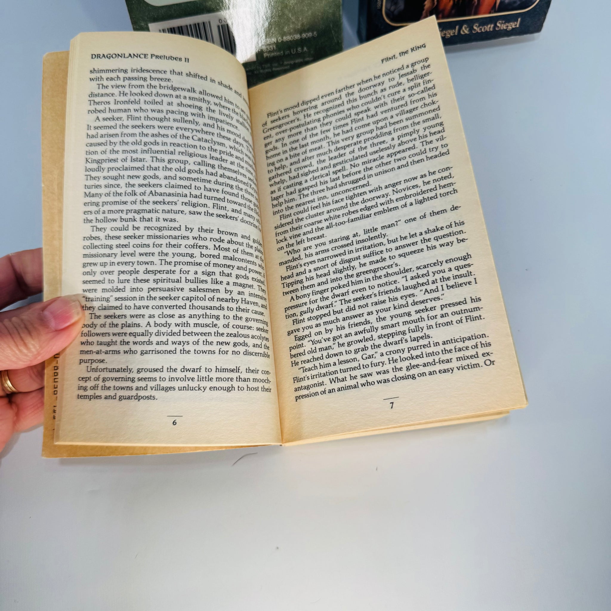 Dragonlance Preludes II paperback set of 3 with Riverwind, Flint, and Tanis backstory novels; a complete 1990 TSR fantasy lot with visible wear.