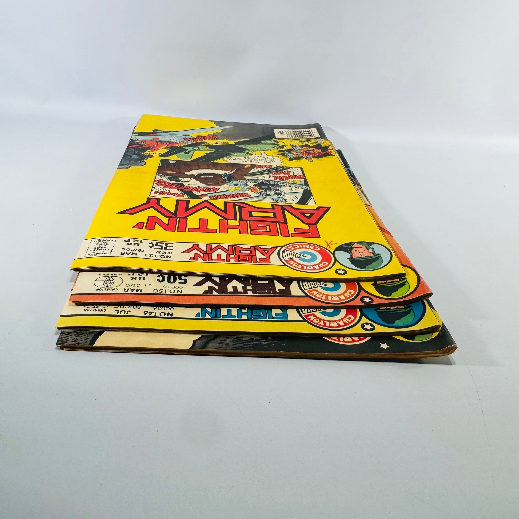 Fightin Army comic lot with 4 Charlton war comics: issues 128, 131, 146, and 150. Bright covers with creasing, edge wear, and age toning shown.