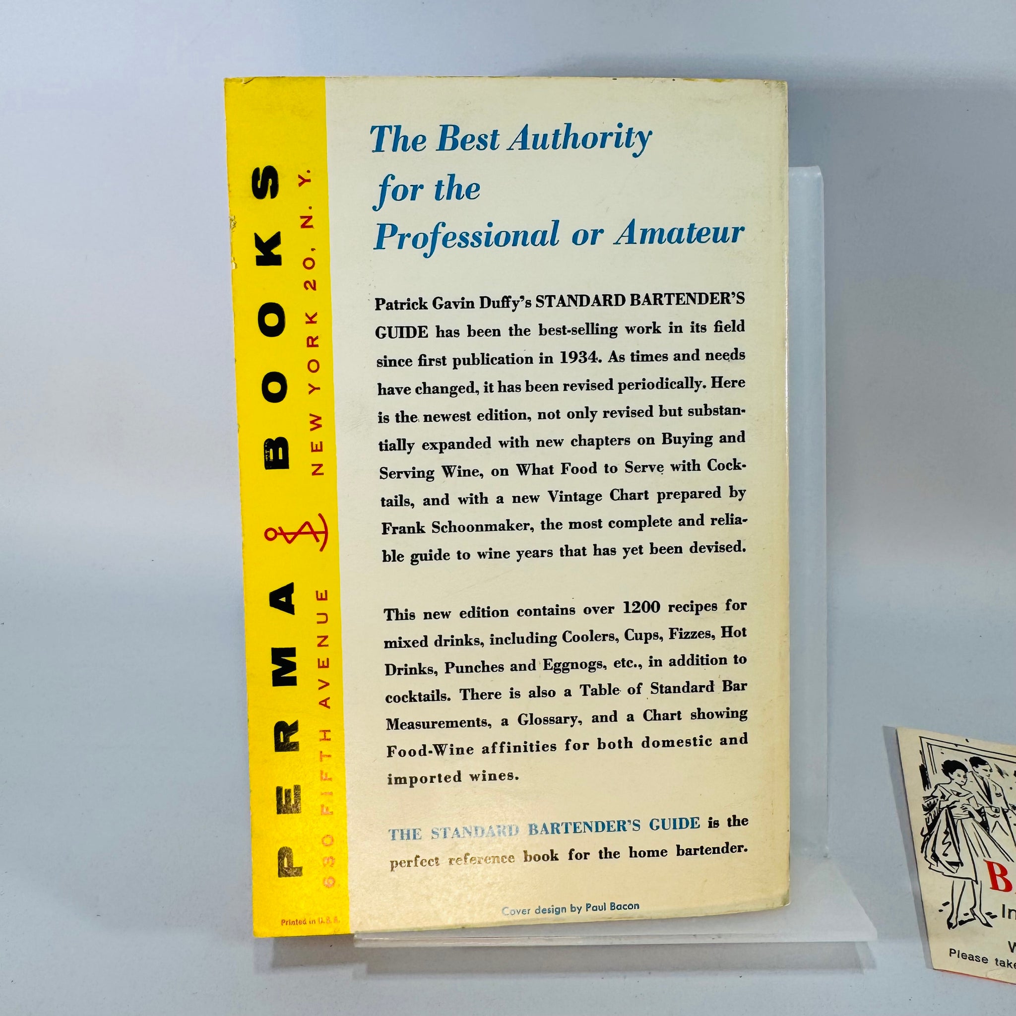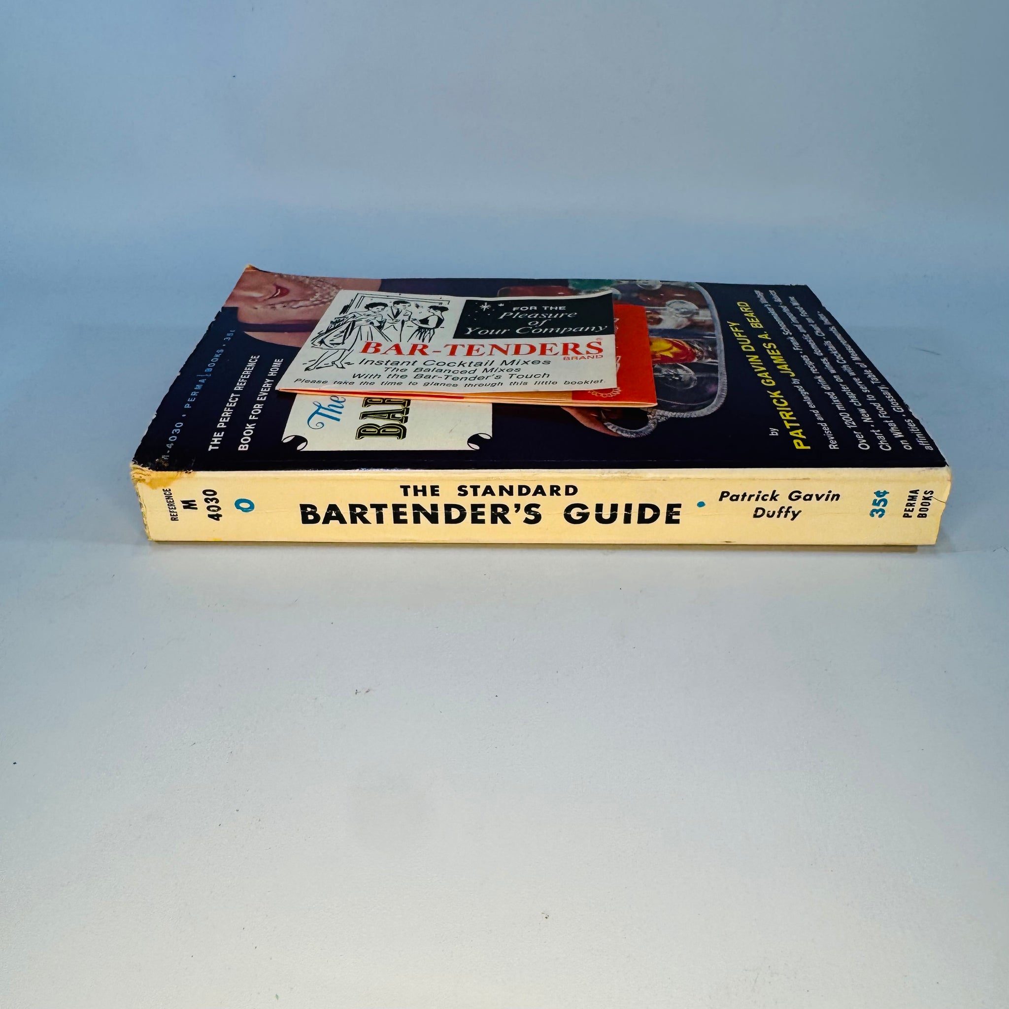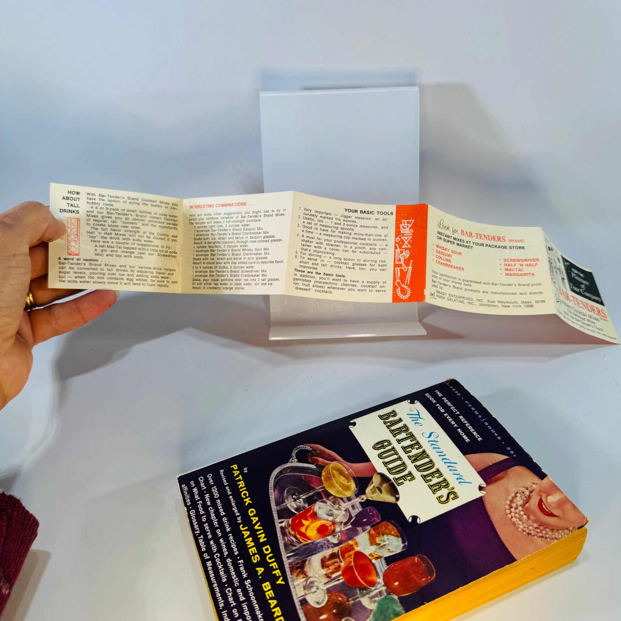 Includes the paperback The Standard Bartender’s Guide by Patrick Gavin Duffy, revised and enlarged by James A. Beard, along with a small Bar-Tenders Brand Instant Cocktail Mixes pamphlet. The pamphlet includes cocktail convenience notes, basic tool suggestions, tips on mixing cocktails, and branded recipe references.