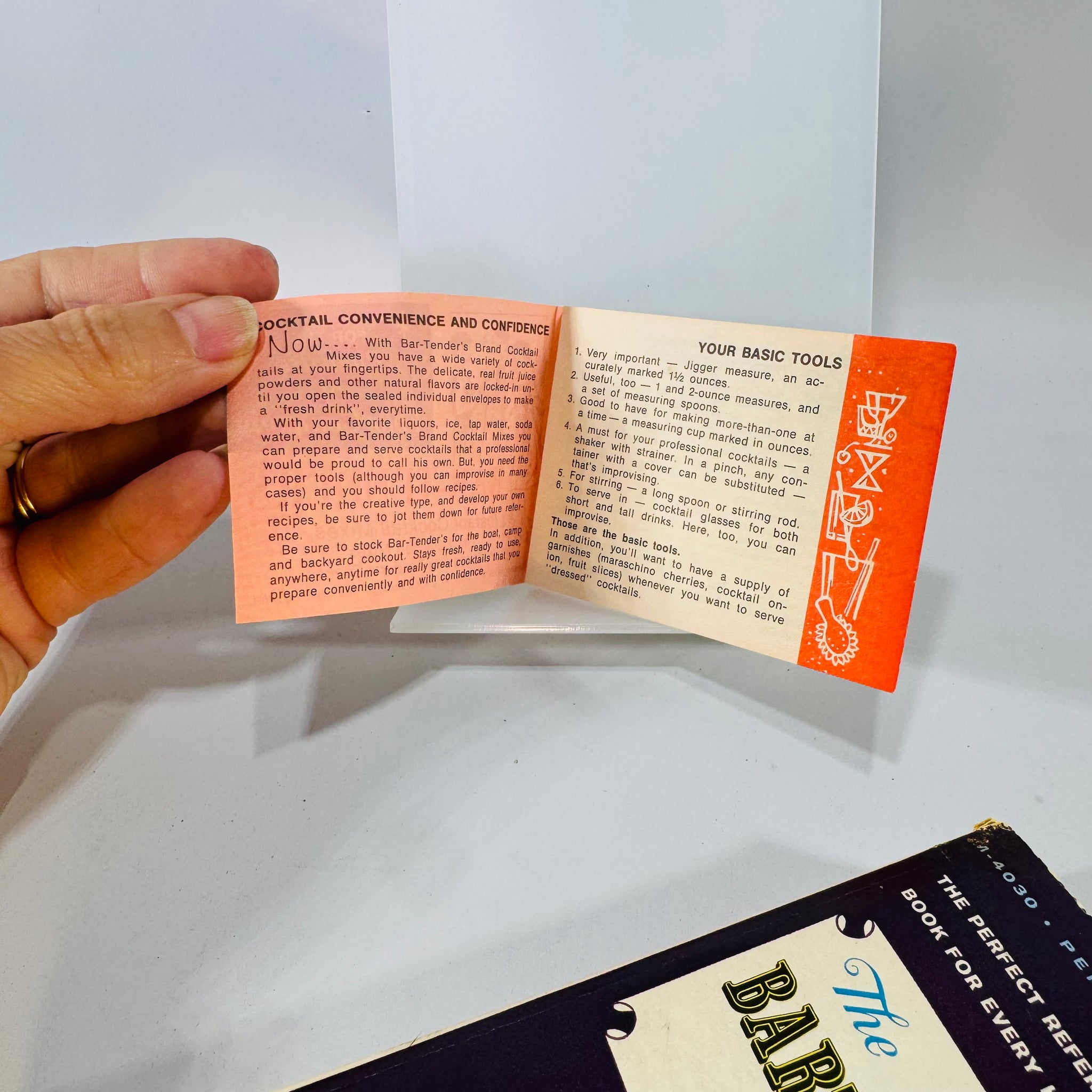 The book is a practical home-bar reference packed with classic mixed drink recipes, bar measurements, glossary material, and sections organized by spirit base. The companion pamphlet adds a fun period advertising piece with cocktail tips, tool suggestions, and branded mix ideas.