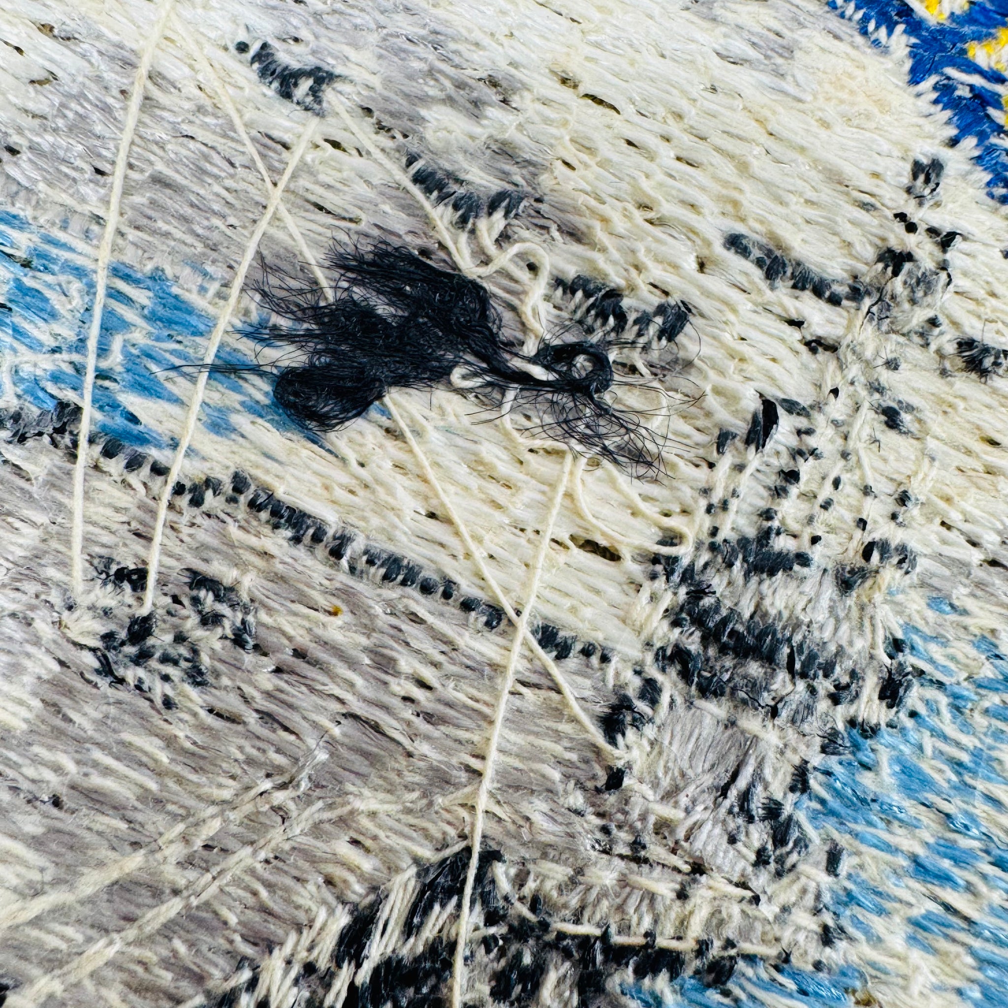 • Fraying and thread loss visible along the perimeter, especially at the lower points