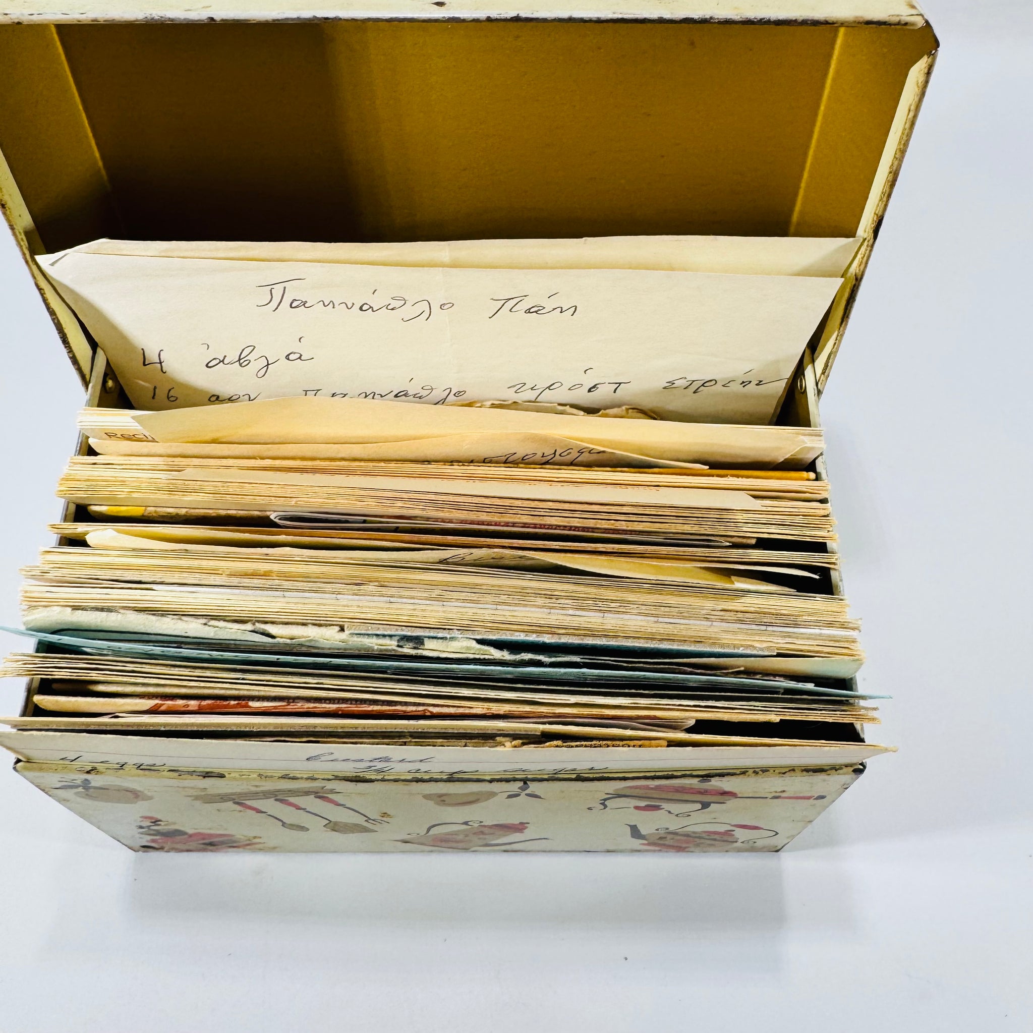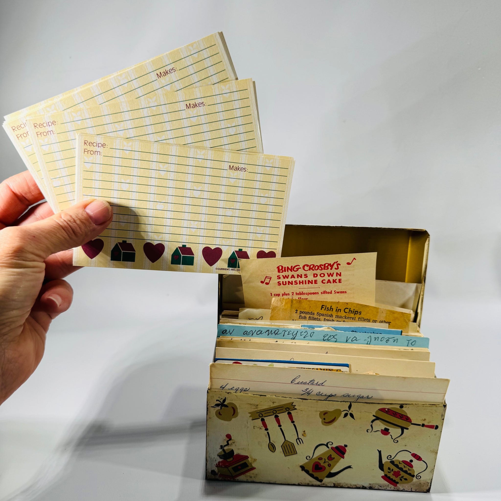 This small vintage Recipe Box & Culinary Ephemera set is basically a family kitchen archive you can hold in one hand. The cream metal tin is decorated with playful cookware motifs and the word “Recipes,” and it’s packed with assorted handwritten recipe cards, clipped recipes, and vintage food ads.