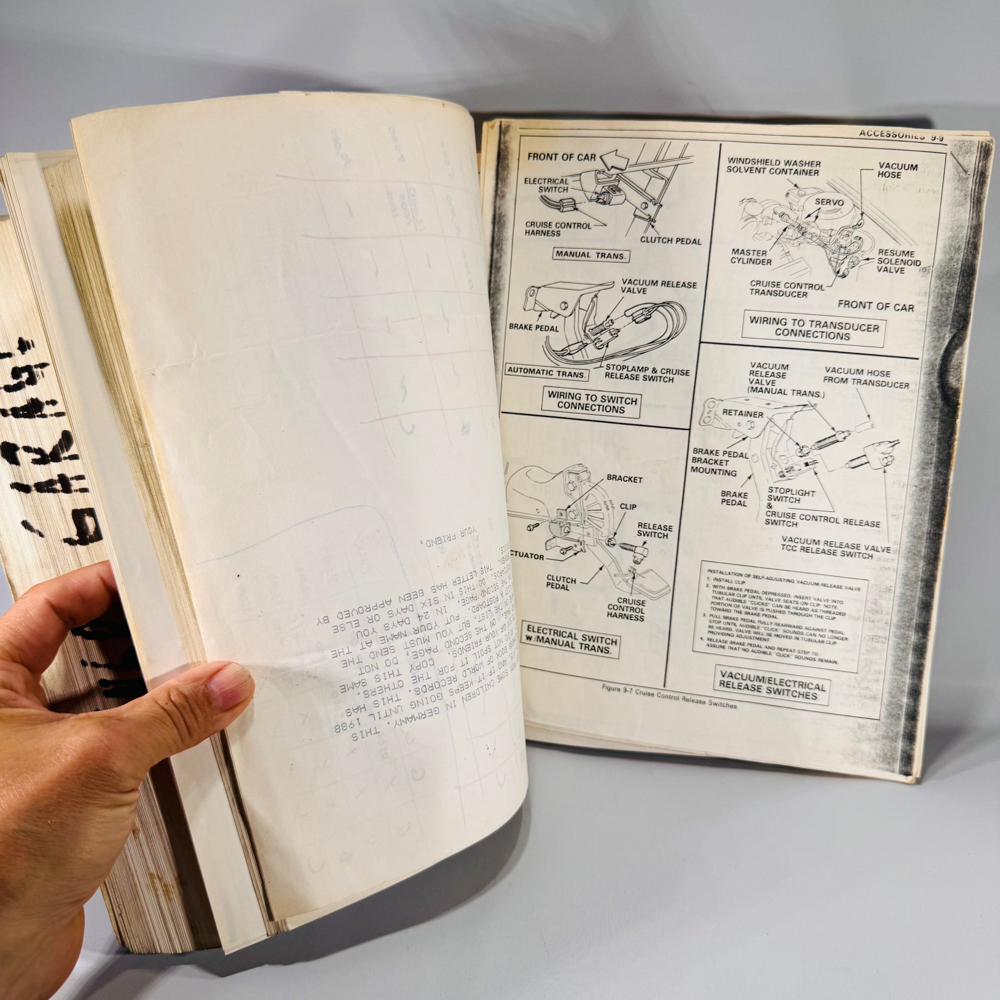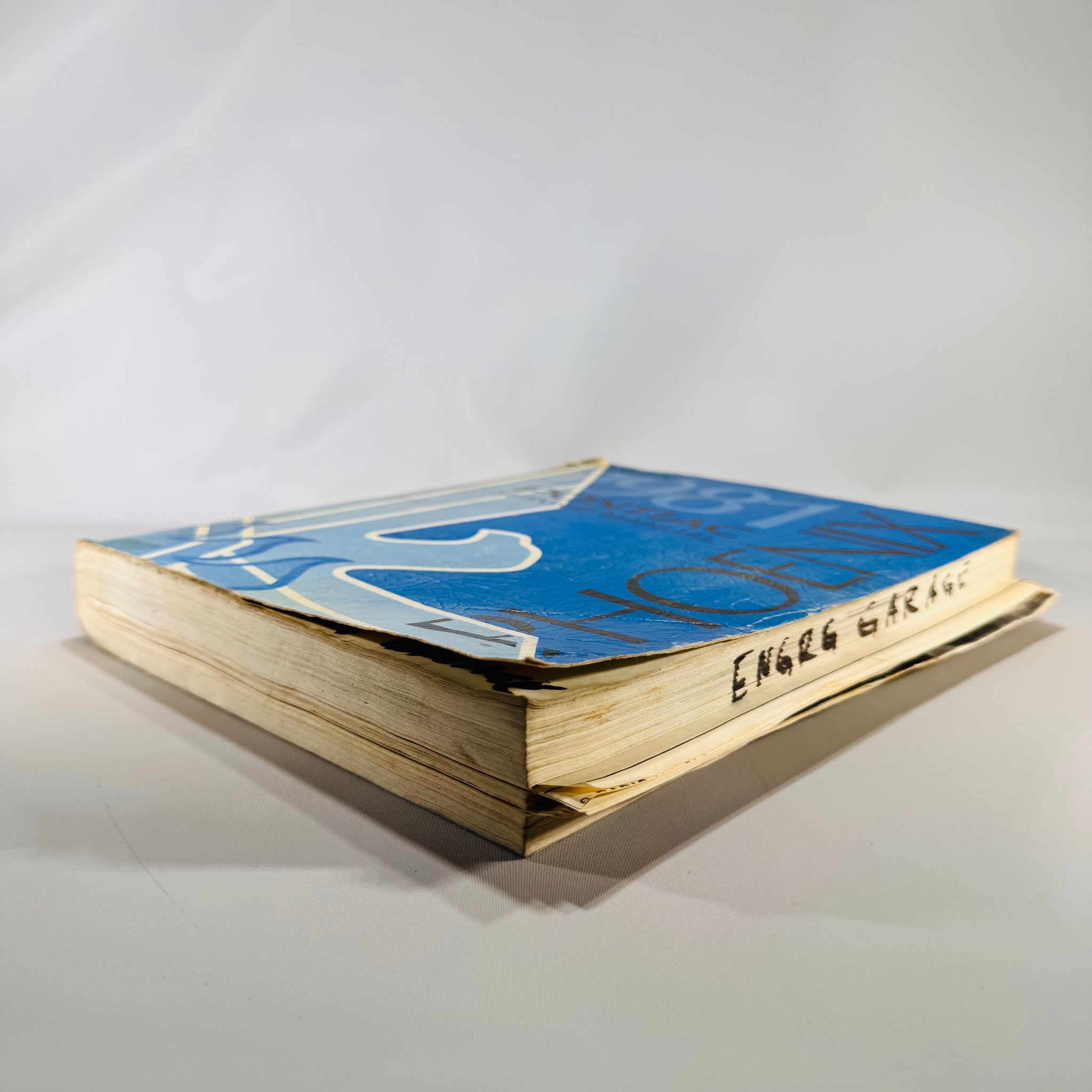 This manual has lived a life in the shop—visible wear on the cover, scuffing along the edges, page browning, and some handwritten markings inside. The spine is creased but intact. “ENGRG GARAGE” is written in marker along the page edges. Despite the cosmetic flaws, every page is legible and intact—ready for hands-on use in your garage.