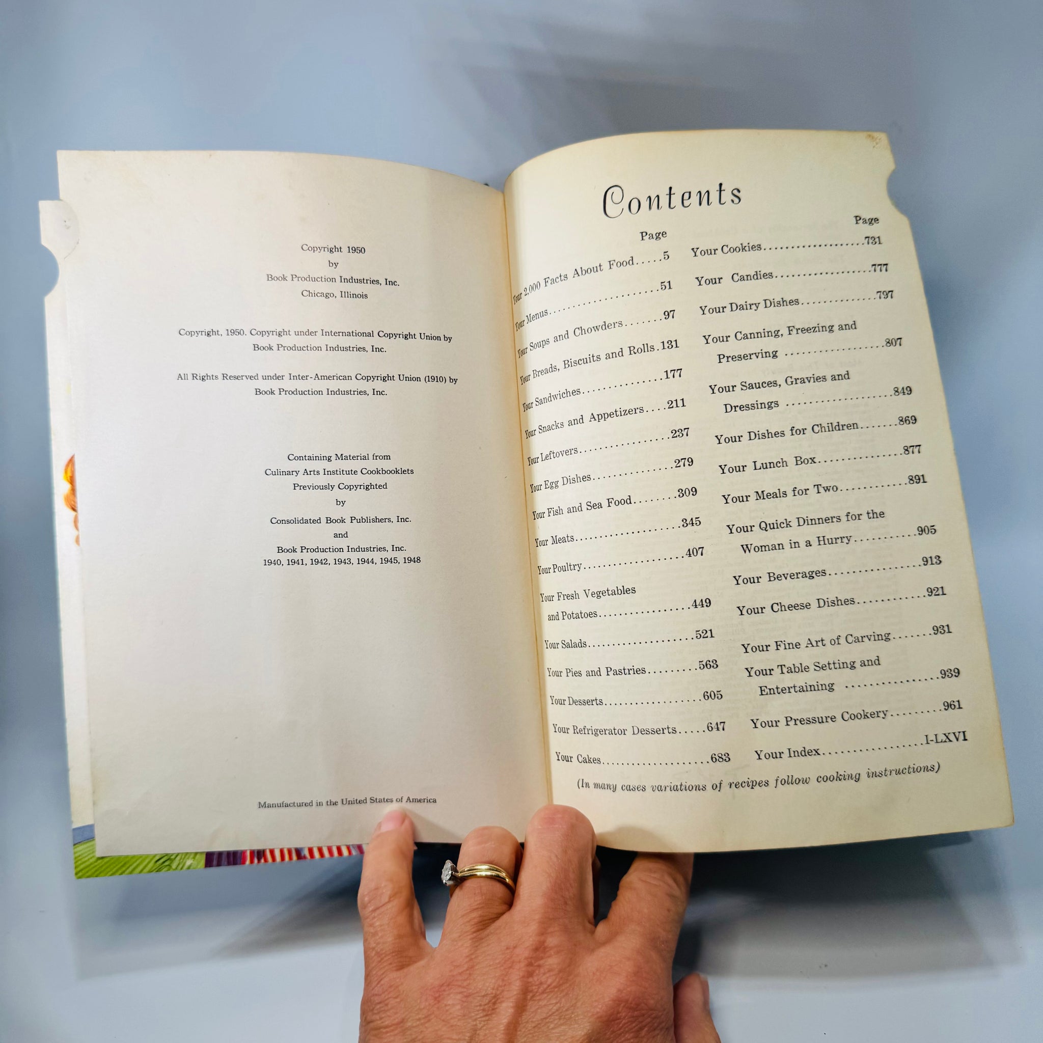 This is the kind of book you keep within arm’s reach—974 pages of practical recipes, menus, buying guides, and classic “how-to” instructions, organized with a built-in quick-reference index and thumb-cut section tabs for fast flipping.