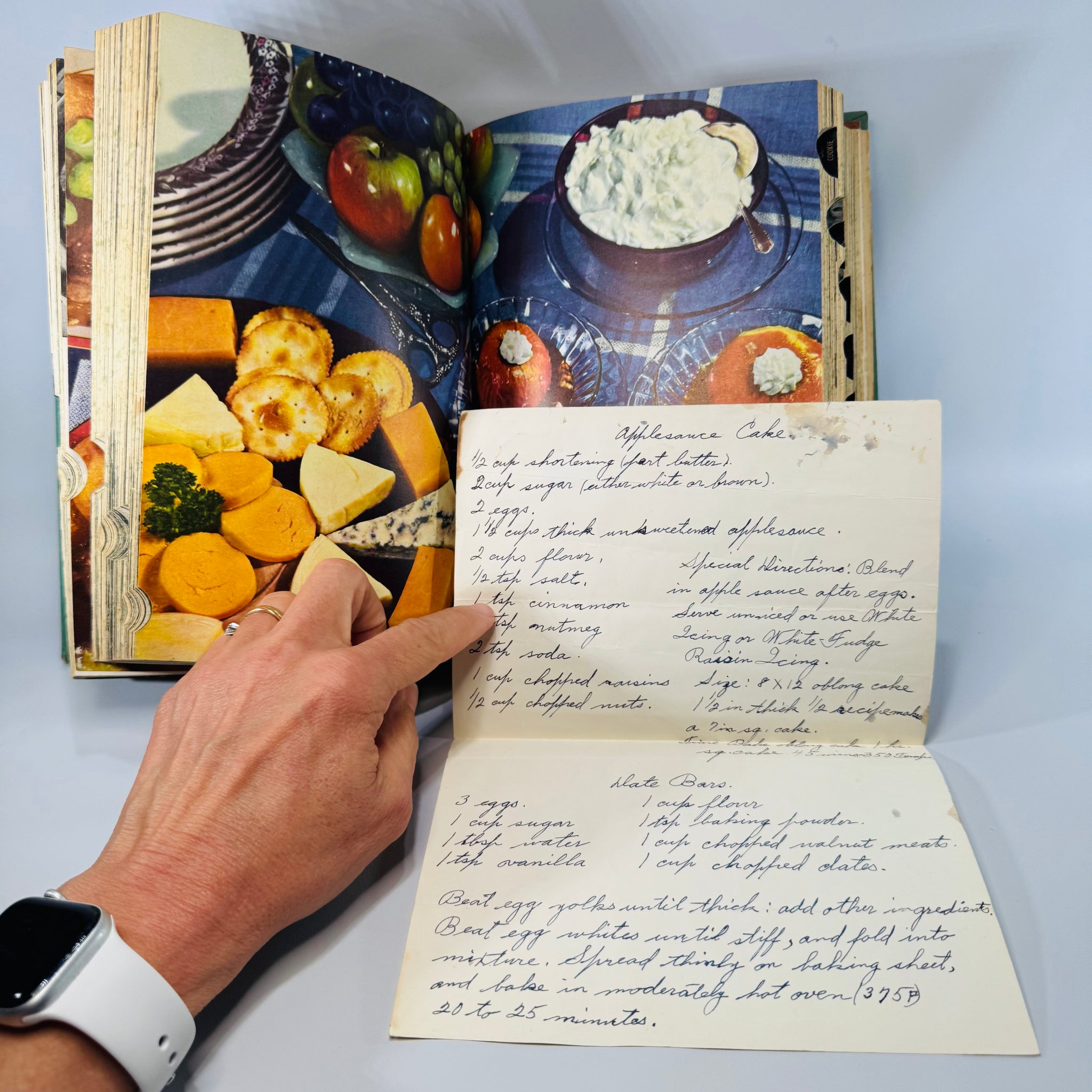 Notes: A solid, usable copy with visible age and kitchen-life wear. Cover shows rubbing, scuffs, and discoloration/spotting, including noticeable marks on the back board; light edge/corner wear. Pages show age toning; thumb-index cutouts are present as part of the book’s design. Handwritten recipe sheet/card shows staining/spotting (as pictured).