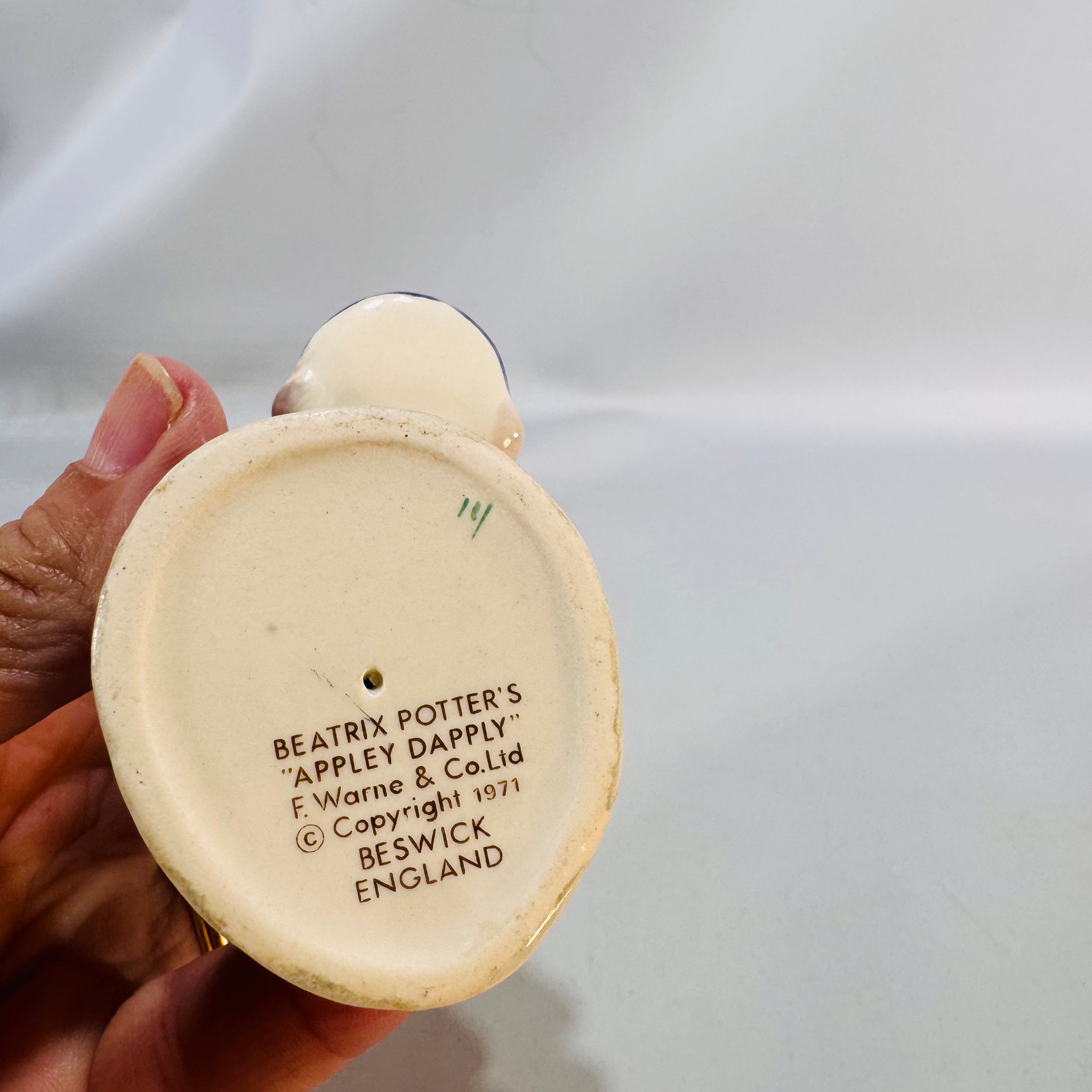 Estate-sourced Beswick Beatrix Potter figurine with clear 1971-copyright backstamp; glossy finish, honest condition, gift-ready.