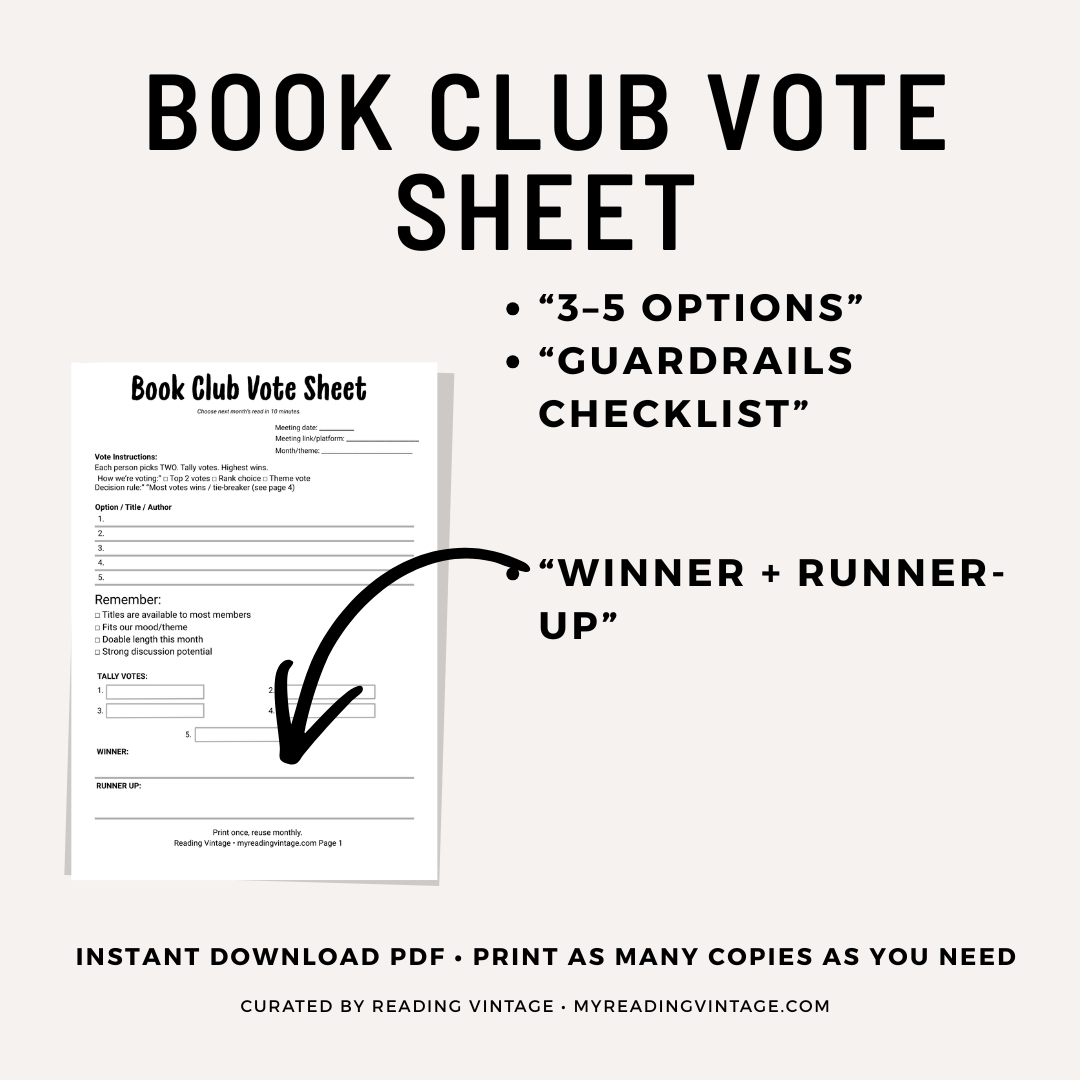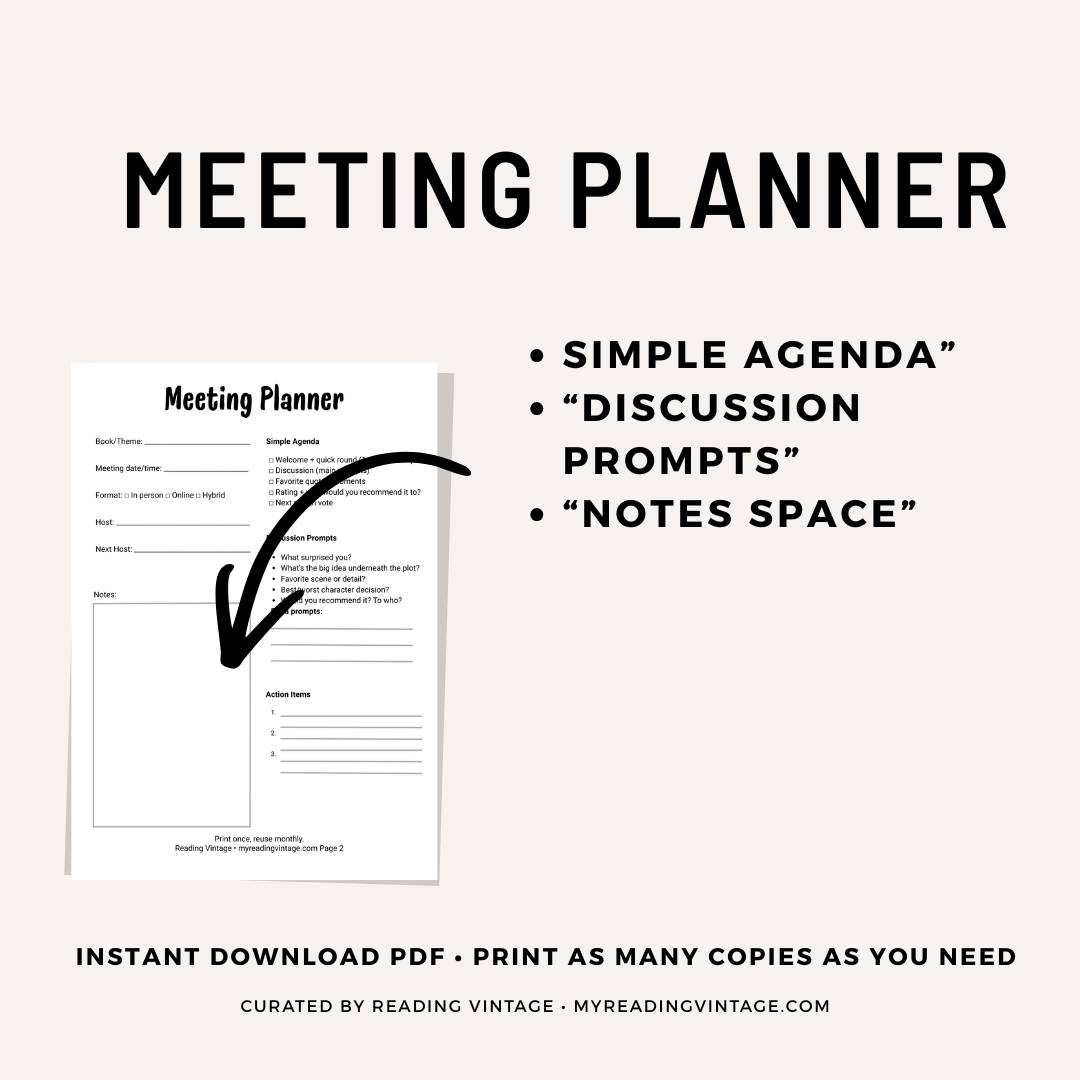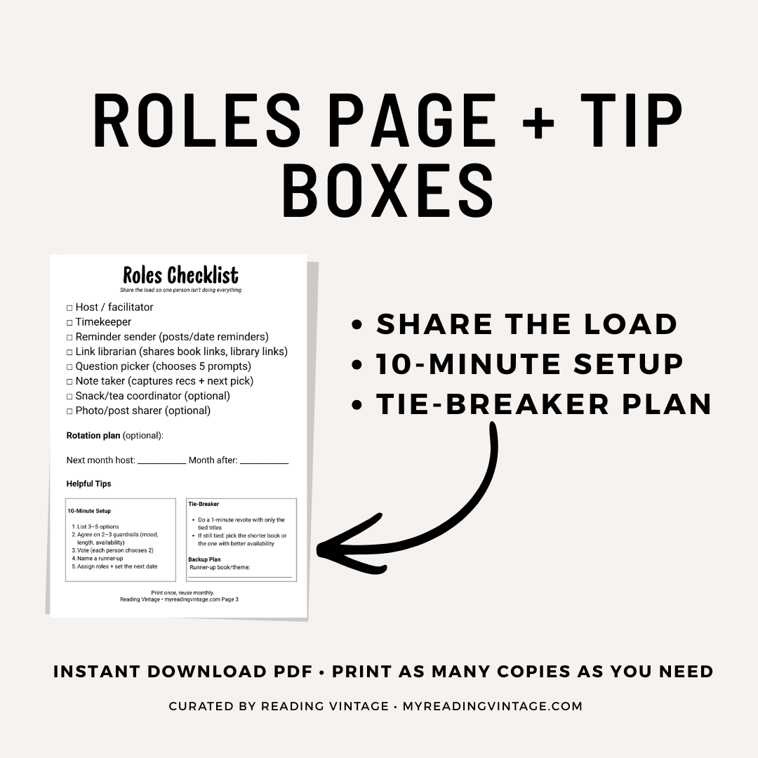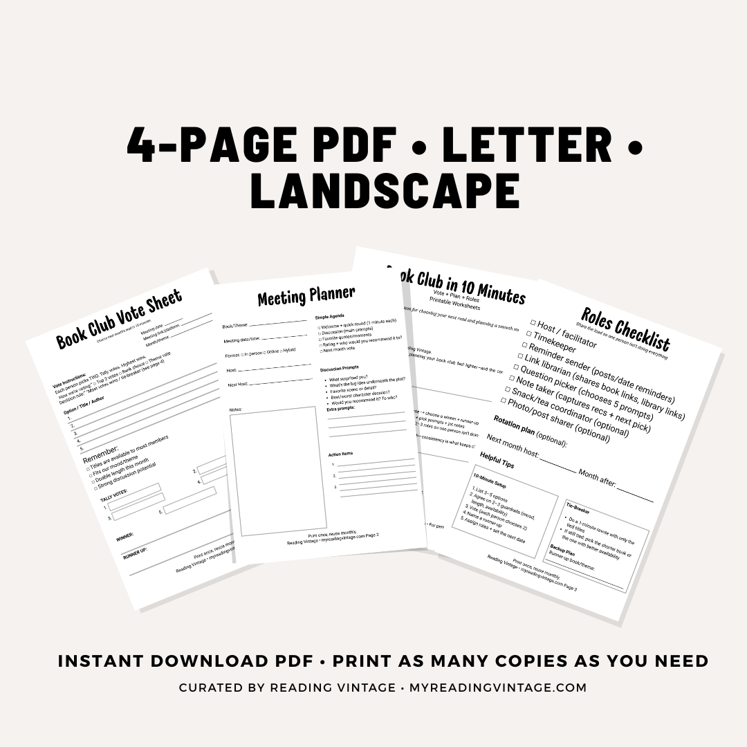 This minimalist 4-page printable helps you vote, plan a smooth meeting (or reading session), and share the load with simple roles.