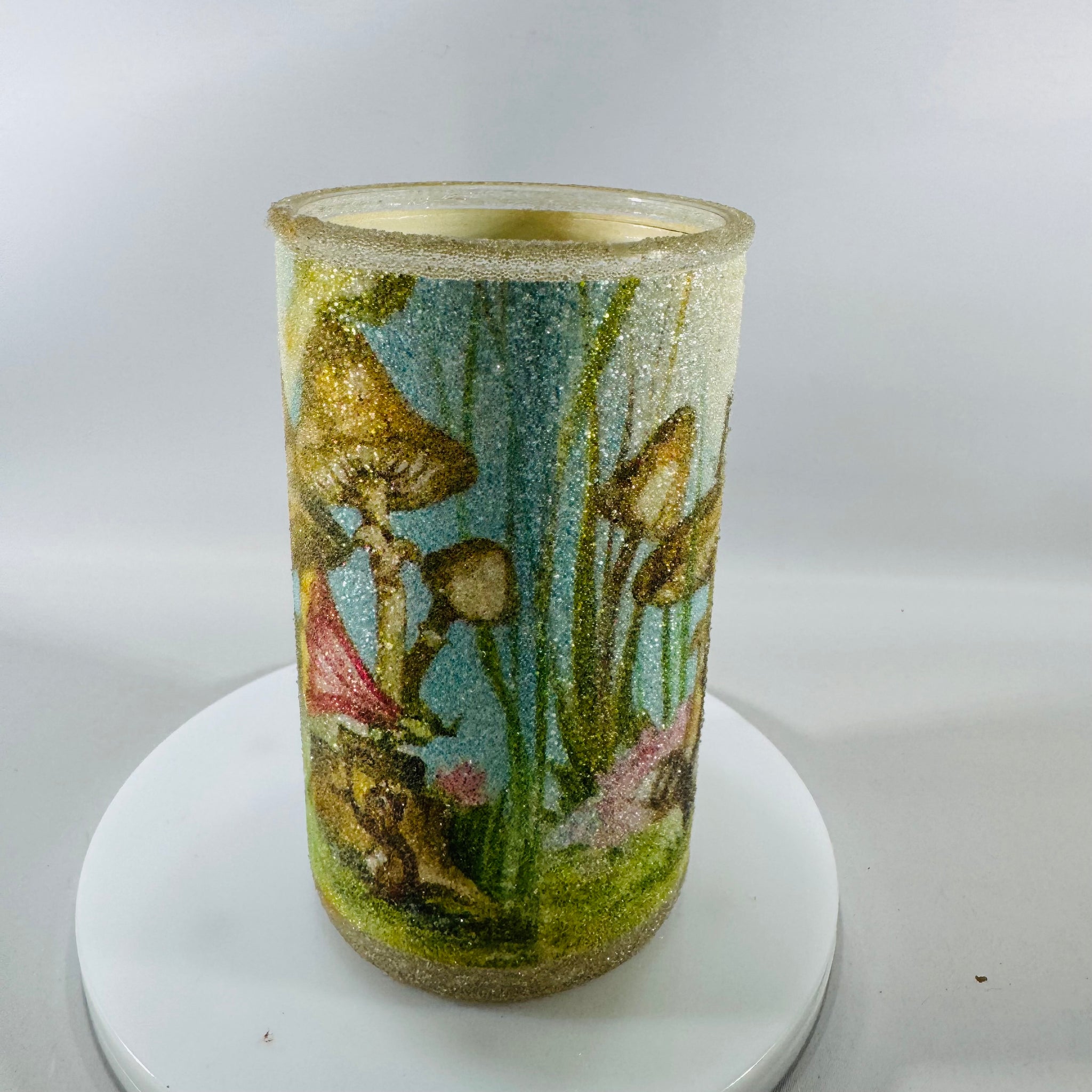 A sparkly little slice of 1980s nostalgia. This vintage glitter-textured glass votive features a sweet, storybook-style woodland scene and friendship wording, with the original wax still inside—perfect for collectors, shelf styling, or adding a cozy glow with a tea light.