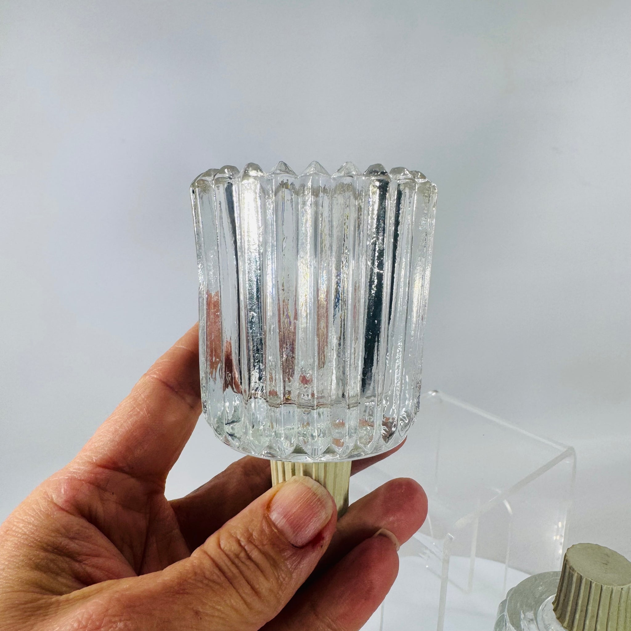 Add a classic Home Interiors look to your candle displays with this set of two vintage peg-style votive cups. These clear ribbed “tulip” cups are designed to insert into compatible candelabras and wall sconces using the peg base (with rubber grommet). A small detail that makes a big impact—especially for cozy, collected home décor.