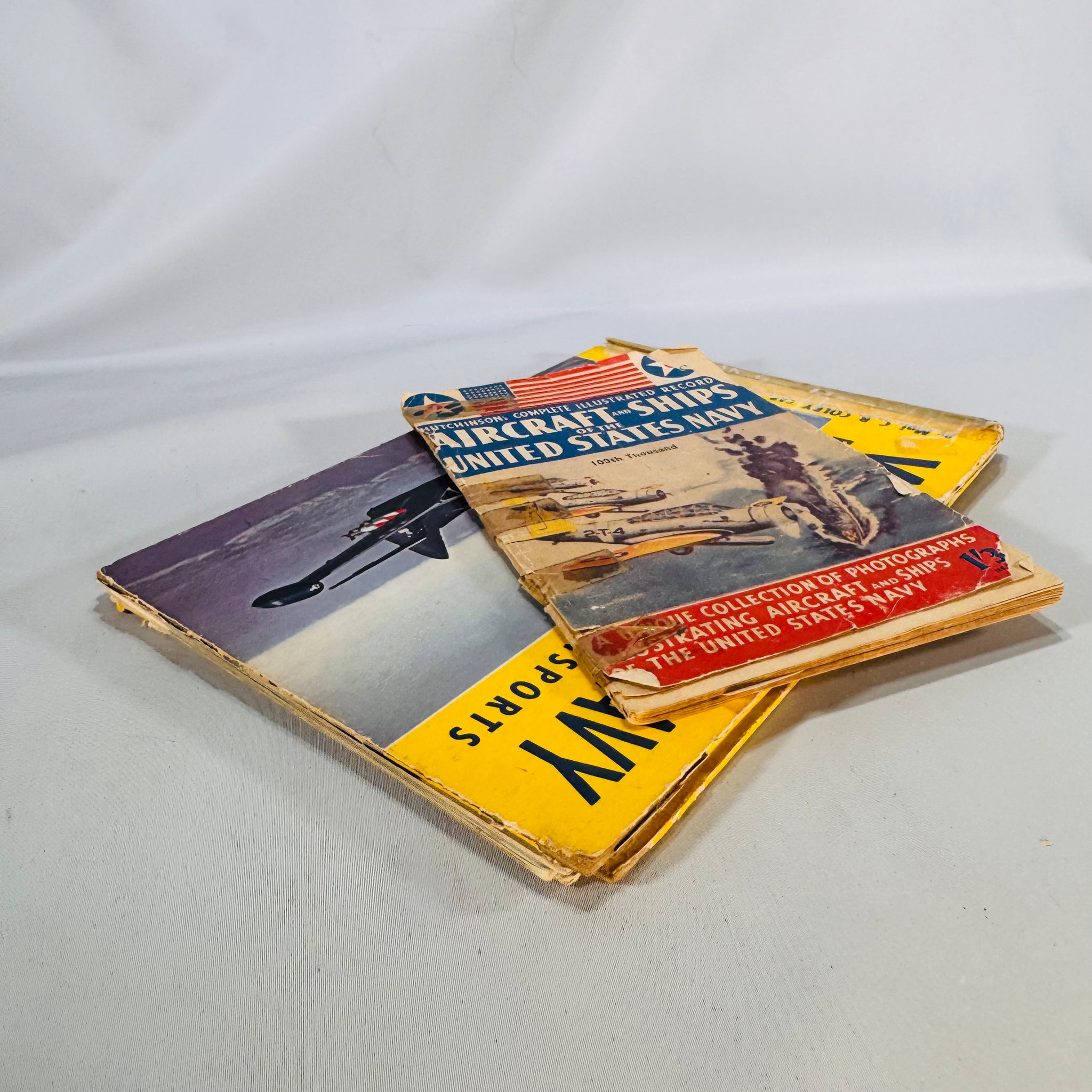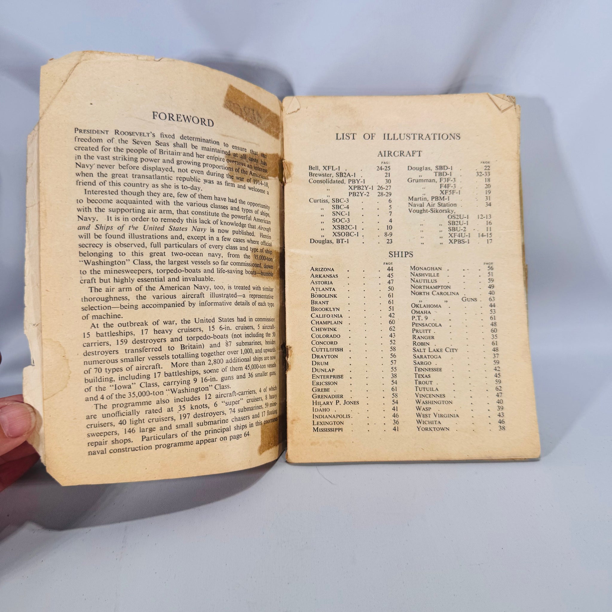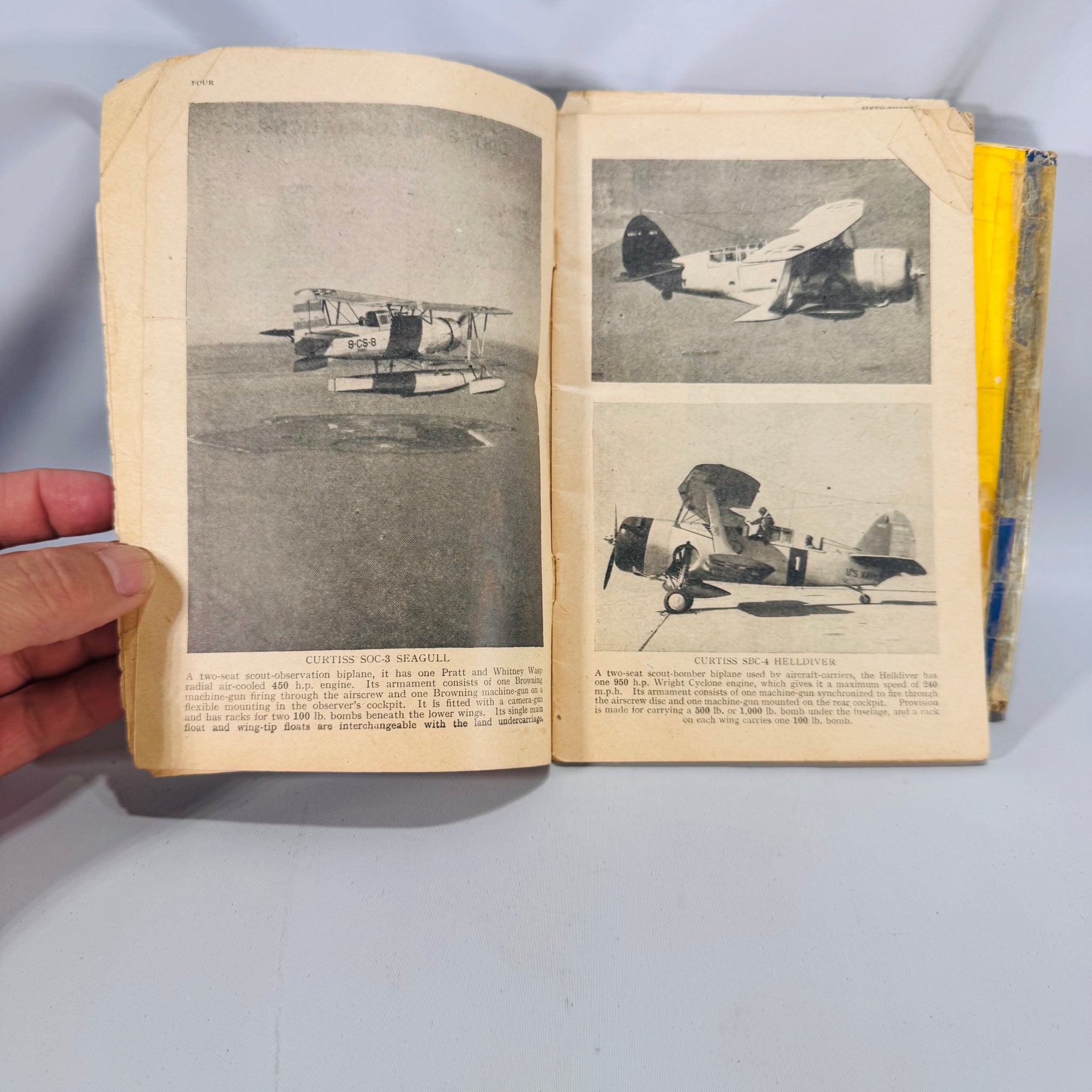The Hutchinson wartime booklet lists U.S. Navy aircraft and ship classes with dozens of small photo plates—a classic home-front reference. Both are well-worn, taped, and incomplete in places, but still useful as reading/ID copies and worth saving from the bin.