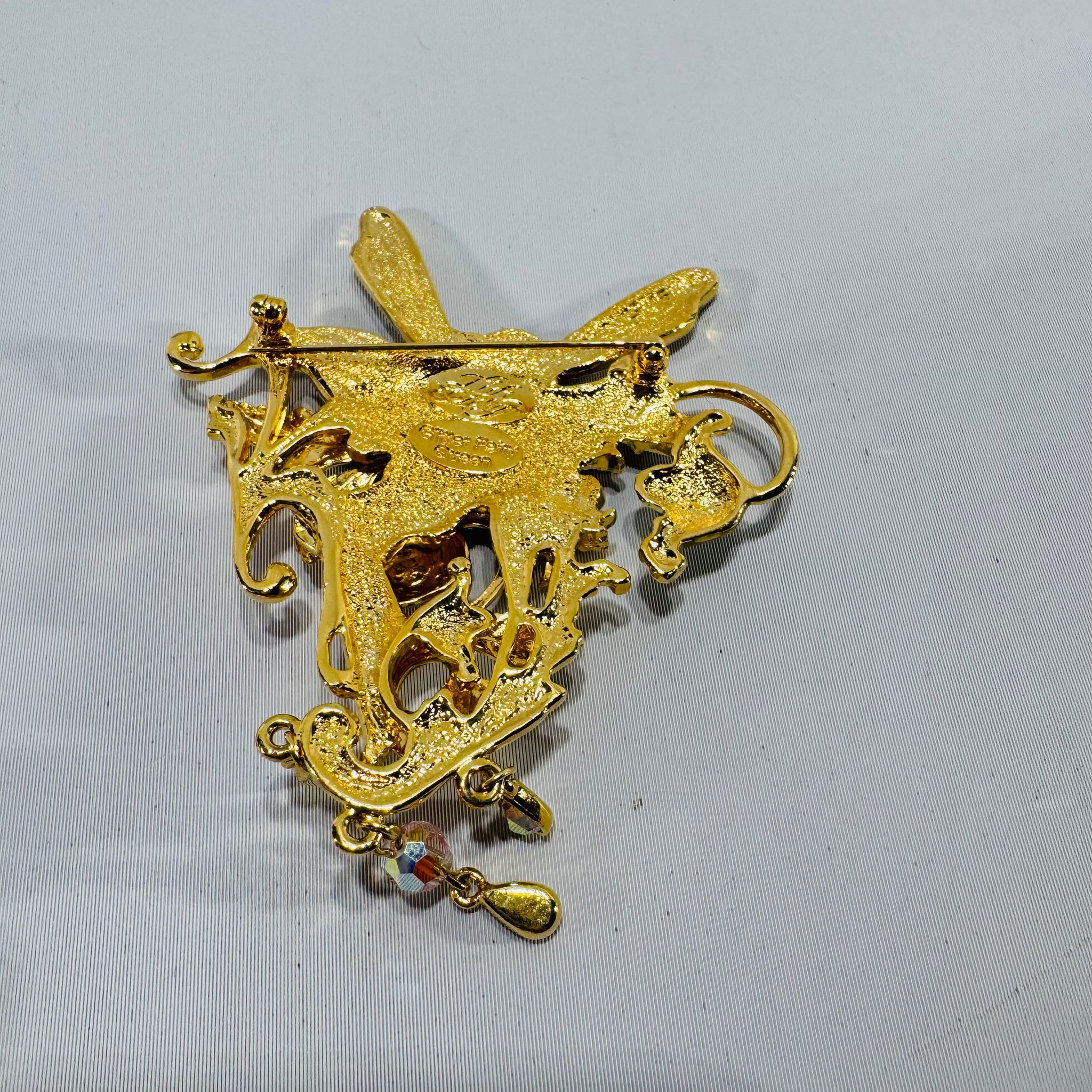 ∙ Back/Hardware: pin back appears secure and functional (shown), pendant loop present