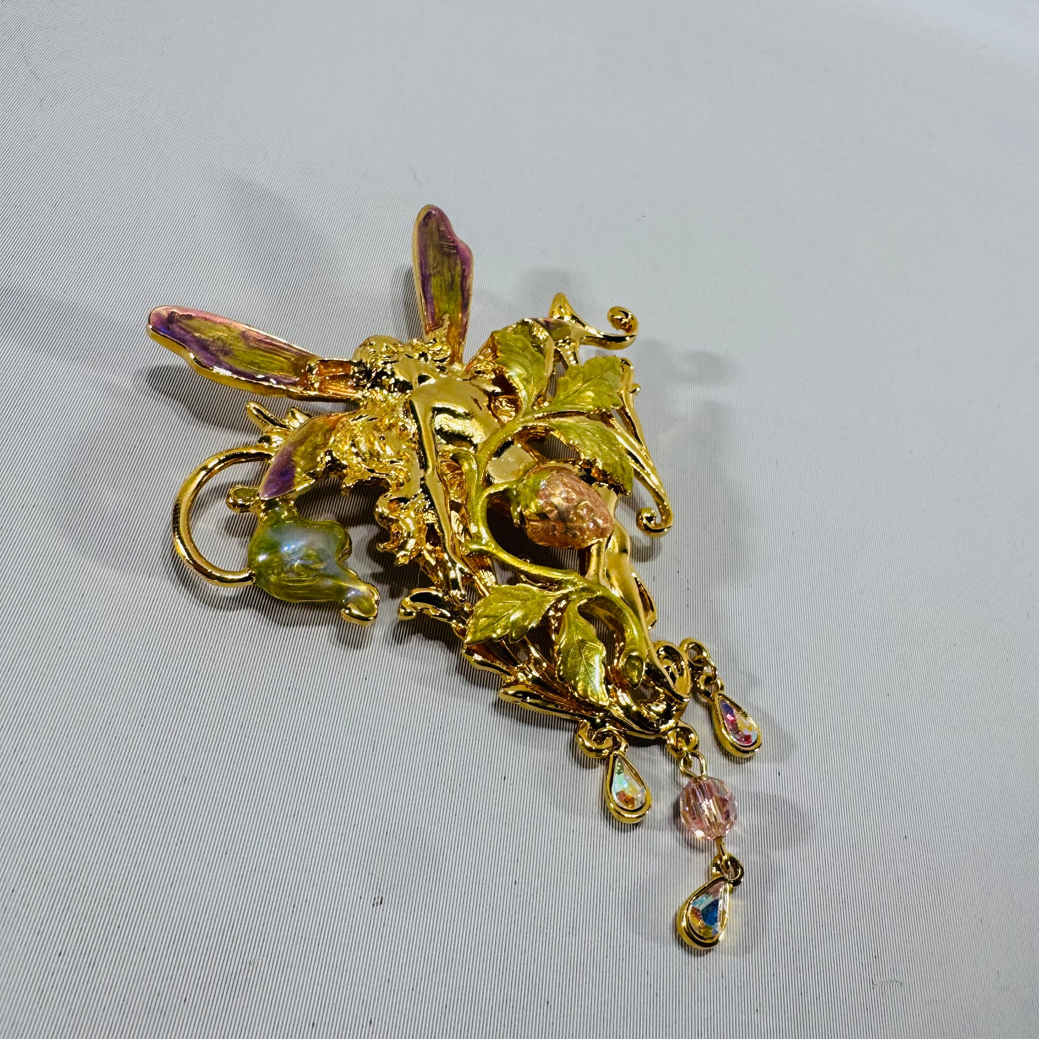 The fairy sits among curling vines and leaves with a textured strawberry detail, iridescent enamel wings (pink/purple shift), and dangling AB teardrop charms plus a faceted bead that catches light as you move. Classic Kirk’s Folly whimsy—shelf-worthy and wearable.