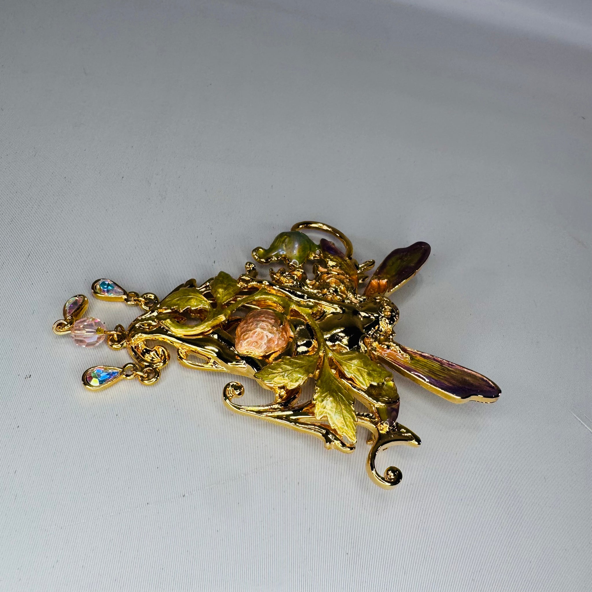 ∙ Enamel accents: soft green leaves + iridescent wing enamel