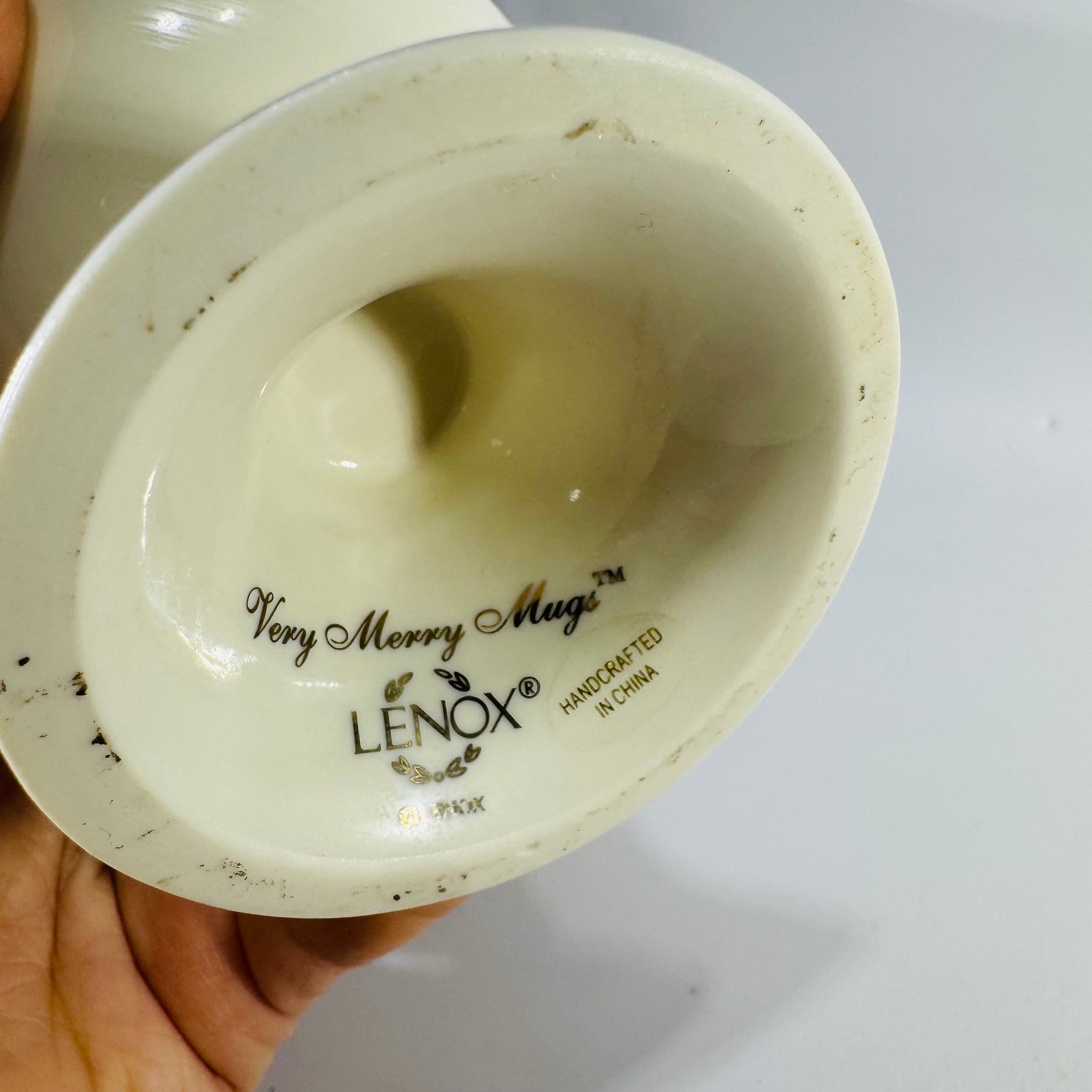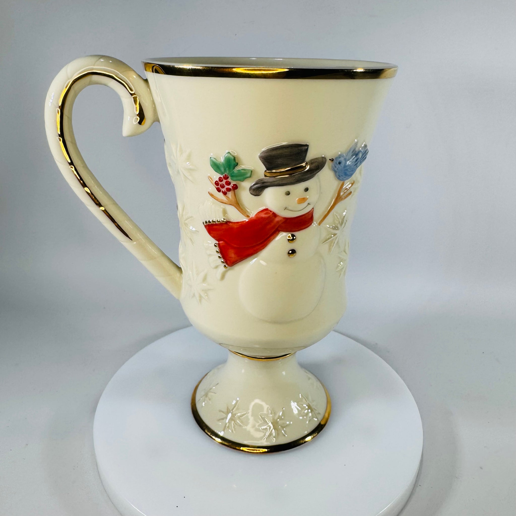 Cozy Lenox “Very Merry” snowman mug with gold trim and sculpted snowflakes—16 oz pedestal cup that feels festive without being fussy.
