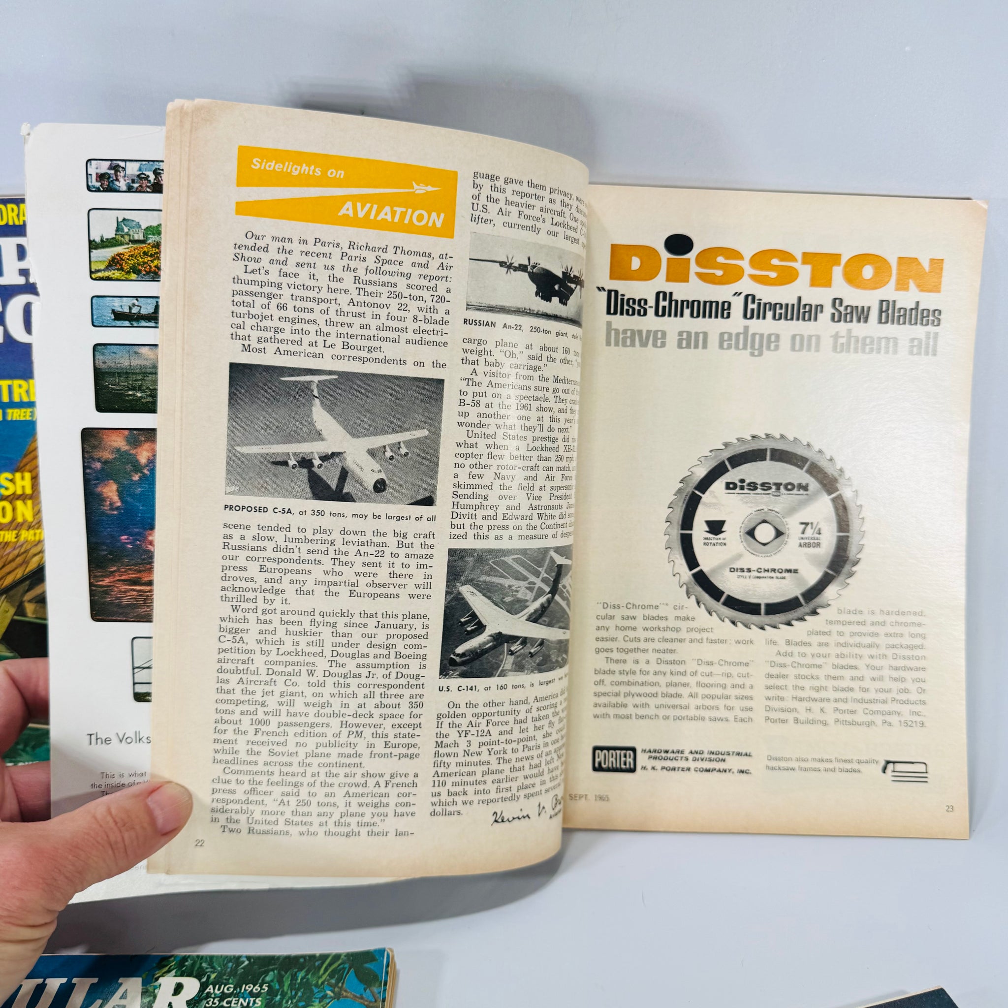 A sharp mid-century Popular Mechanics bundle featuring four original 1965 issues—June, August, September, and December—packed with DIY projects, Cold War technology, family builds, and iconic American advertising. These issues capture the optimism of the Space Race era, when backyard projects, robotics, and home improvement felt futuristic and achievable.