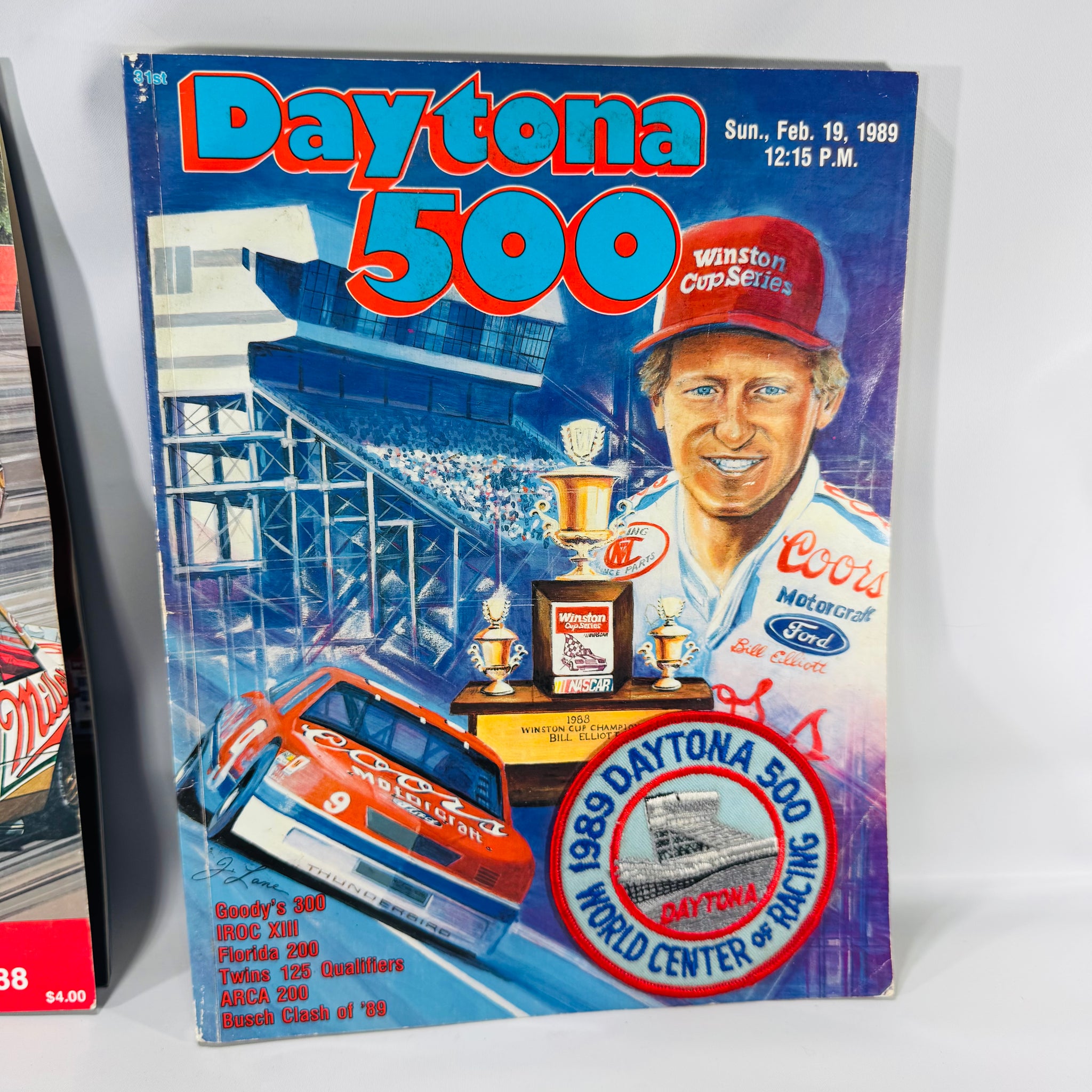 Two original late-80s NASCAR race programs in one collectible lot: Michigan International Speedway (MIS) 1988 and Daytona 500 1989.