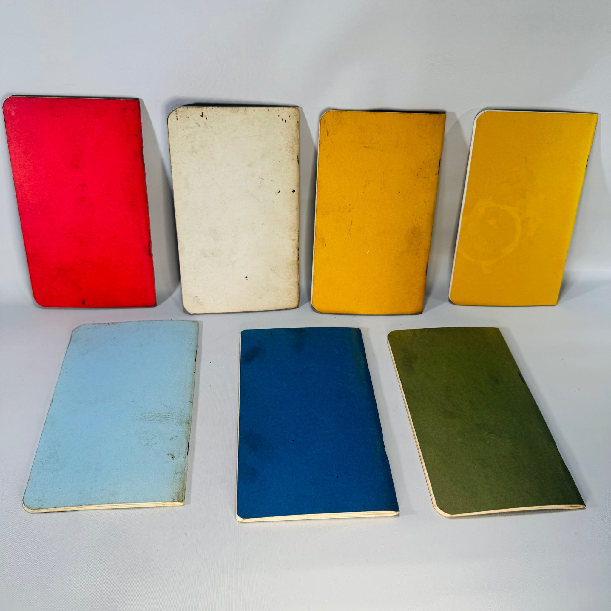 Notes: Honest shop/garage wear throughout—surface soiling, scuffs, rubbed corners/edges, and handling creases. Covers show grime and age toning; some covers have handwriting as noted.