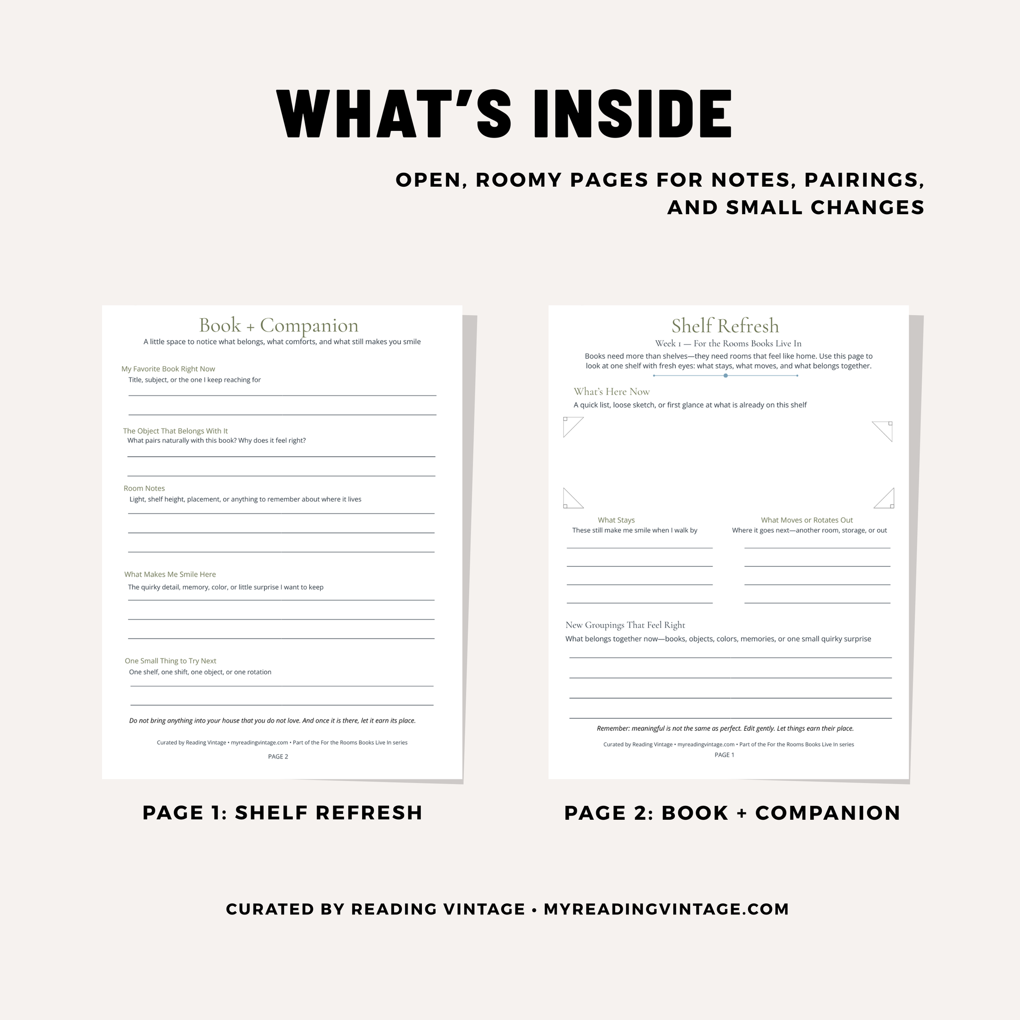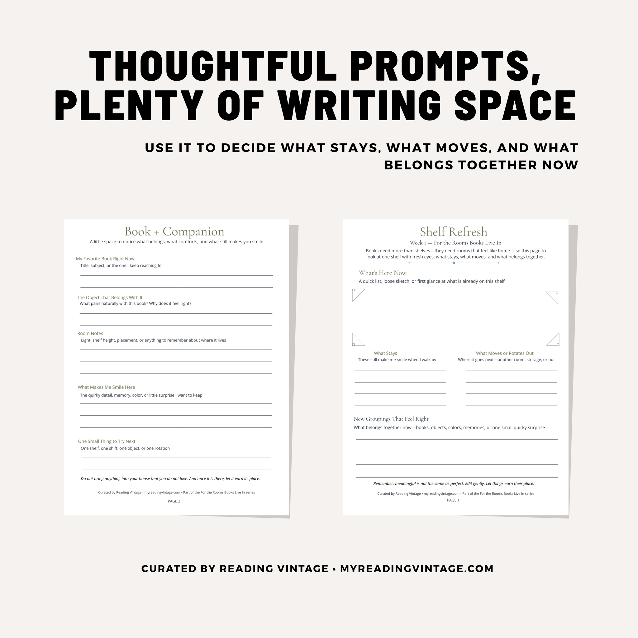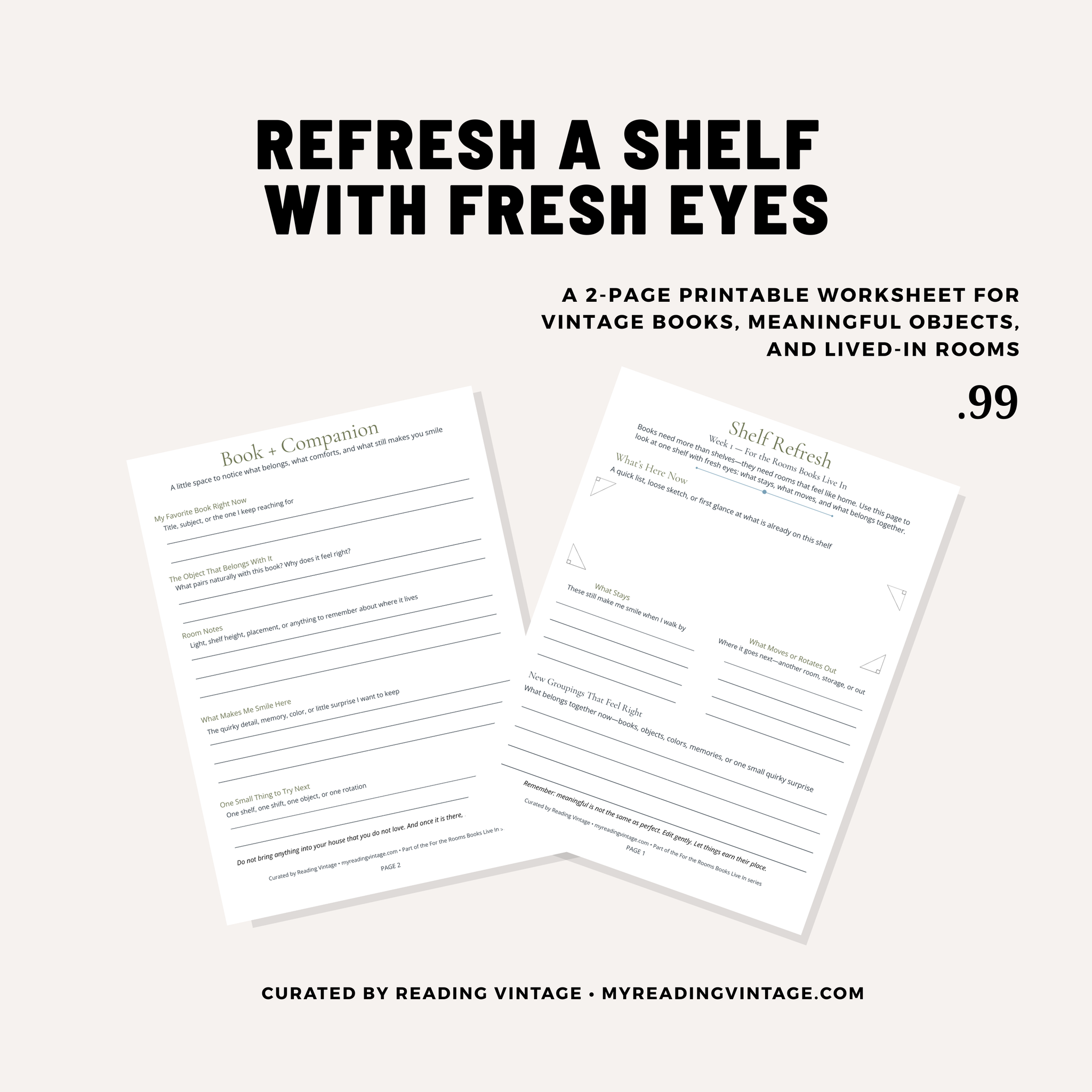A gentle 2-page printable for readers and collectors who want to refresh one shelf at a time.